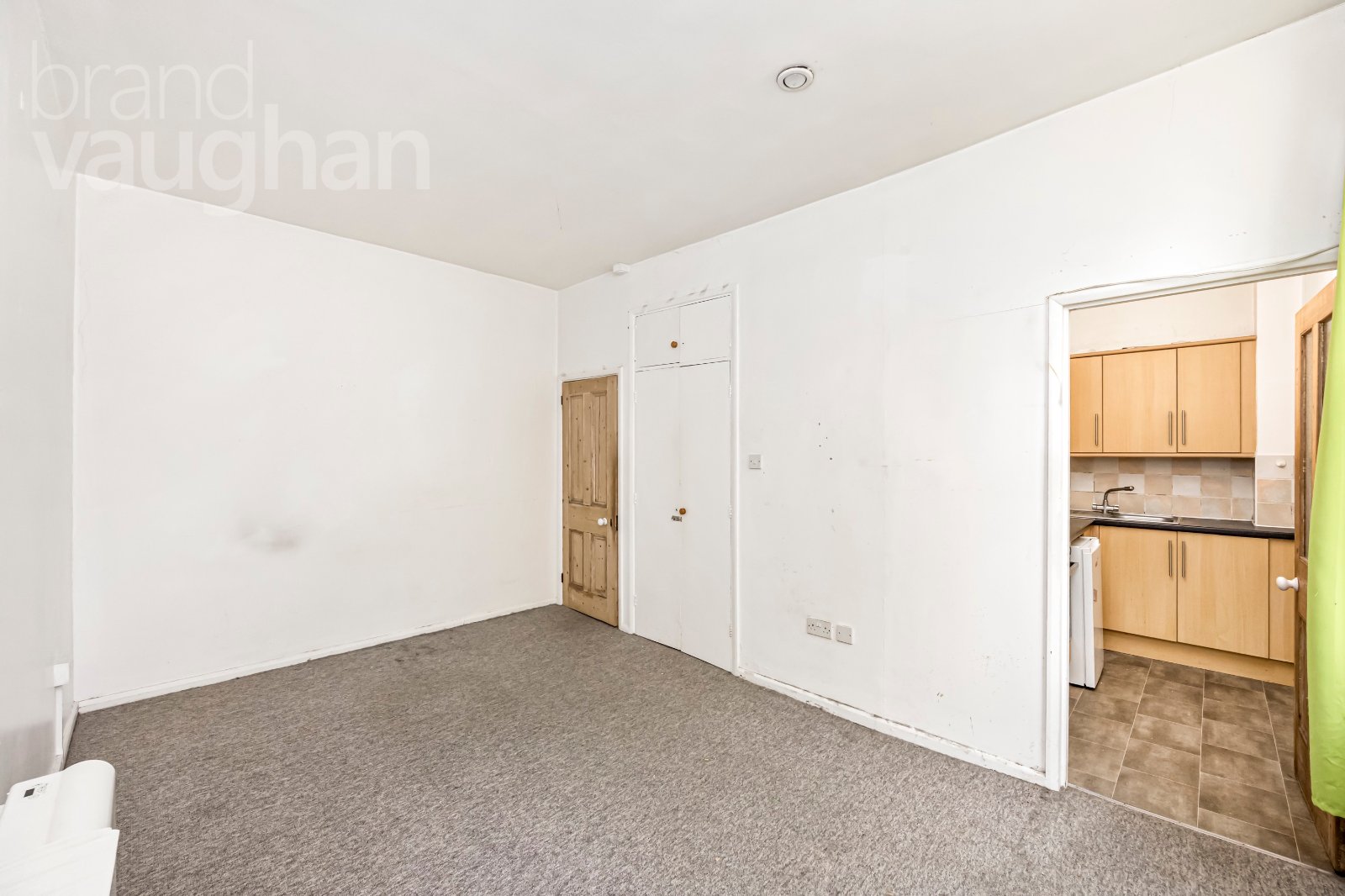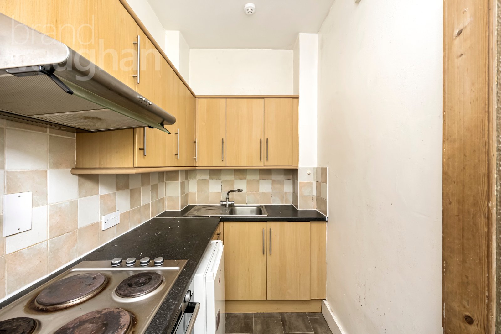 The separate kitchen is neatly arranged and fitted with wood-effect cabinetry, black worktops and tiled splashbacks, with space for essential appliances including a cooker, and under-counter fridge. While functional, there is clear potential to modernise and personalise this space.
