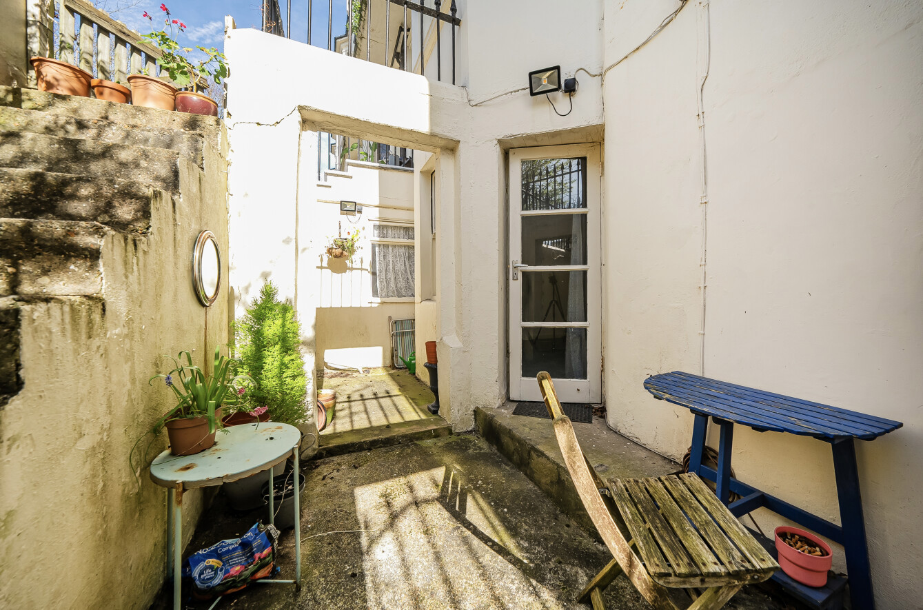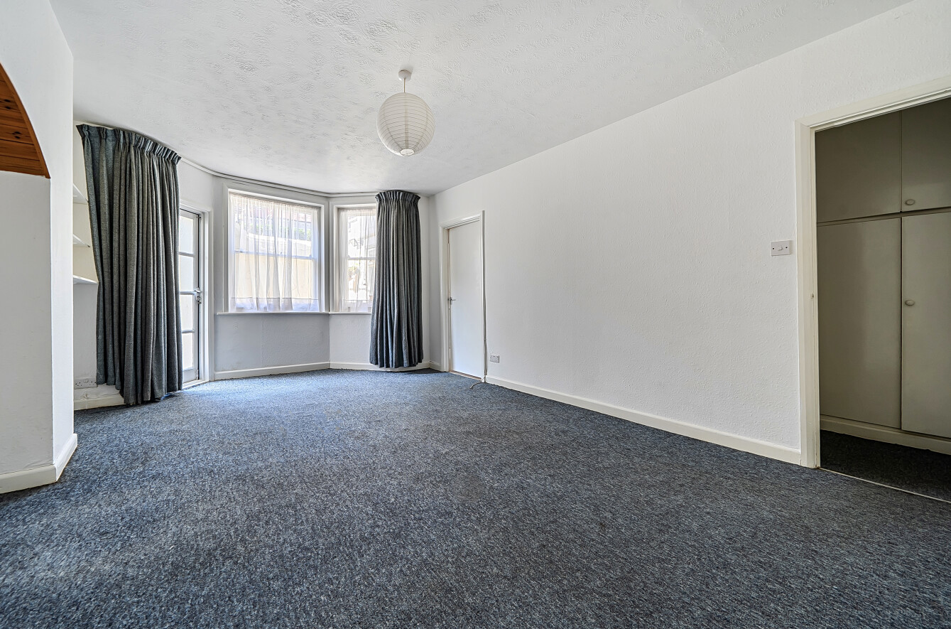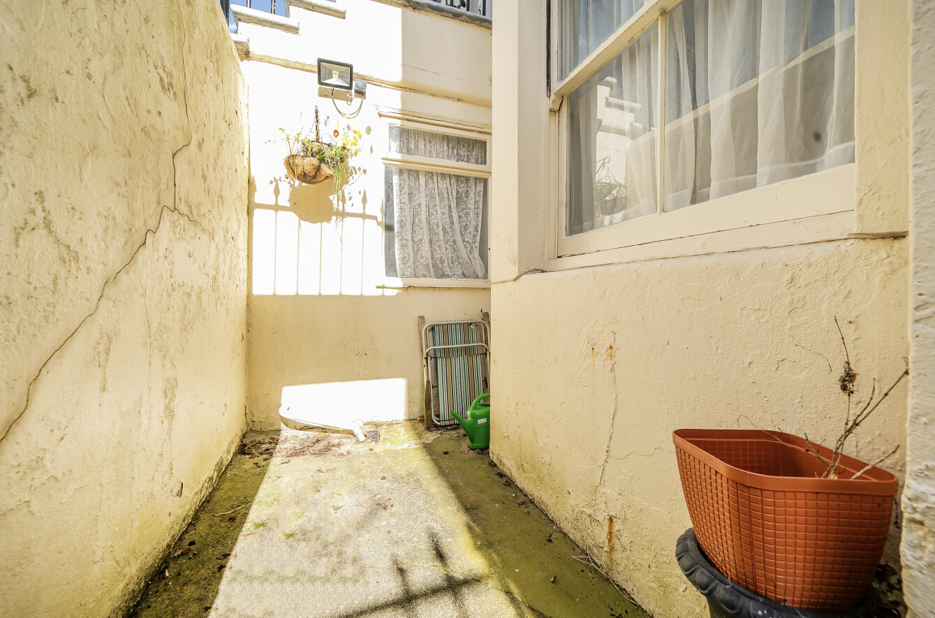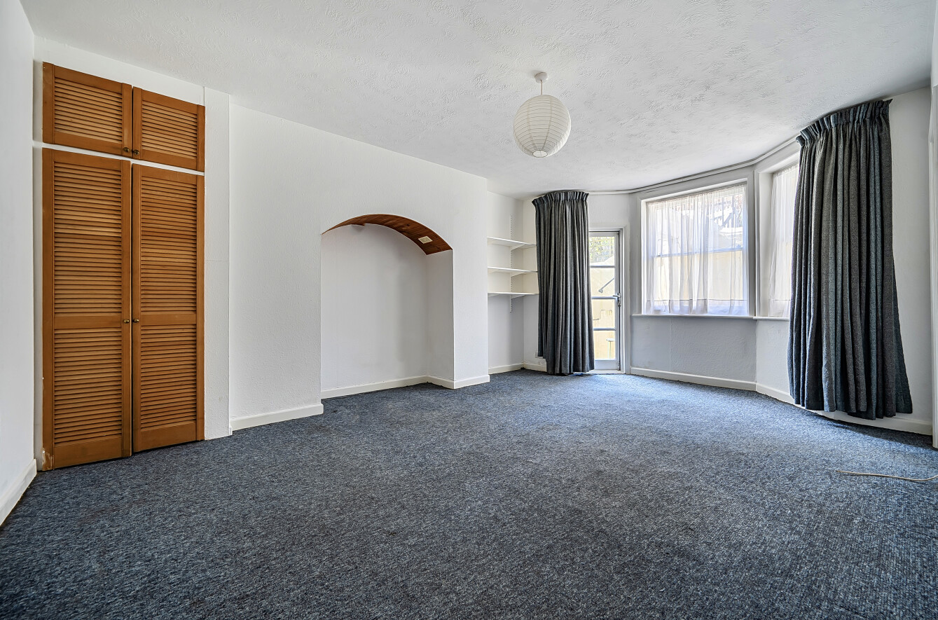 Occupying the lower ground floor, the property features a generously sized studio room measuring approximately 18'1 x 12'9, flooded with natural light through a large bay window. While the apartment is in need of some modernisation, it presents excellent potential to personalise and add value.