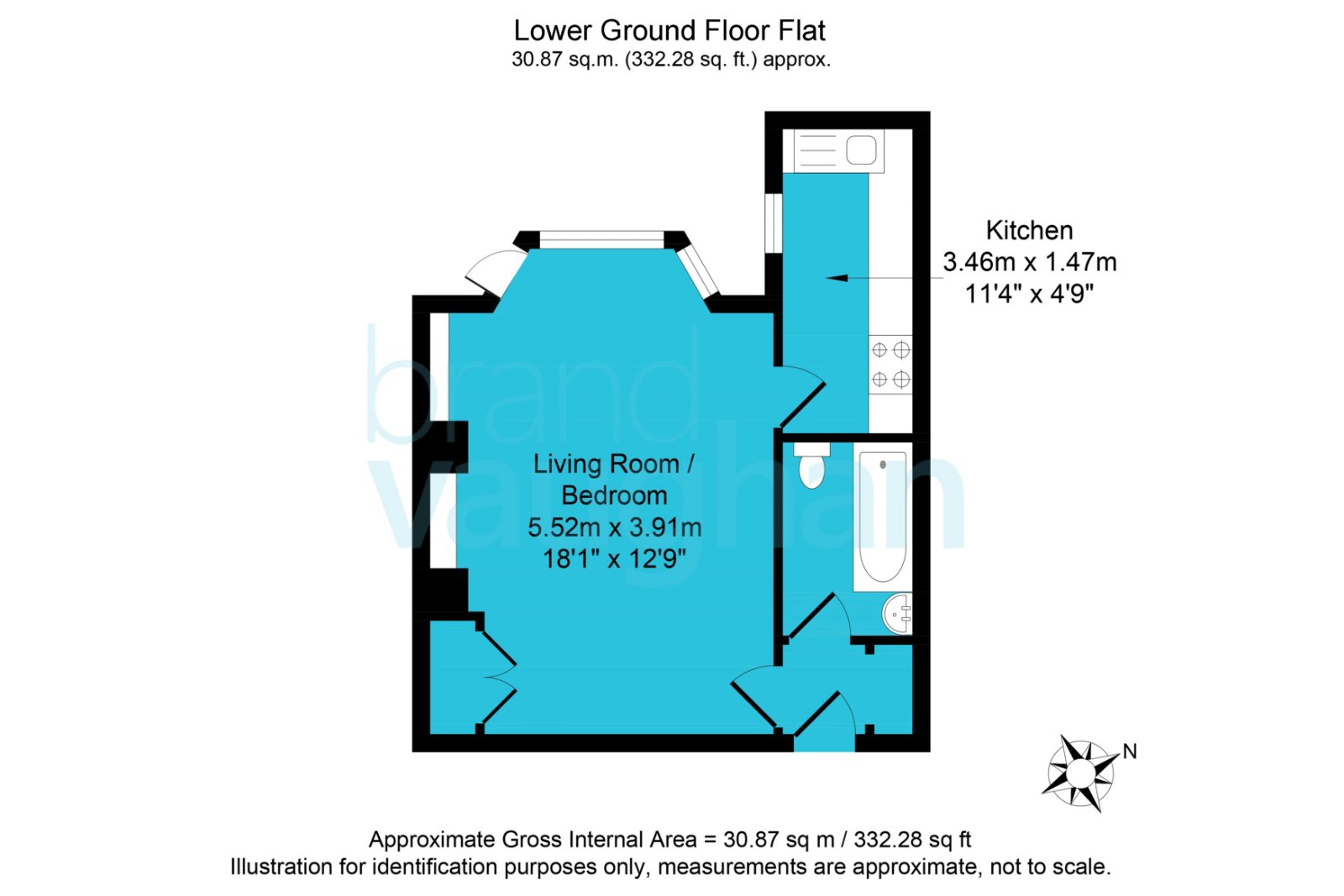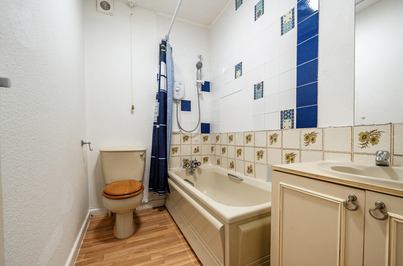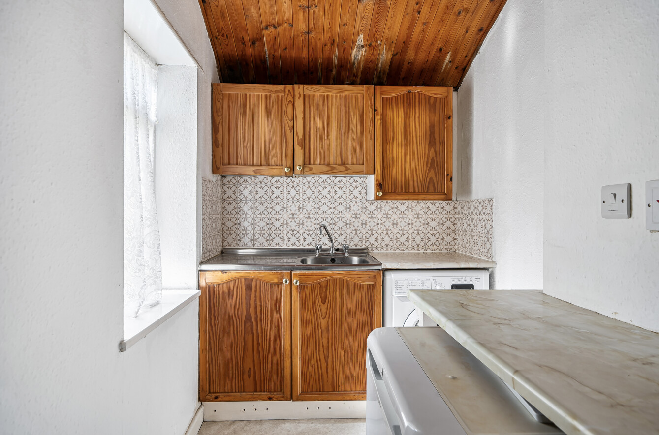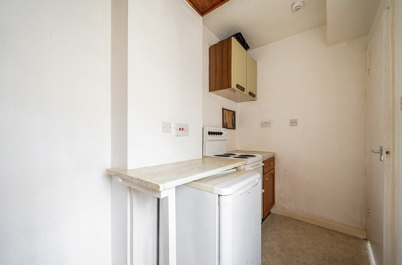 Occupying the lower ground floor, the property features a generously sized studio room measuring approximately 18'1 x 12'9, flooded with natural light through a large bay window. While the apartment is in need of some modernisation, it presents excellent potential to personalise and add value.