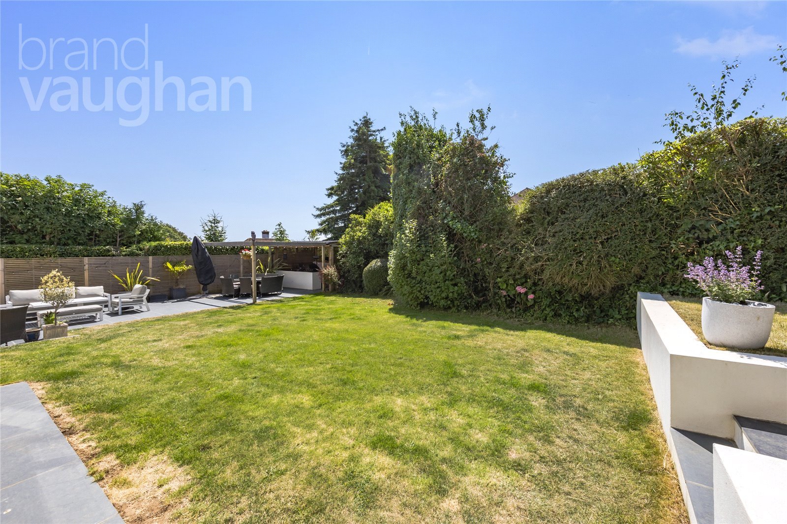 Looking over a large flat lawn, a series of slate terraces with inset LED lighting offer both sun and shade as the far end is sheltered from the mid-summer sun beneath a gazebo. By it, the fabulous kitchen is under cover with slate surfaces, plenty of storage and power for fridges/music, and it comes with an Alfa wood burning pizza oven and built in bbq.