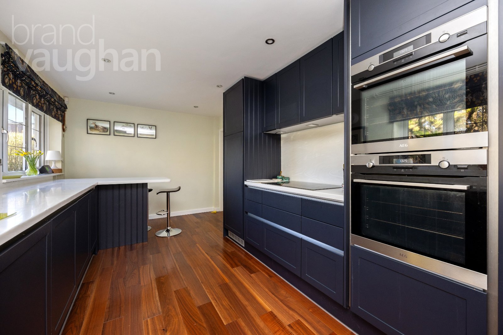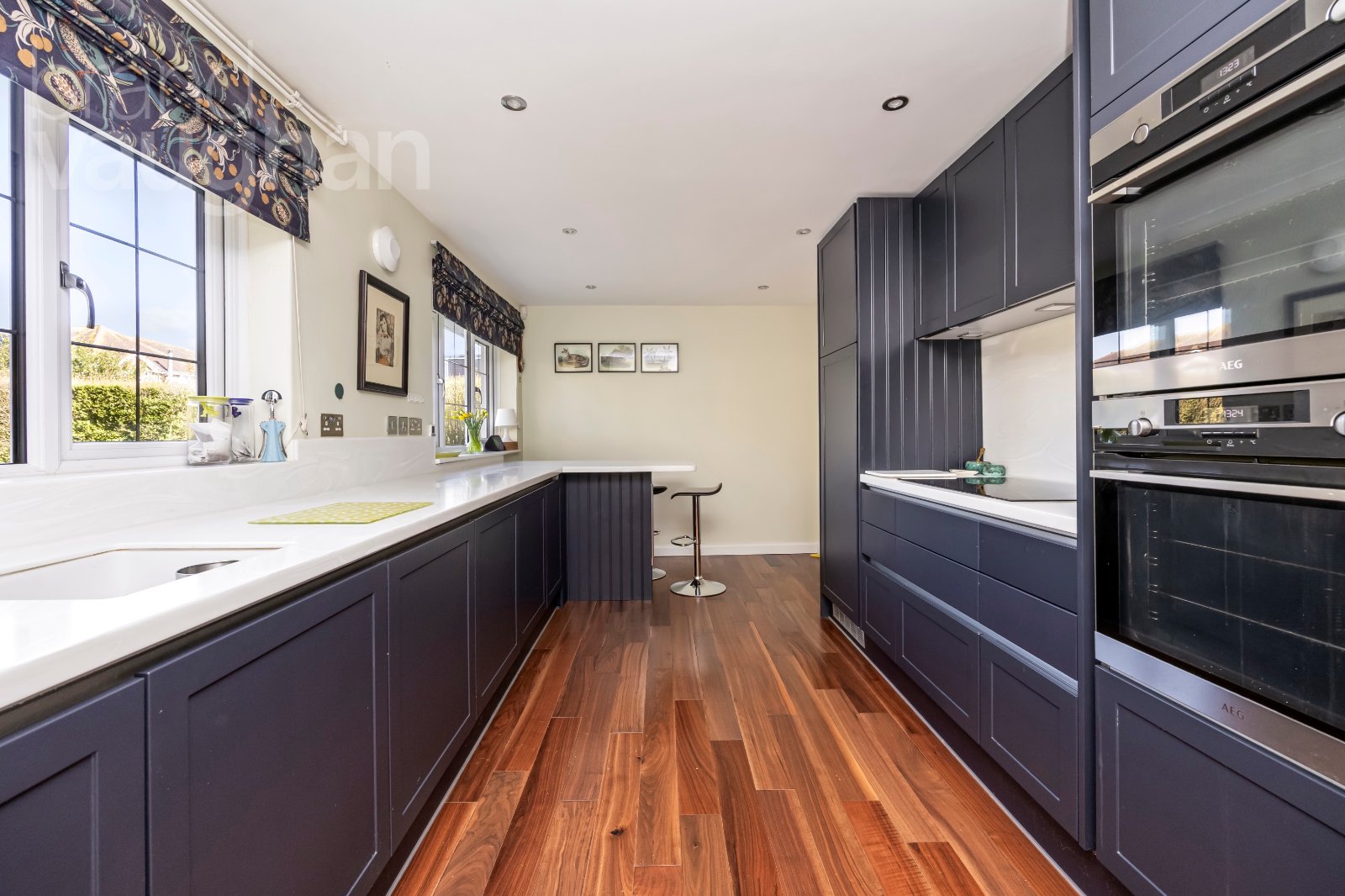 At the heart of the home, the streamlined kitchen is a study of efficient planning and delivers plenty of sophisticated storage. Hygienic Corian work surfaces also look great beneath a choice of lighting levels and also top a sociable breakfast bar (with a wine cooler built in) at the far end. Perfect for every day, but also for parties, high spec appliances include an AEG touch induction hob, twin ovens, a microwave, a full height fridge, an undercounter freezer, and a ‘Kettle’ tap– and both a walk in larder and separate cupboard keep surfaces uncluttered.