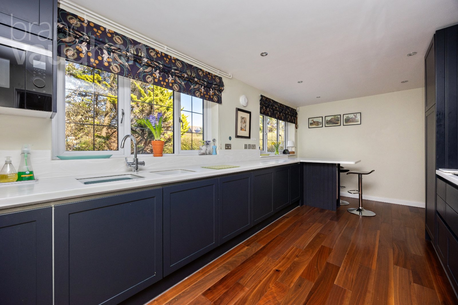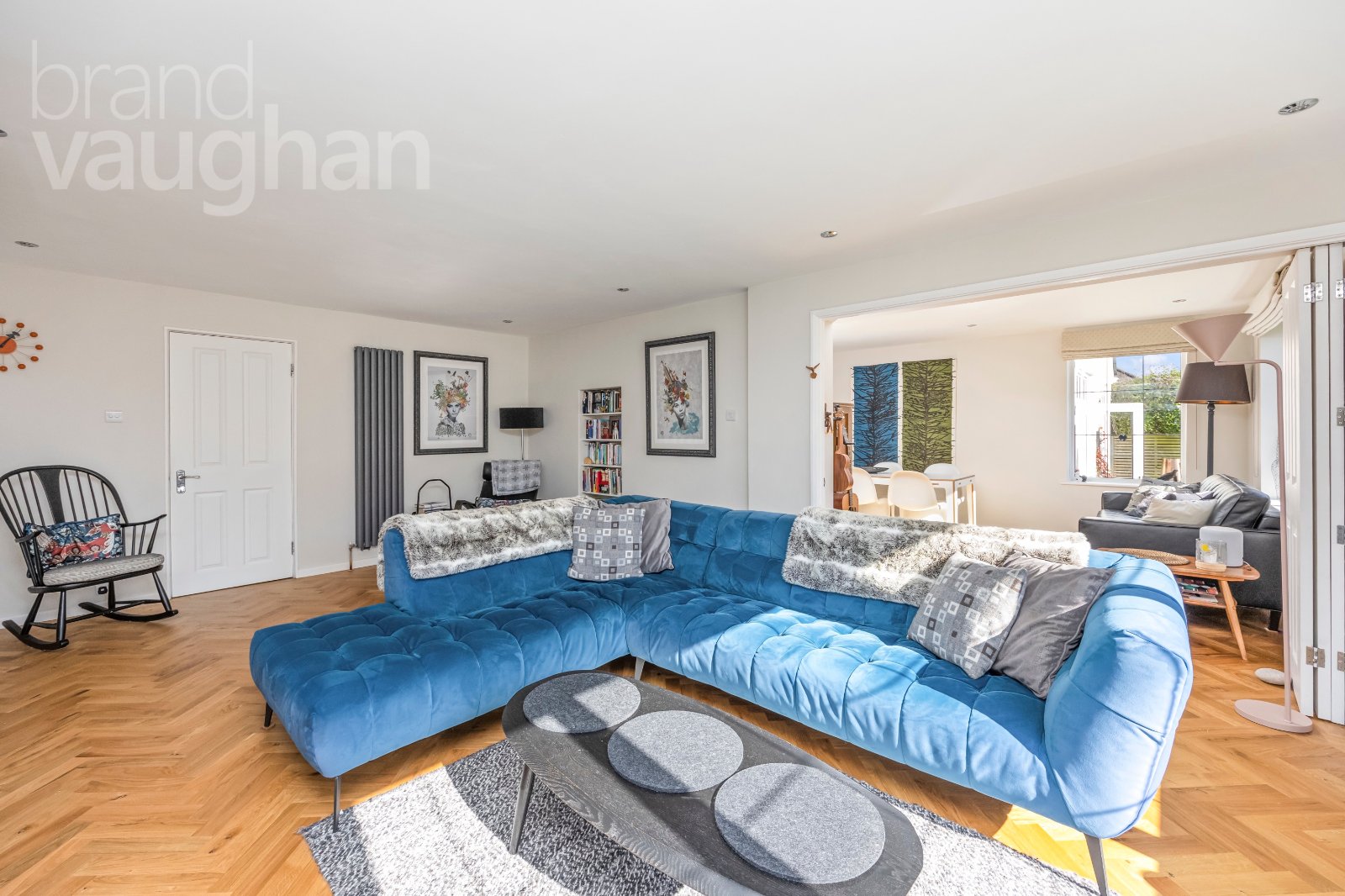 Herringbone oak flooring gleams underfoot and a room to enjoy come rain or shine it is light and airy in summer, whilst during winter, the space transforms into a warm, welcoming haven when you close the bi-folding doors to the dining room and ignite the flame effect gas fire. Next door, the large dining room is a sun-lit haven which can be incorporated into the living room or become a separate space where guests can enjoy relaxed dining and garden views.