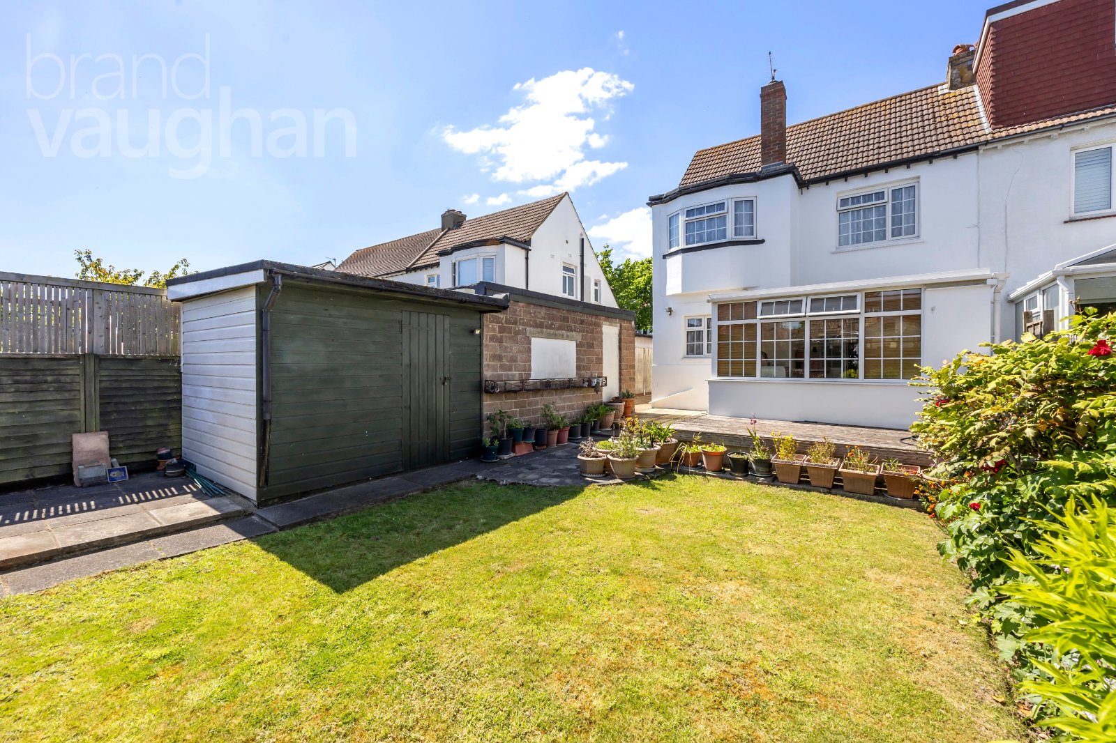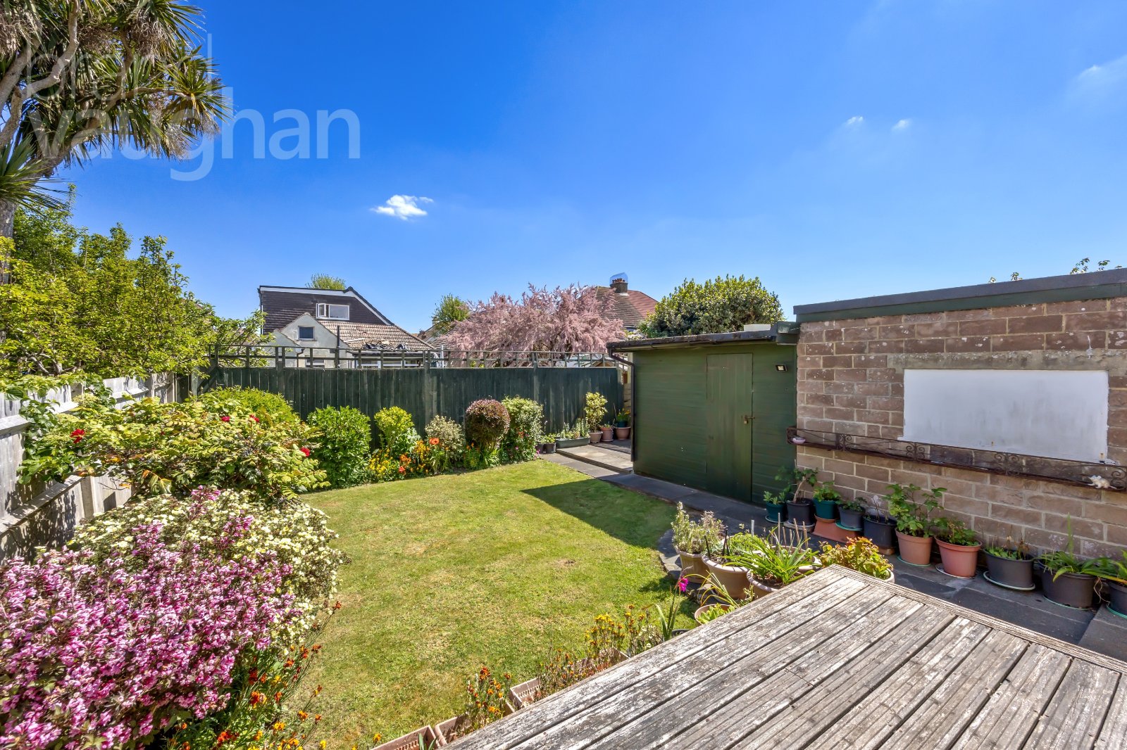 Facing east but with an open southerly aspect, the garden is filled with sunshine right through the day. A raised deck provides space for a table and chairs, while the grassy lawn is immaculately kept with manicured borders bringing shape colour and scents to the space. A large outhouse could have any number of uses as a workshop, motorbike garage, storage space or studio with some renovations – but either way is a huge bonus to this home.