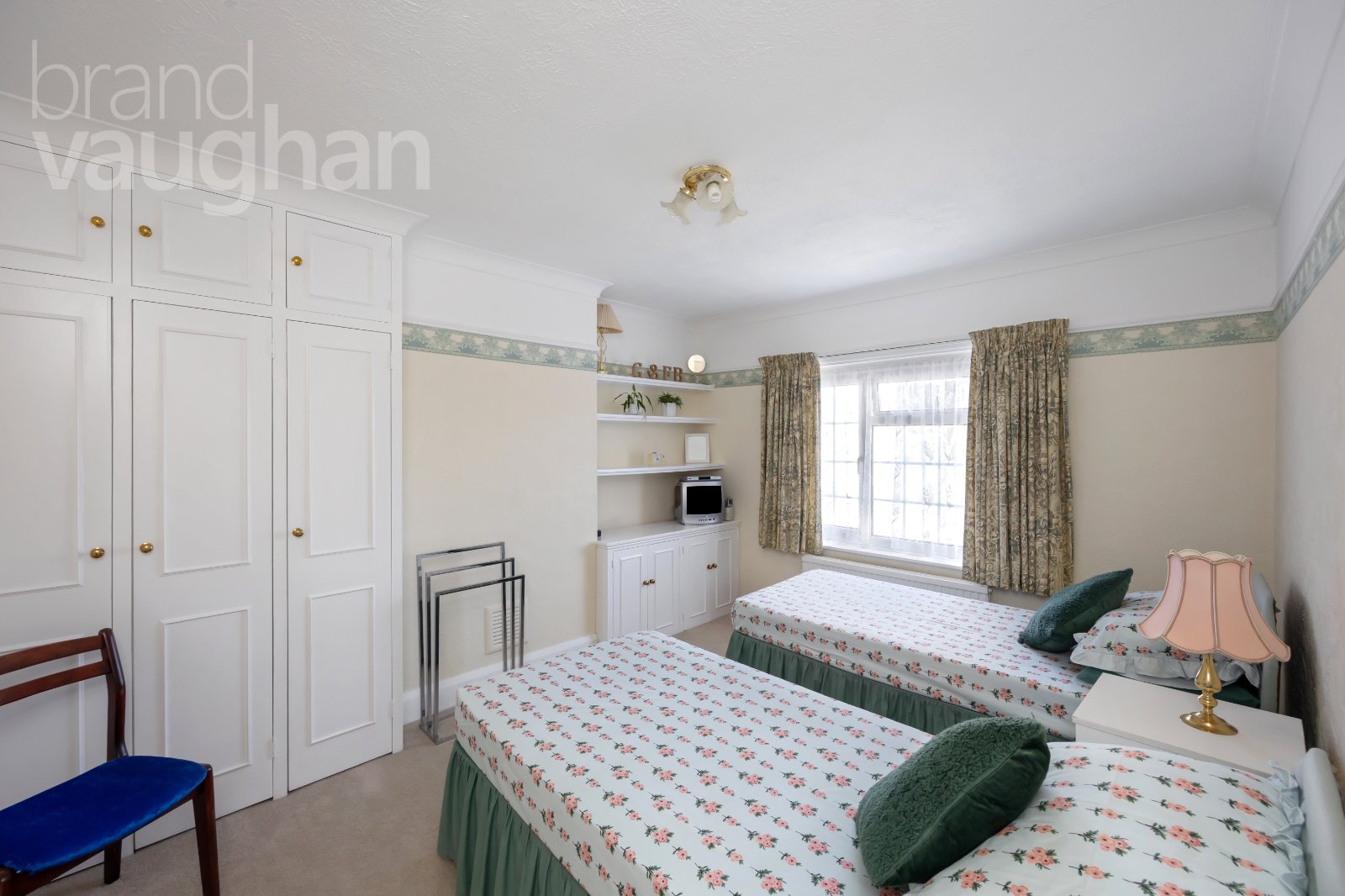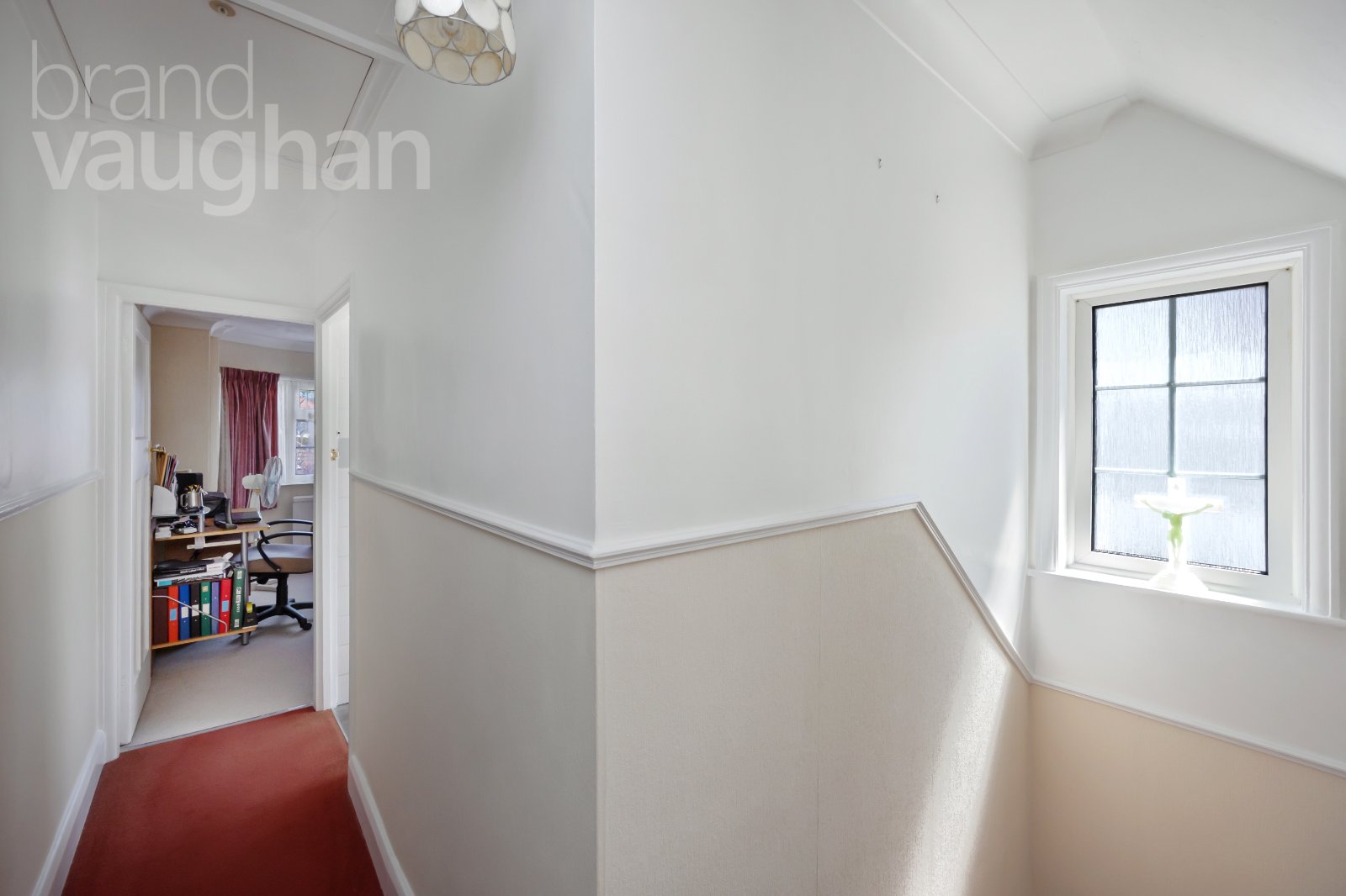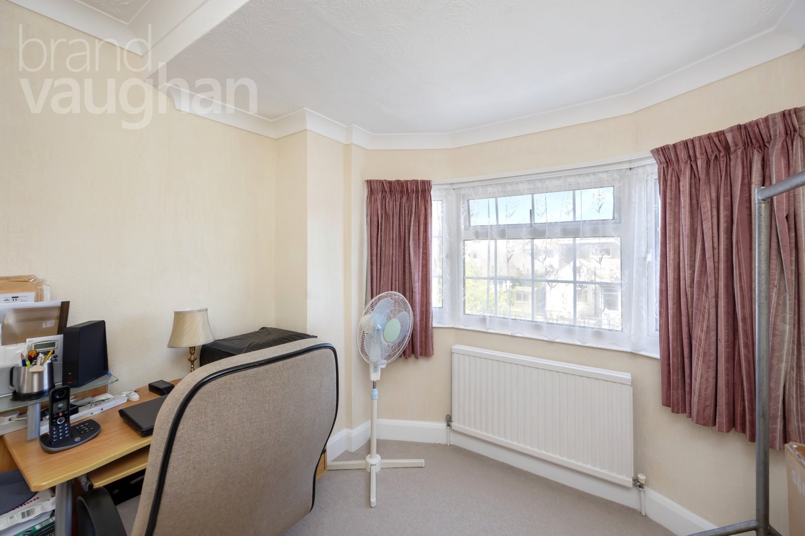 Up on the first floor you’ll find three comfortable double bedrooms, two of which mirror the main reception room below, while the third is smaller making it ideal as a home office. It does allow for a small double bed or sofa bed – so all three are double rooms. They each have soft carpet underfoot and double-glazed windows to ensure a warm and restful night’s sleep. Nearby, the bathroom is classic in white and dove-grey with a shower over the bath – and once again, has scope for reconfiguration and modernisation if desired