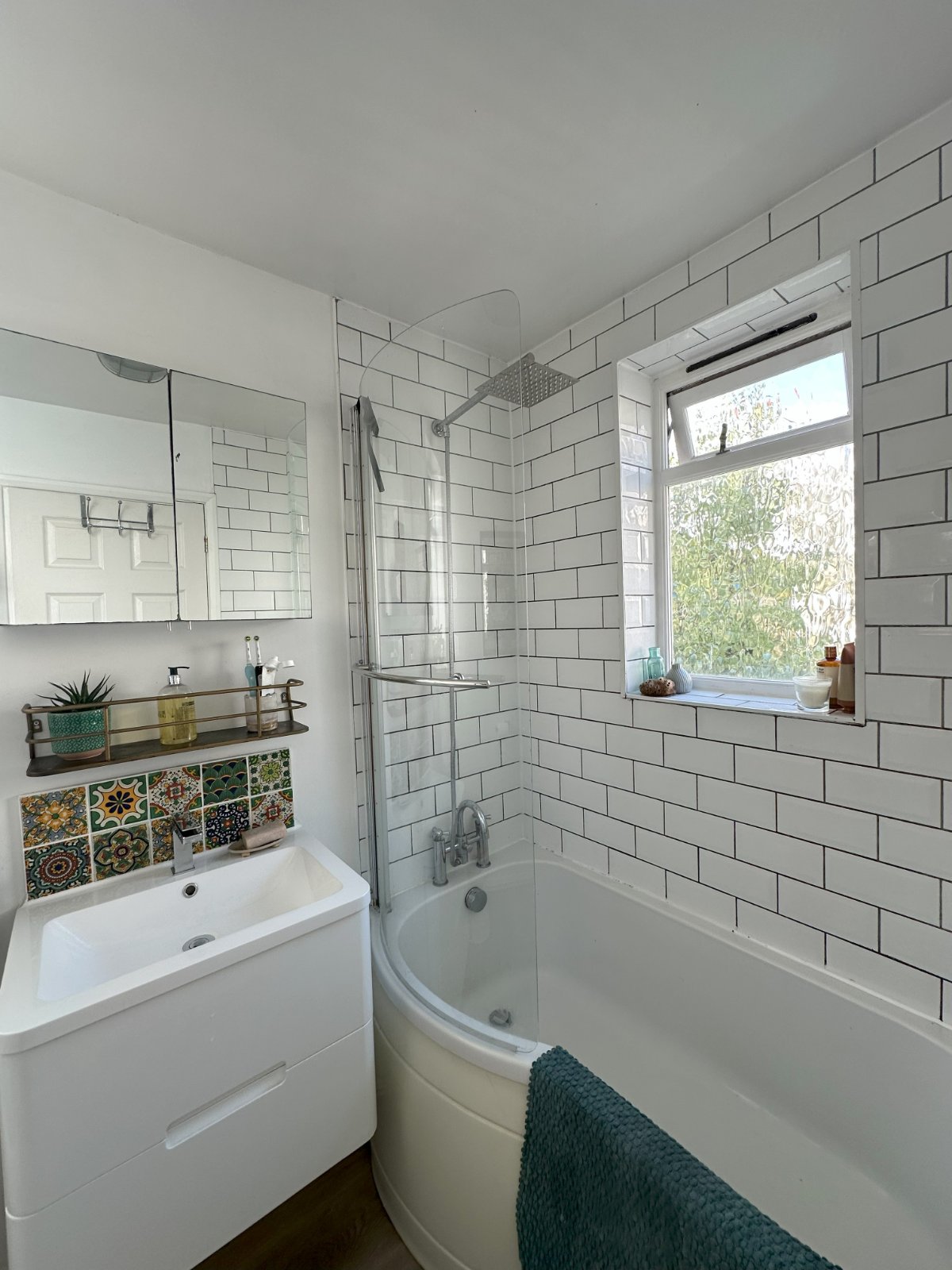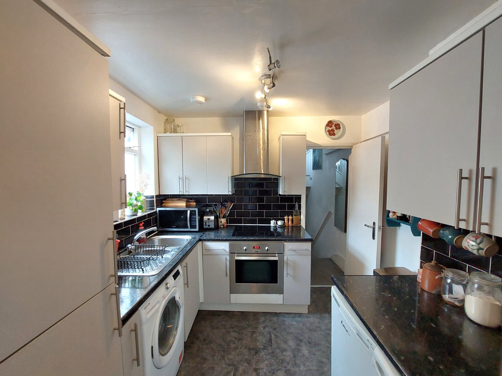 The kitchen sits to the rear and has been well-designed to include plenty of storage and includes an under counter fridge and freezer and a washing machine while the oven and electric hob have been integrated. From here, a door leads through to the bathroom which has 2 windows and metro brick tiling around the bath which has a shower over it.