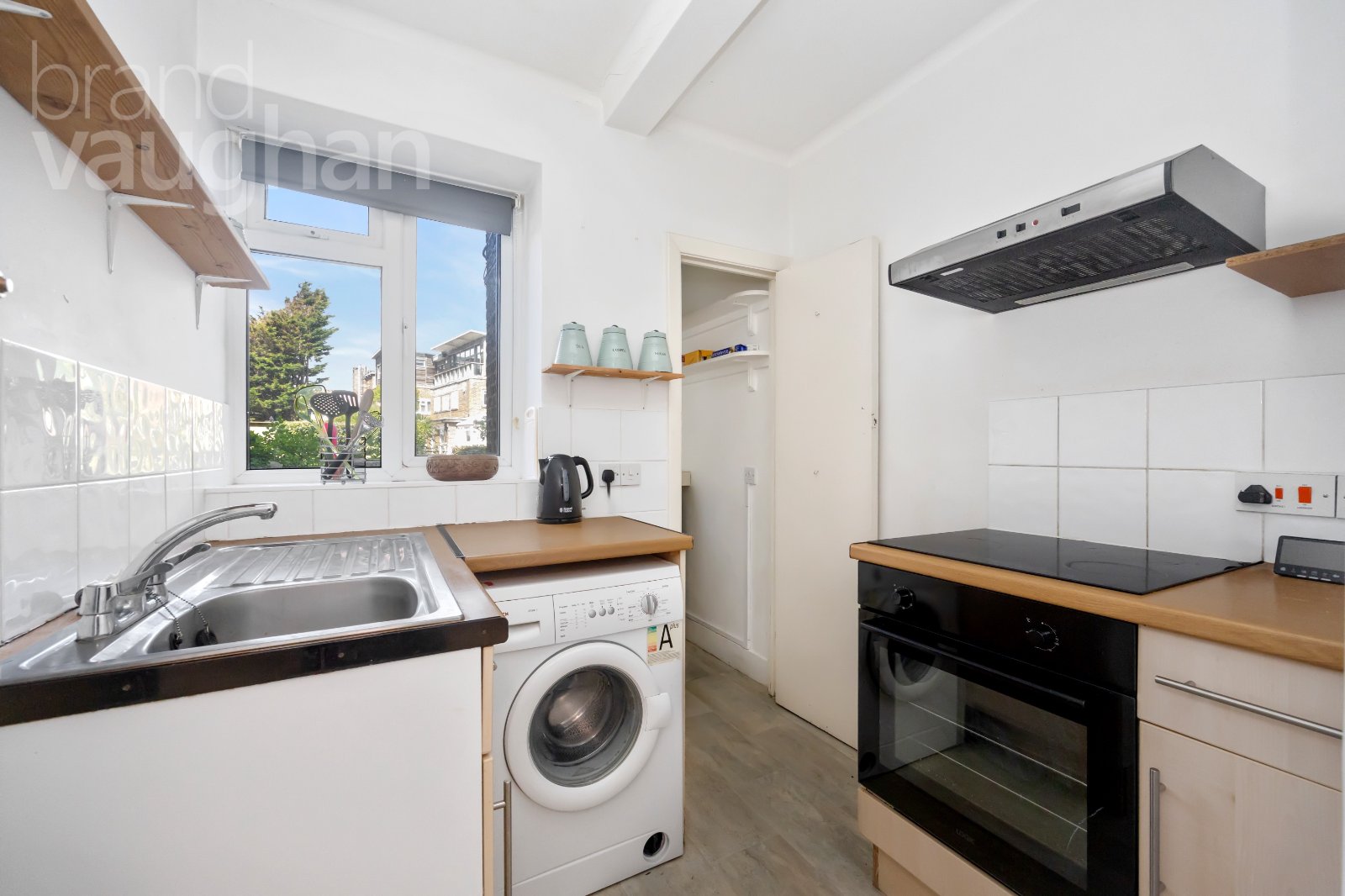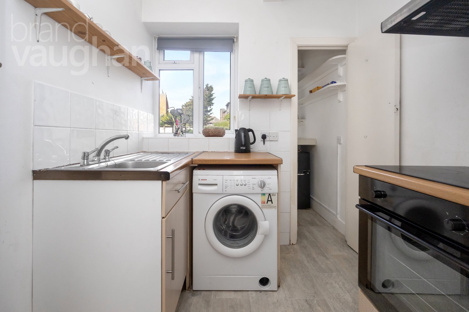 Conveniently next door, the kitchen has been well designed for the space, benefitting from an integrated oven and hob alongside space for freestanding appliances and an additional spacious storage room in a large rear larder. Once again, you can look out over the garden as you wash up.