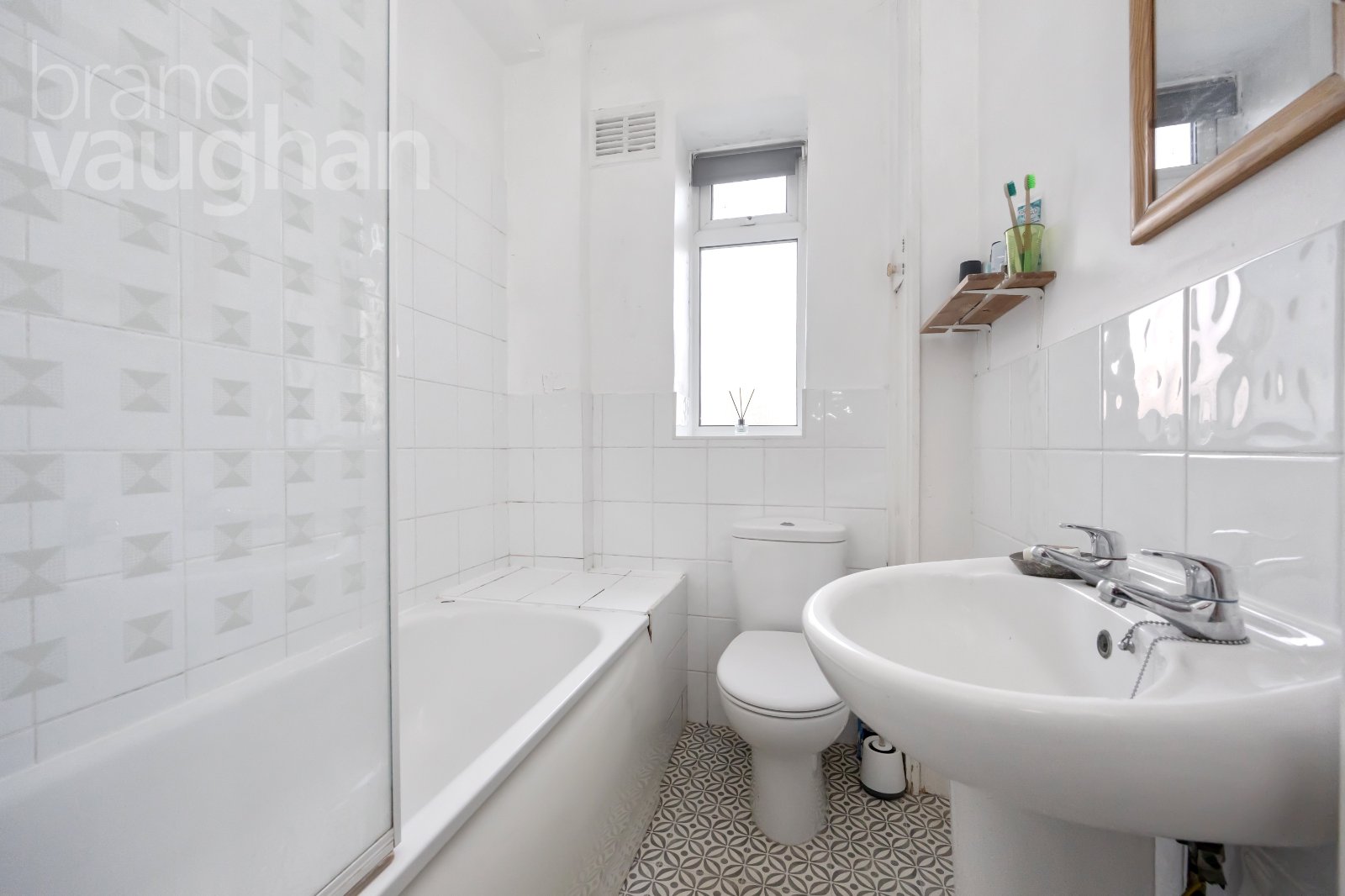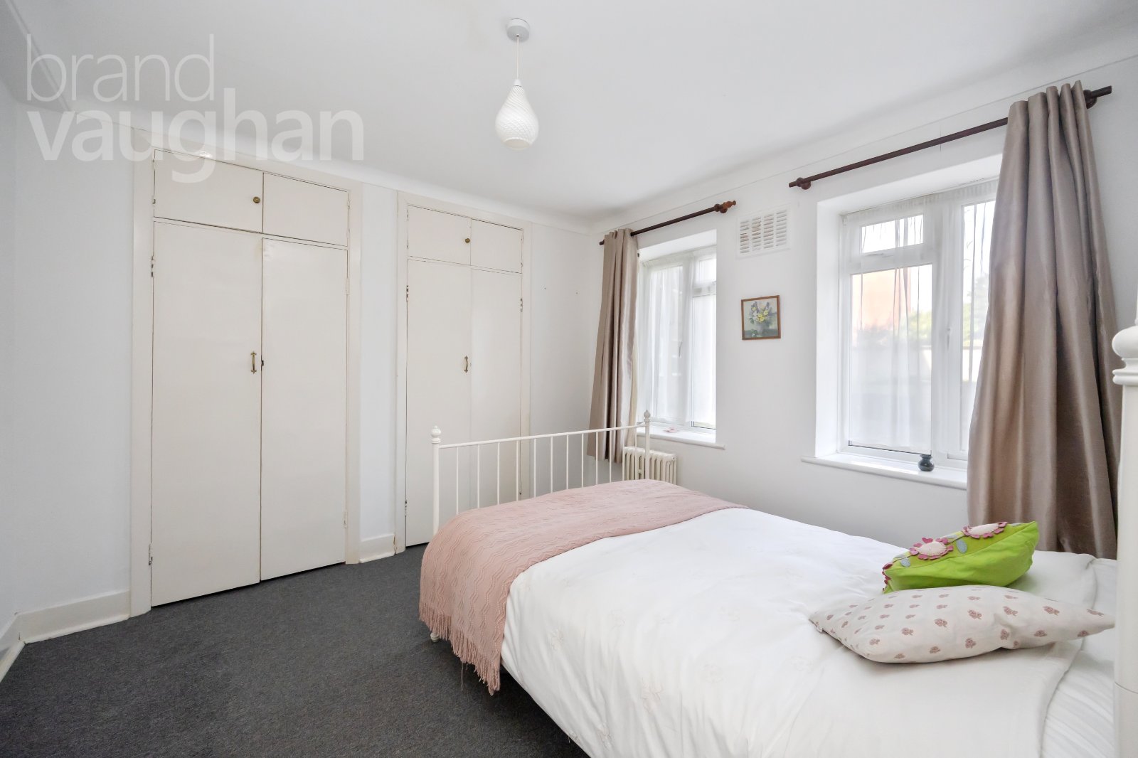 Mirroring the living room, the bedroom is a lovely double room with garden views and built-in wardrobes which maximise the floor space. White walls and dark grey carpets offer a blank canvas for new owners who can add several pieces of freestanding bedroom furnishings.