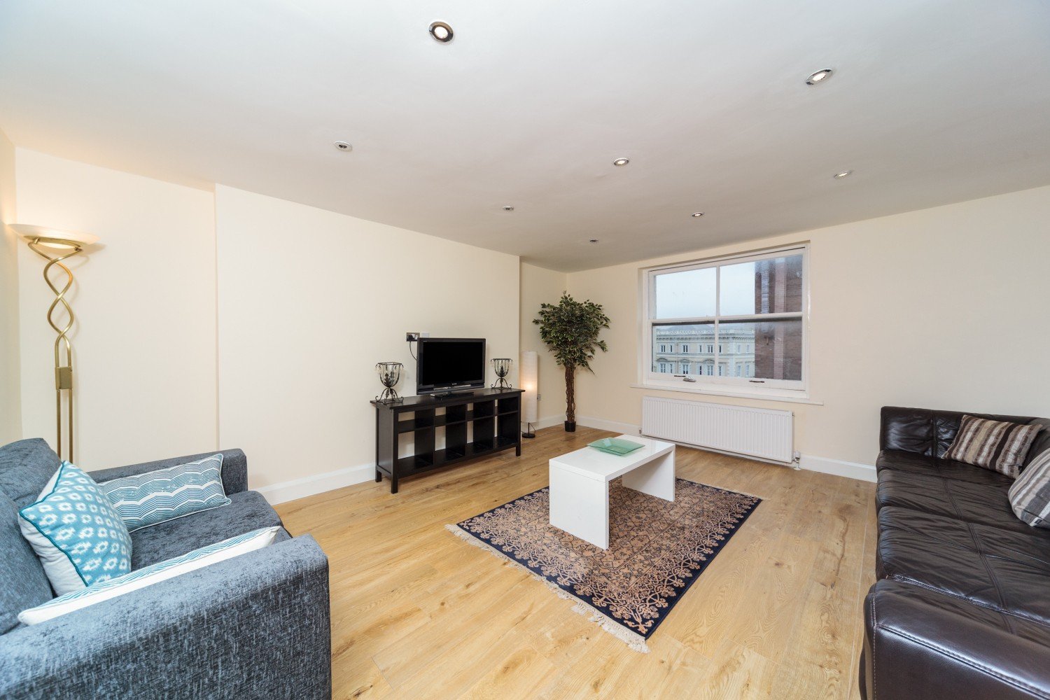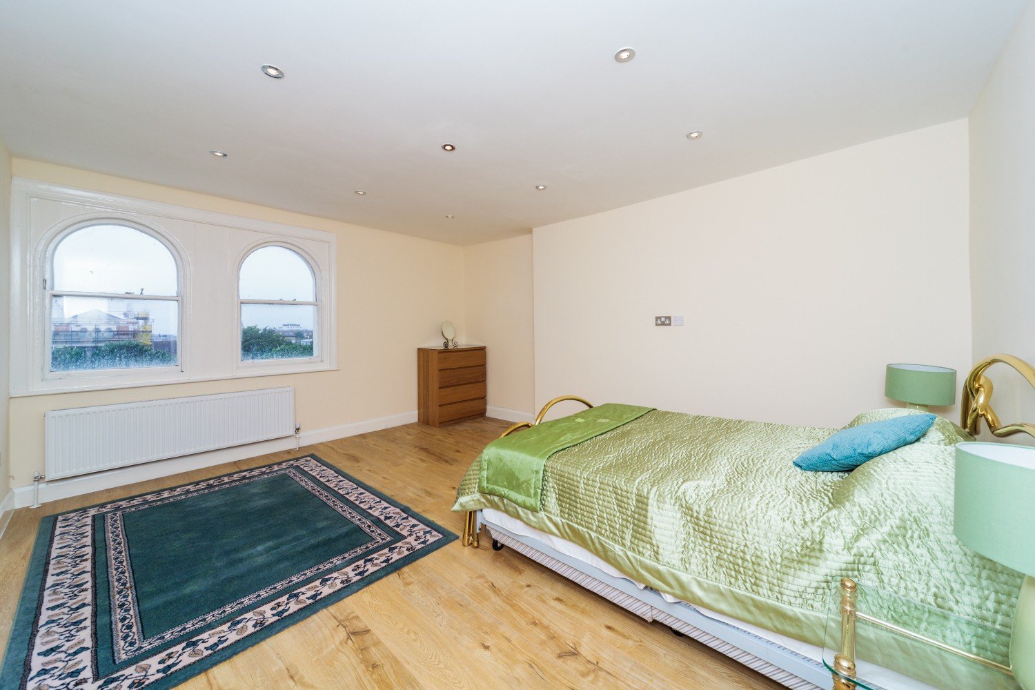 A wide entrance hallway connects all rooms and provides access to a useful storage cupboard. While the apartment has a contemporary interior, it retains a number of charming period features, including double arched sash windows in one bedroom and a decorative fireplace in another.