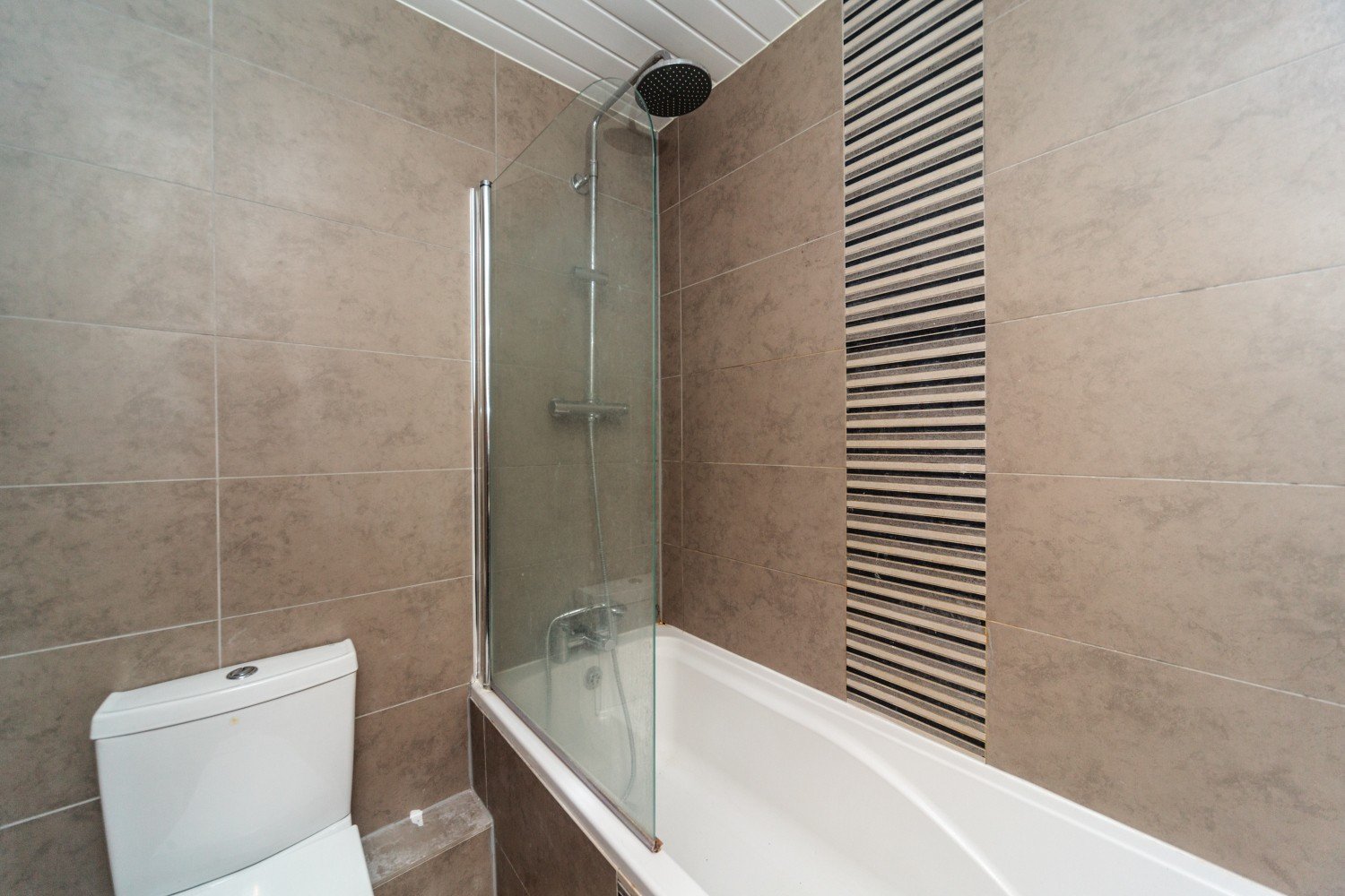 The layout offers flexibility, with three well-proportioned rooms that can be adapted to a variety of living arrangements. The kitchen is fitted with high-gloss units and a dark granite-effect worktop, with integrated appliances including a fridge, freezer, washer-dryer, and dishwasher. The bathroom is finished with large ceramic tiles in natural stone tones and includes a modern white suite with a shower over the bath.