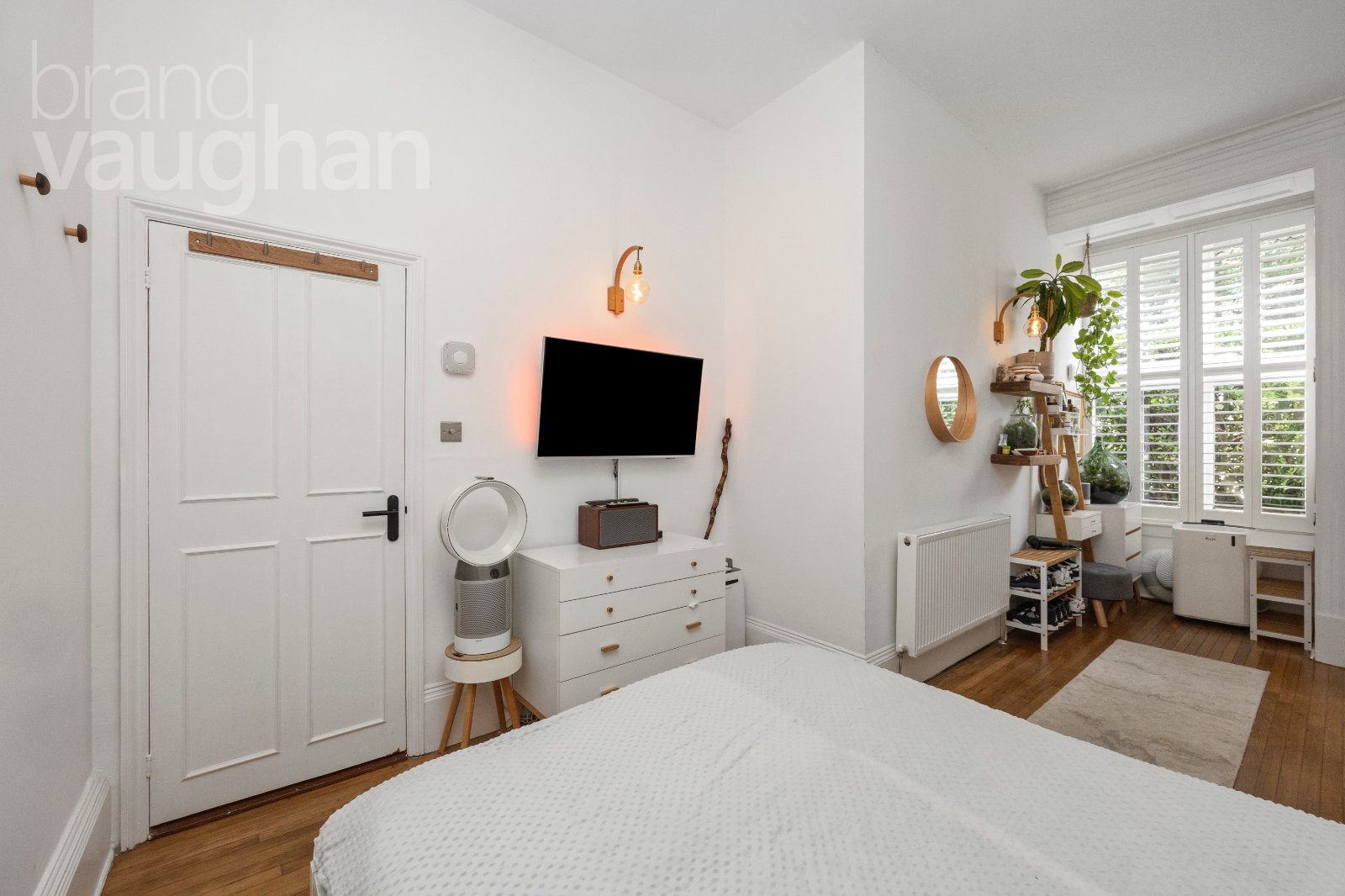The sociable main living area is the star of the home, combining kitchen, dining and lounge in one bright and welcoming space. White shaker-style cabinetry, wood worktops and integrated appliances ensure the kitchen feels timeless, while large sash windows dressed with shutters flood the room with natural light. The space flows easily from cooking to dining to relaxing, making it perfect for entertaining or quiet evenings in.