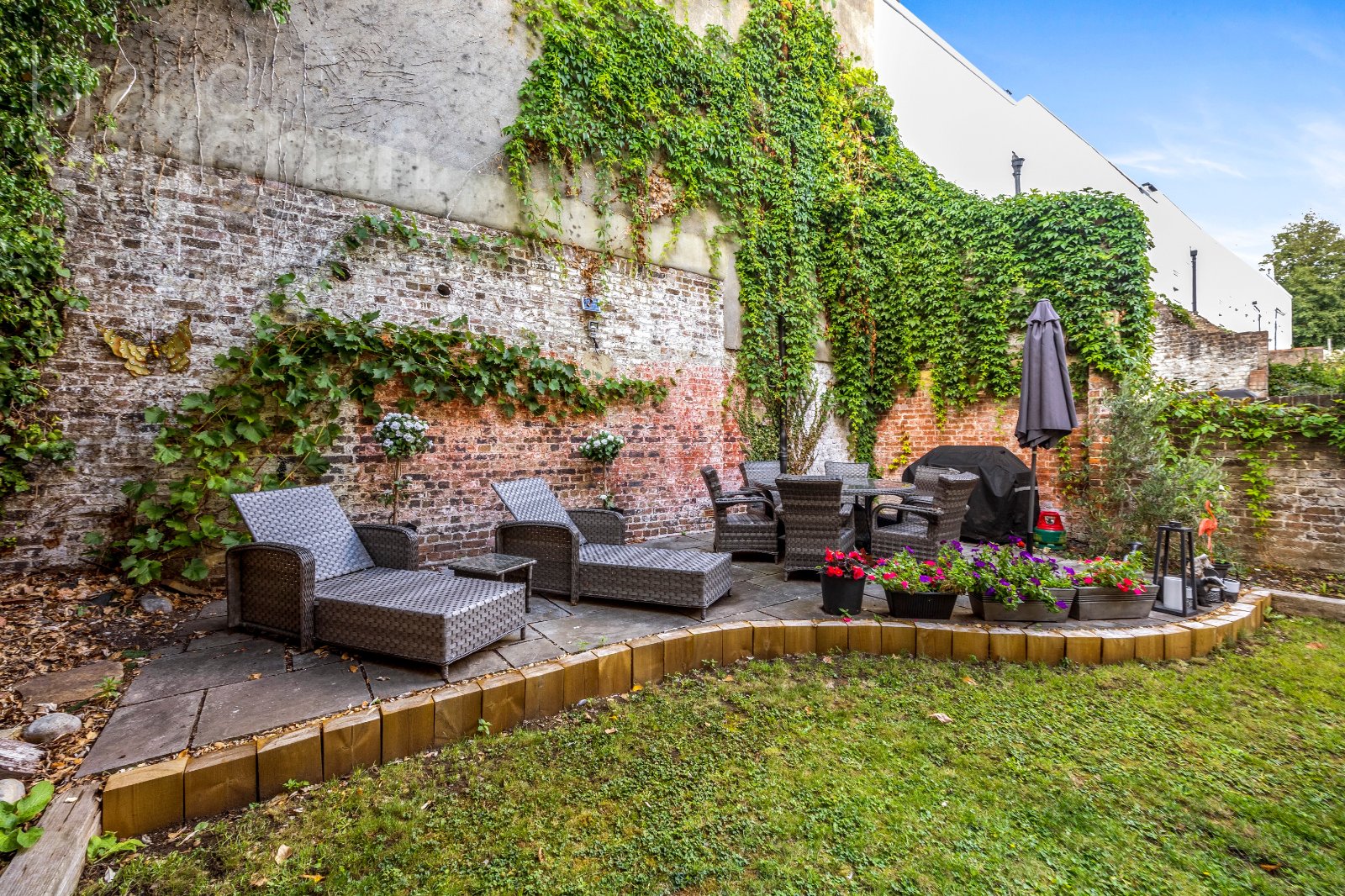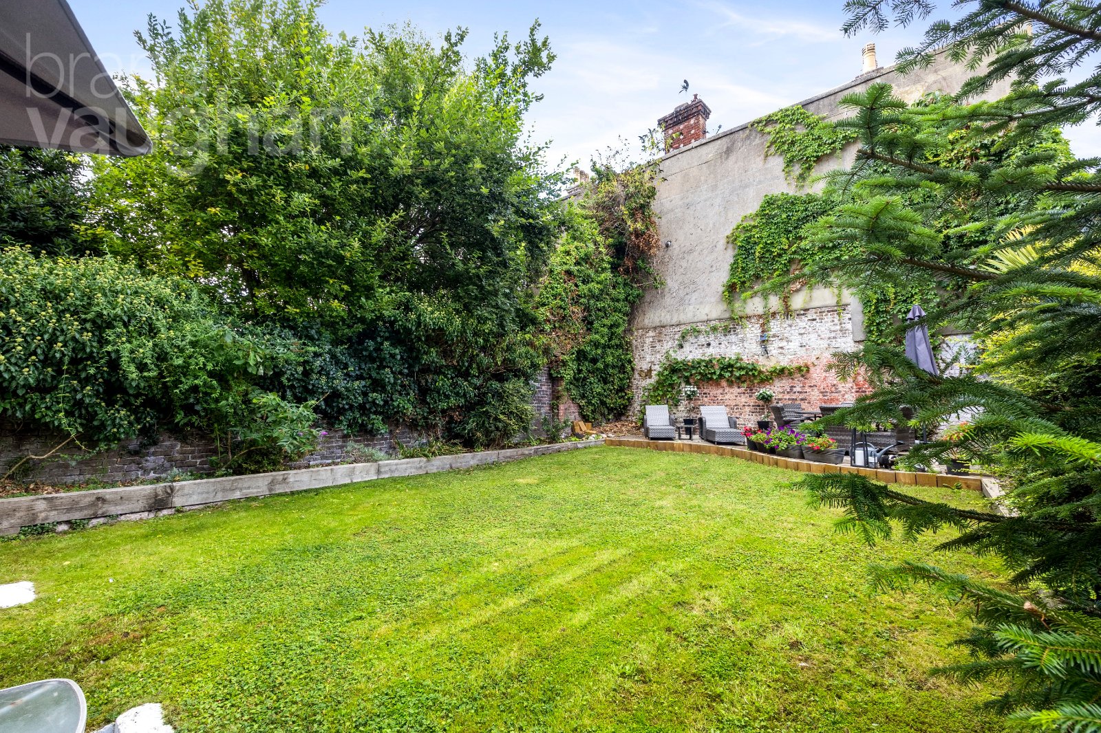 The private rear garden is a real highlight – a large, lawned space with mature planting, raised borders, and a paved terrace at the far end, ideal for outdoor dining and entertaining.