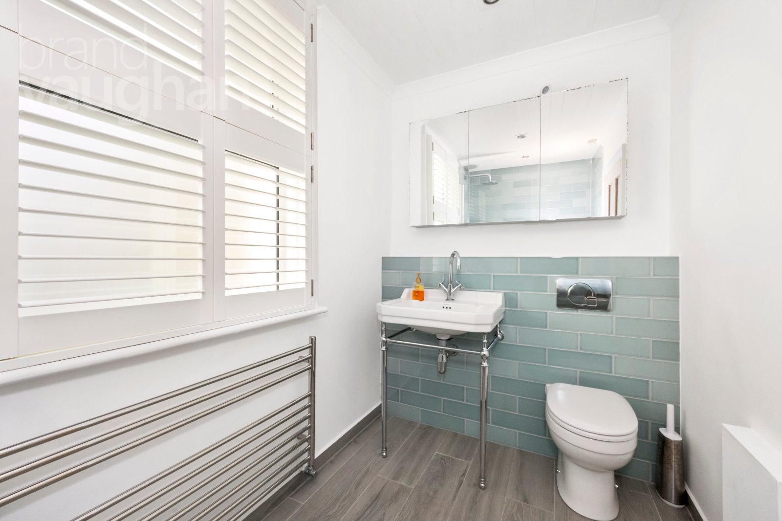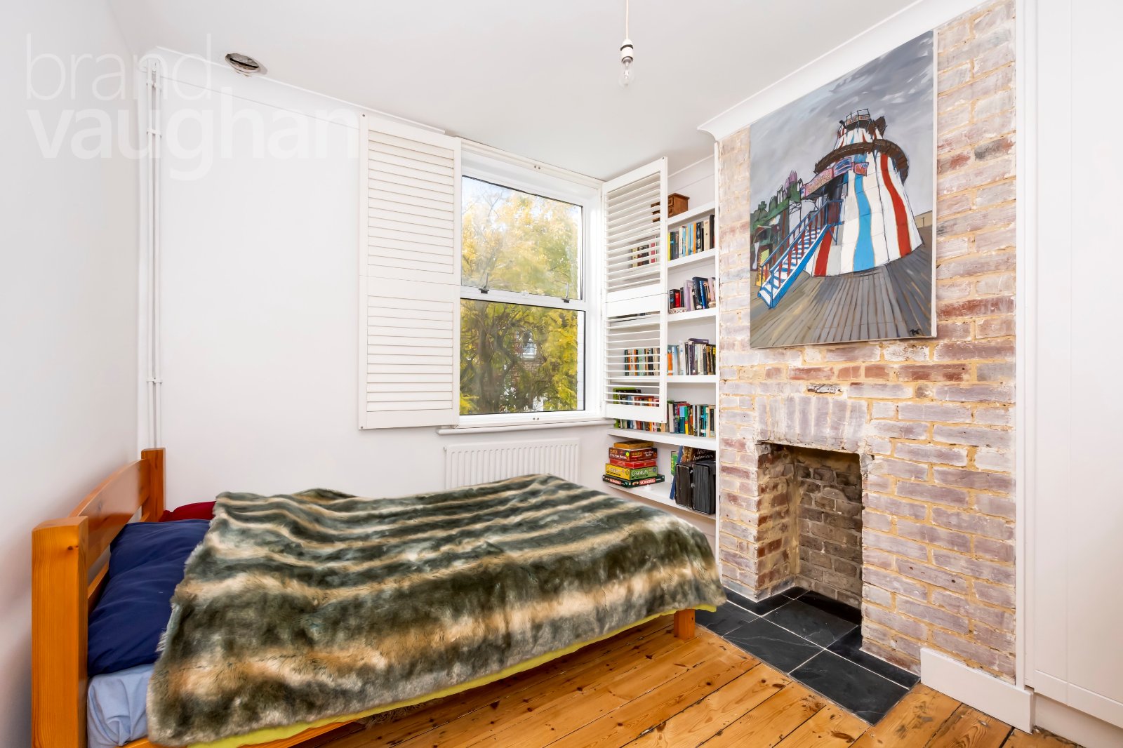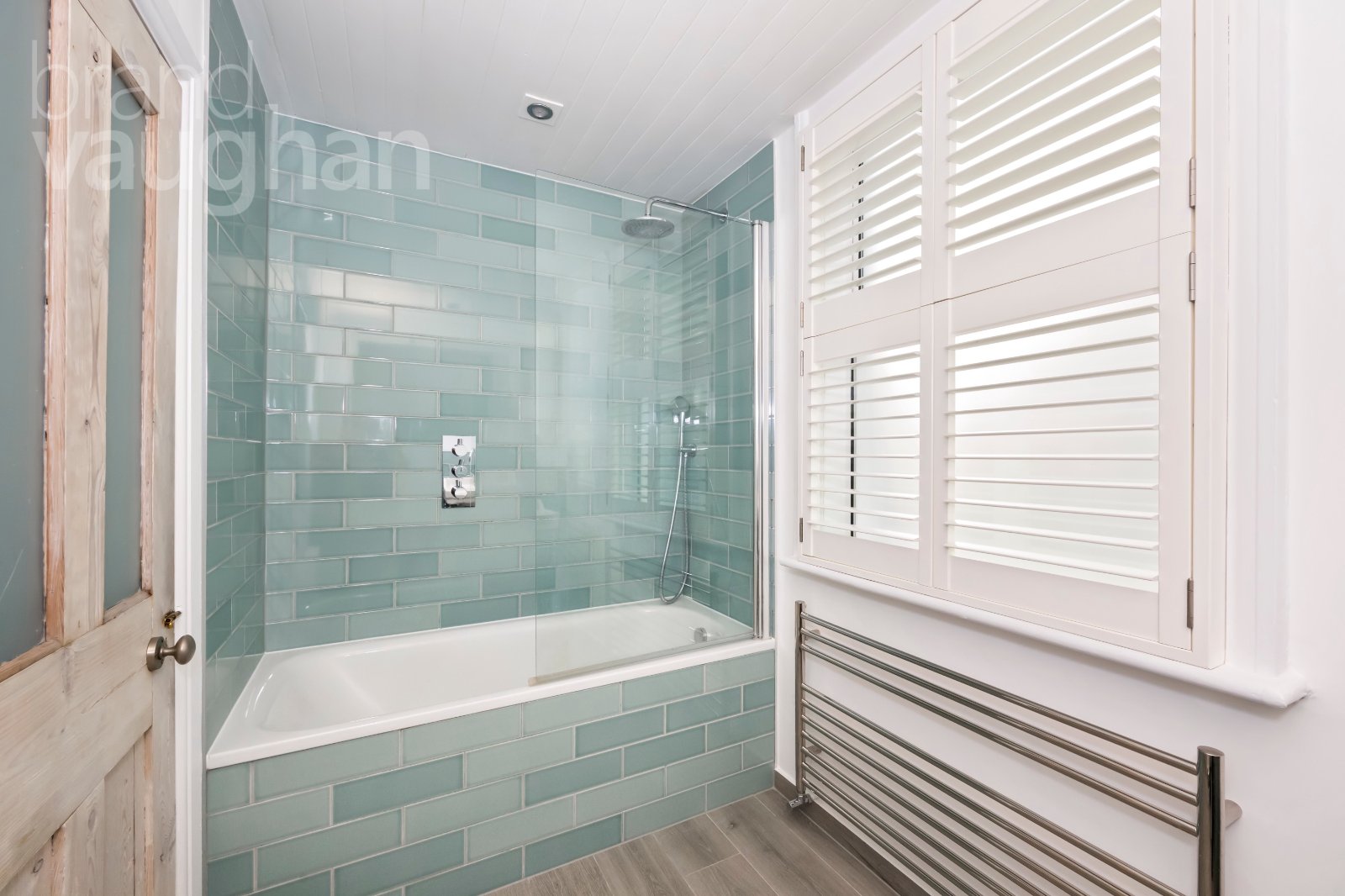 Upstairs, two double bedrooms include a generous principal bedroom spanning the full width of the house, and a second bright double with garden views. The bathroom is modern yet classic, with clean lines and natural light.