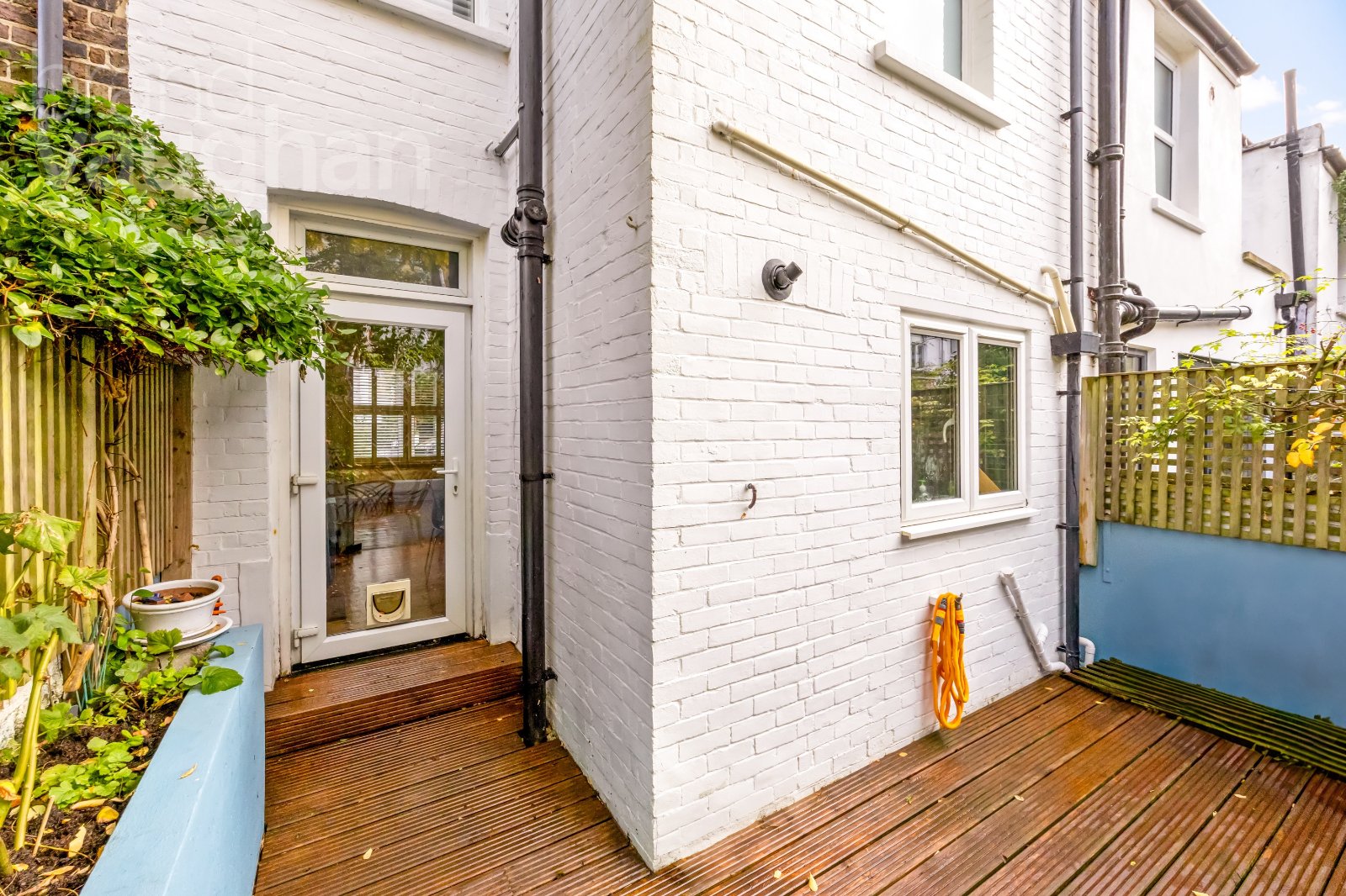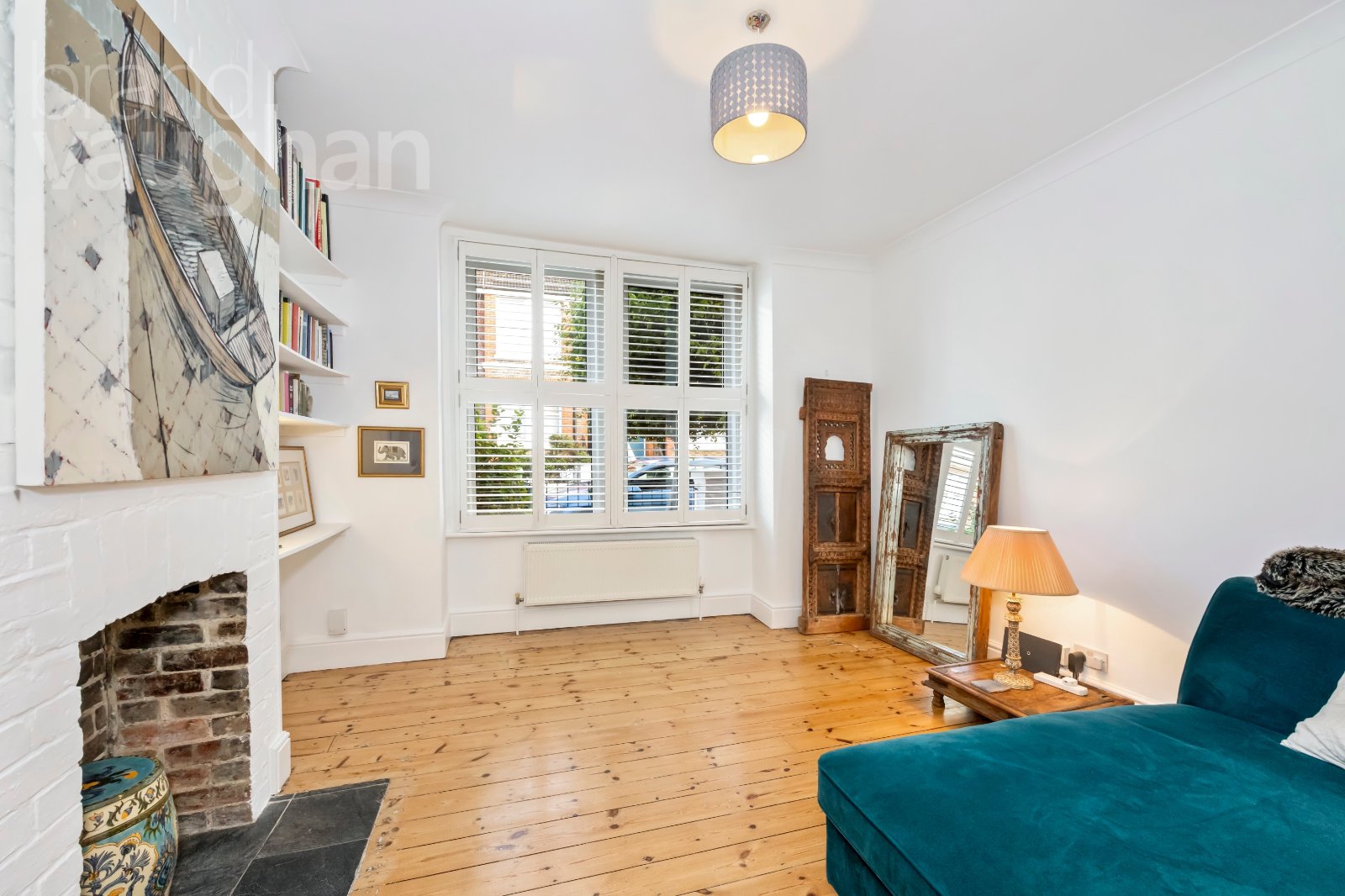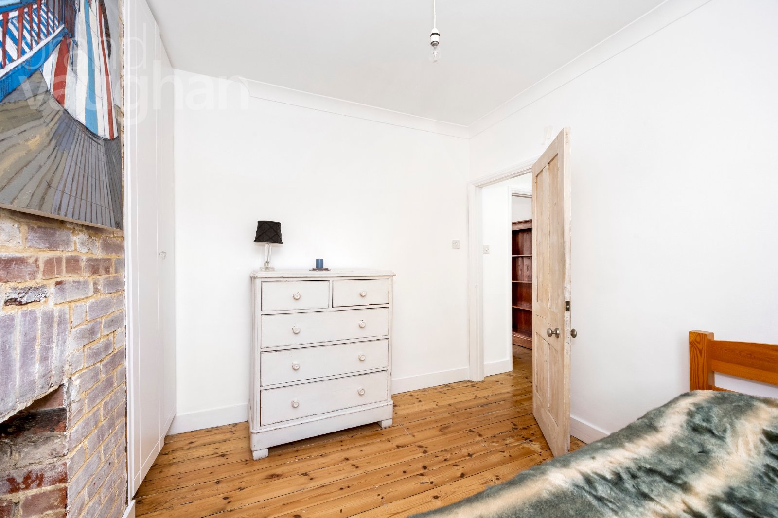 Upstairs, two double bedrooms include a generous principal bedroom spanning the full width of the house, and a second bright double with garden views. The bathroom is modern yet classic, with clean lines and natural light.