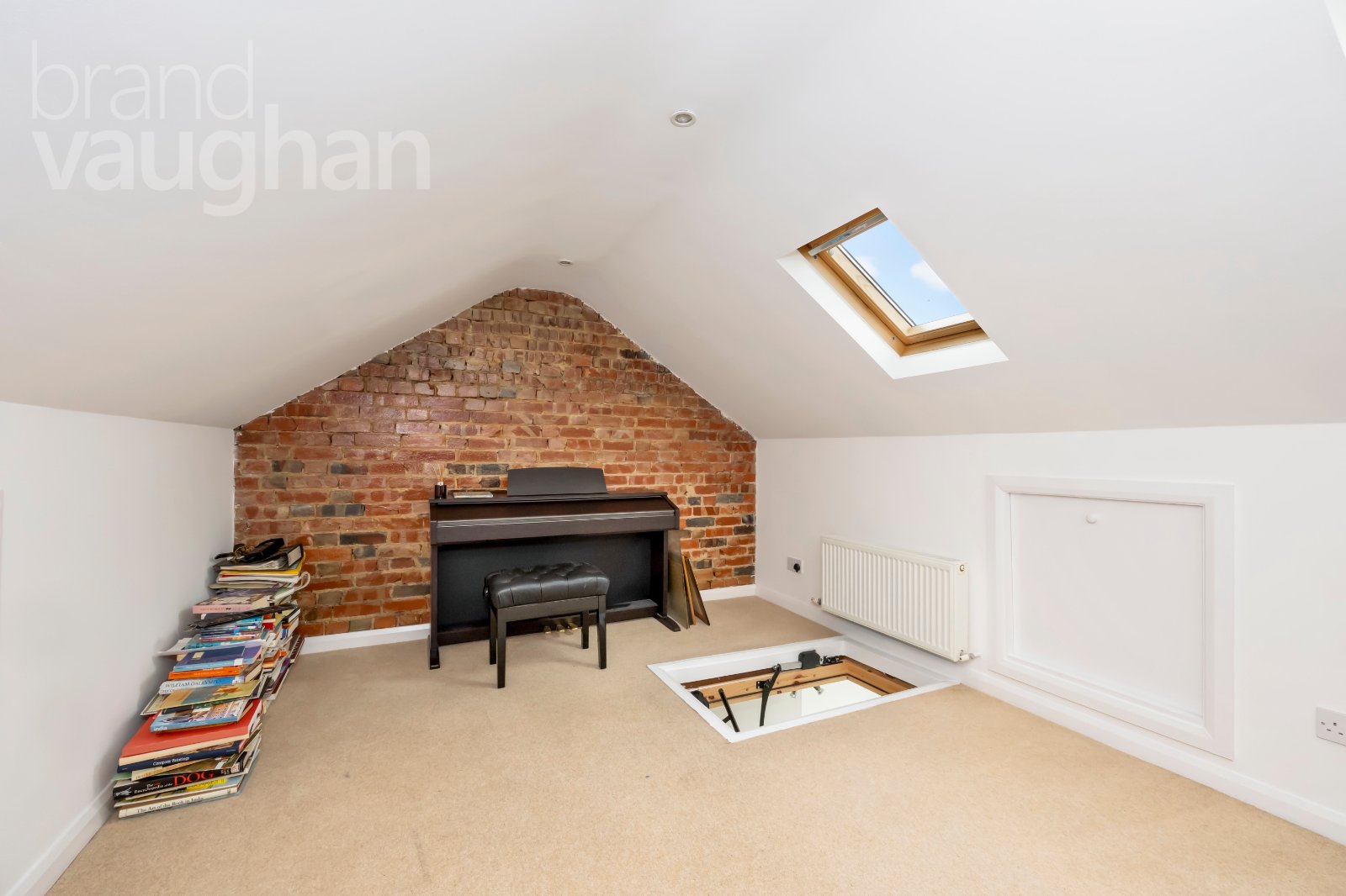 The loft has been converted into a versatile, bright space with exposed brick, Velux windows, and eaves storage — ideal for a study, music room or creative hideaway.