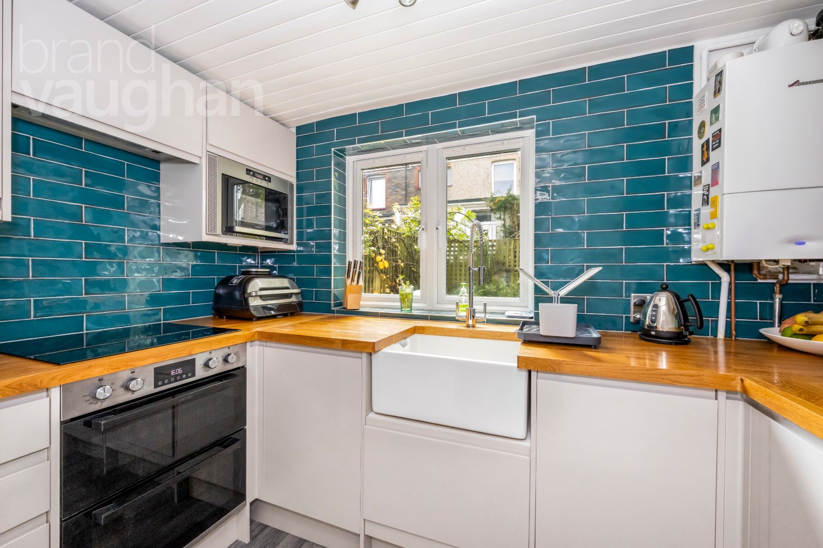 At the rear, the kitchen has been tastefully modernised with deep teal metro-tiles, wooden worktops, and a white ceramic sink — balancing style with practicality. A window over the sink captures garden views, and a door opens directly onto the sunny decked patio, perfect for summer dining.
