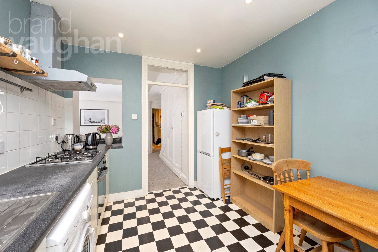 Conveniently along the hall, the kitchen is streamlined and well-appointed with a vast amount of storage alongside integrated dual ovens with gas hob, allowing space for other freestanding appliances to include a washing machine, tumble dryer, dishwasher and a tall fridge freezer – all of which may be negotiable with the sale.
