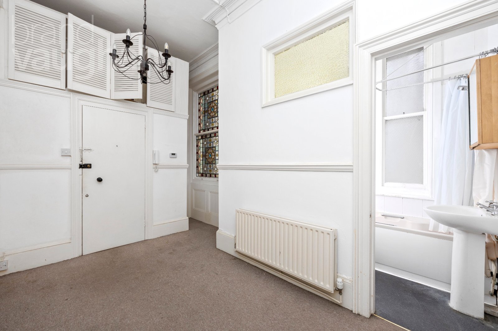 Through the front door, an inviting room decorated in a calm colour with plenty of storage has 3.75m x 2.66m (12’3 x 8’8) of versatile space which could be a dining area and a study as well as an occasional bedroom for guests as it has the airy bathroom with a shower over the bath next door.