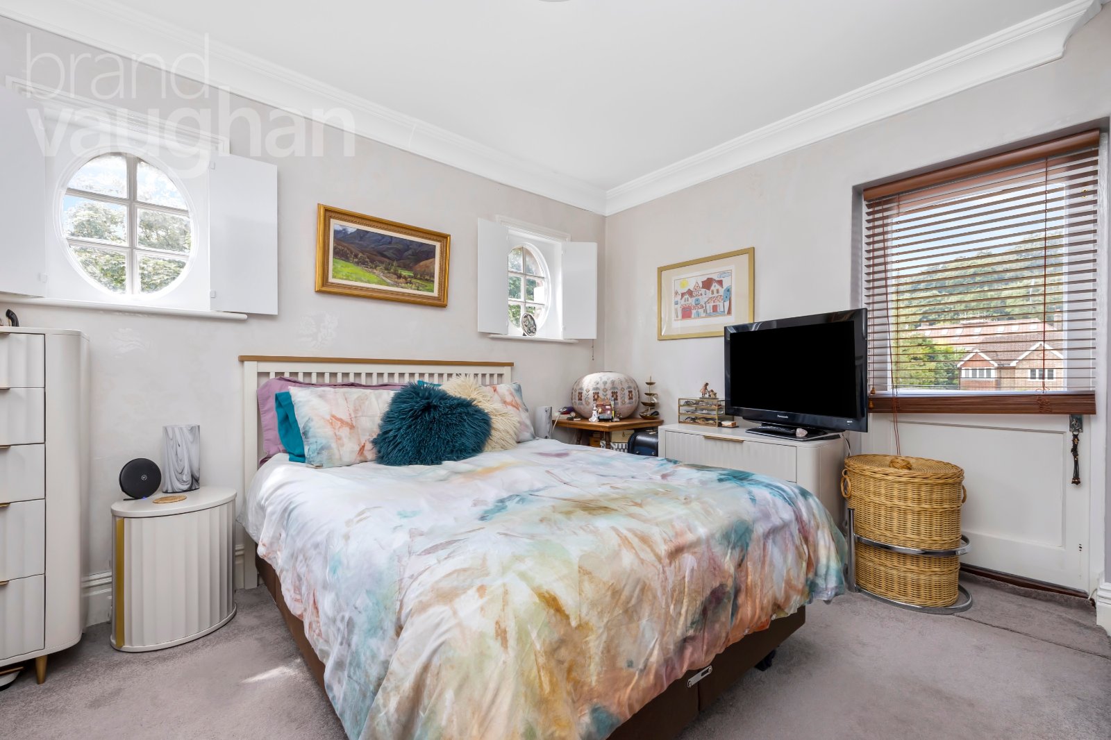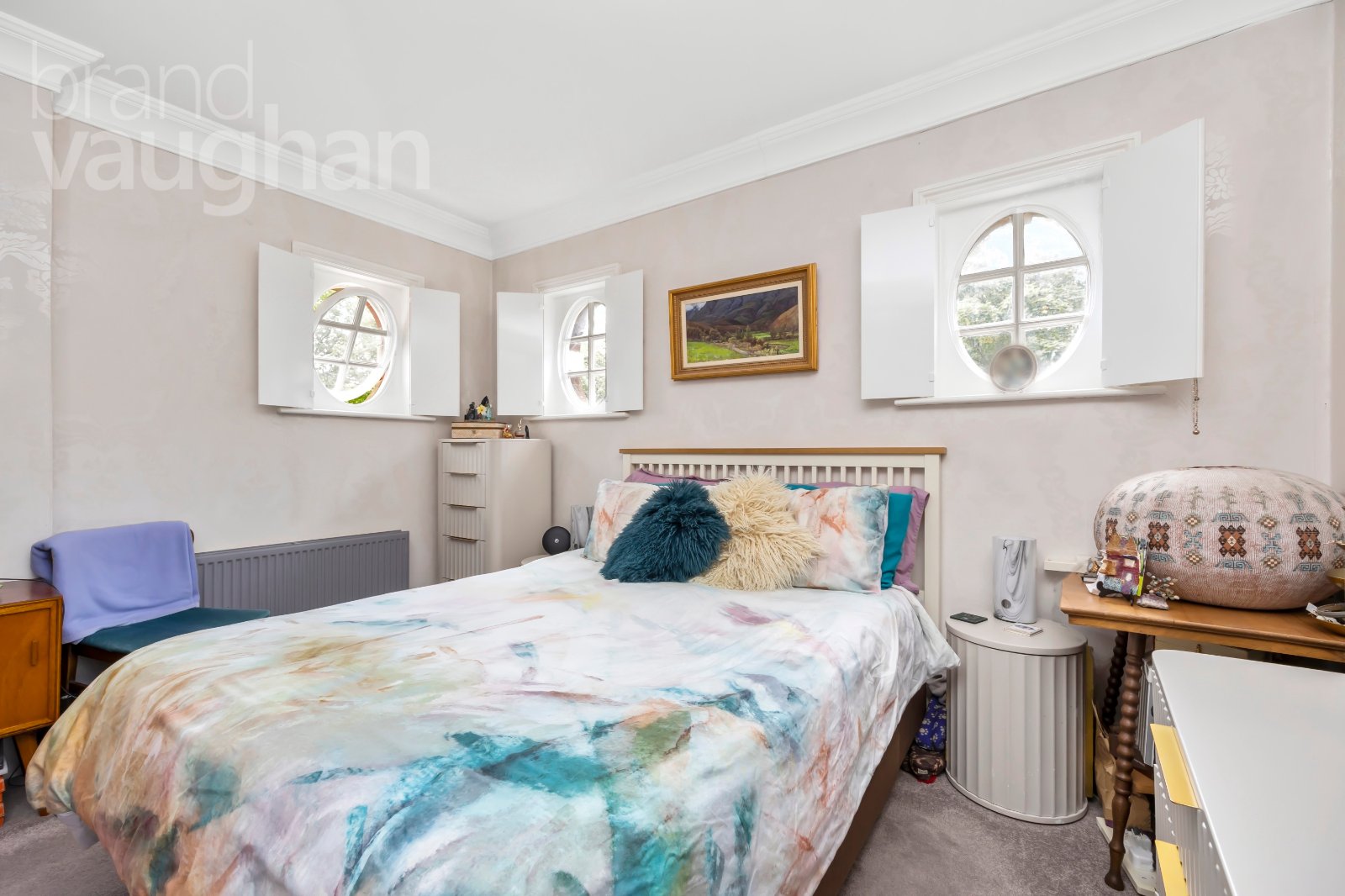 Carpeted stairs rise to the next floor which has further built-in storage – ideal for clothes and shoes. The principal bedroom and bathroom are on this level, following the footprint of the rooms below them so they are spacious and naturally light. Having been fully renovated in recent years, the bathroom has a contemporary finish with a rainfall shower over the bath and has a streamlined vanity unit and conical basin with rose gold attachments. Low level lighting and a tall heated towel rail completes the look. The bedroom is triple aspect with the original oval windows and shutters adding character to the space while offering unique view points out to the surrounding landscape. There is a larger window too and several built-in wardrobes, so even with a king size bed and several pieces of freestanding furniture, the floor space is not compromised.