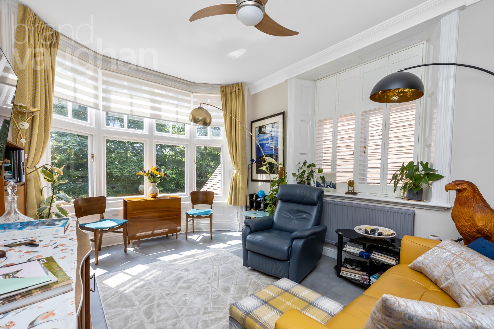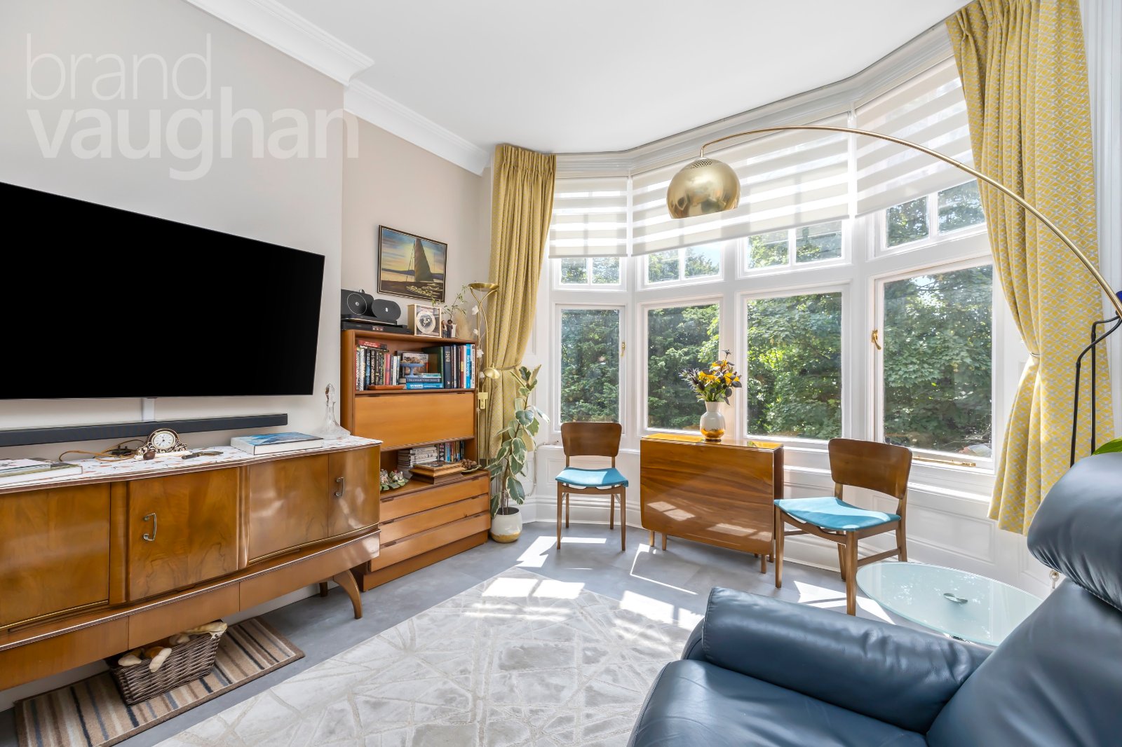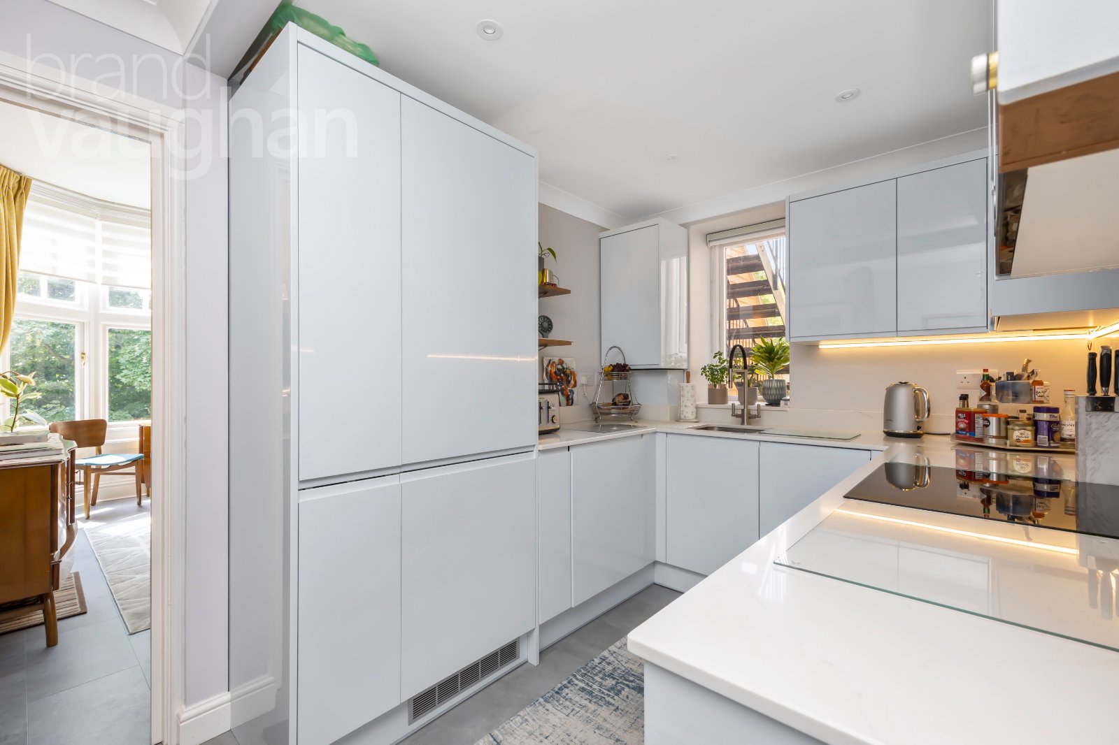 Entering the property on the first floor it feels immediately welcoming and has clearly been renovated by those with an eye for modern interiors. Soft grey carpet leads past deep storage cupboards for coats and household items and into the bright and generous, dual aspect reception room on this floor. Facing the rear of the building, a vast bay window reaches up to the ceiling framing exquisite leafy views which are ever-changing with the seasons and filled with wildlife which can be viewed from the seating area. The ceiling is high, and it feels like the perfect place for entertaining or simply relaxing and dining in the evening.
