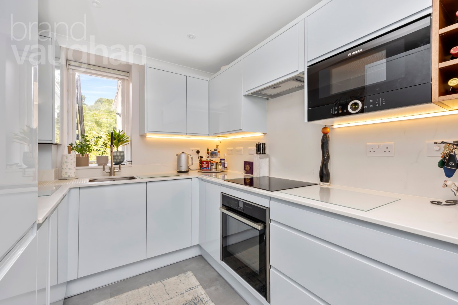 Next door, the kitchen has been well-designed with streamlined, handle-free gloss cabinetry in delicate sea breeze blue, offering a huge amount of storage alongside integrated appliances. These include a fridge freezer, microwave, washing machine, dishwasher and a fan oven with induction hob, seamlessly fitted to composite, slimline stone worktops. Under cabinet lighting warms the space while illuminating the worktops and the dining area is conveniently next door.