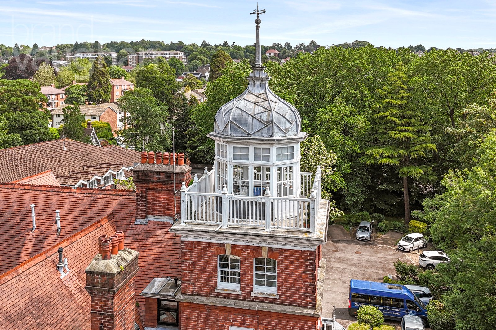 Multi-pane sash windows look out in every direction, now taking you over the rooftops of the local houses towards the city in the south; all below big, open skies. There is ample space for comfortable furnishings, sofas and chairs, and an open staircase rises up to the cupola at the very top. This room is used as a home office, but it has also been used for sleeping on occasion, and from here there is access to the balcony which runs around the perimeter. Thankfully the balustrades are high, so it feels completely safe, yet they do not obscure the incredible vista of church spires peeking up through the trees, high above the chimney stacks of the neighbouring homes. Inside, the octagonal glass structure has been fitted with insulating blinds which ensure it stays warm in winter and cool in summer, and the woodwork has been fully restored as part of the maintenance of the building, so the finish will last for many years to come.