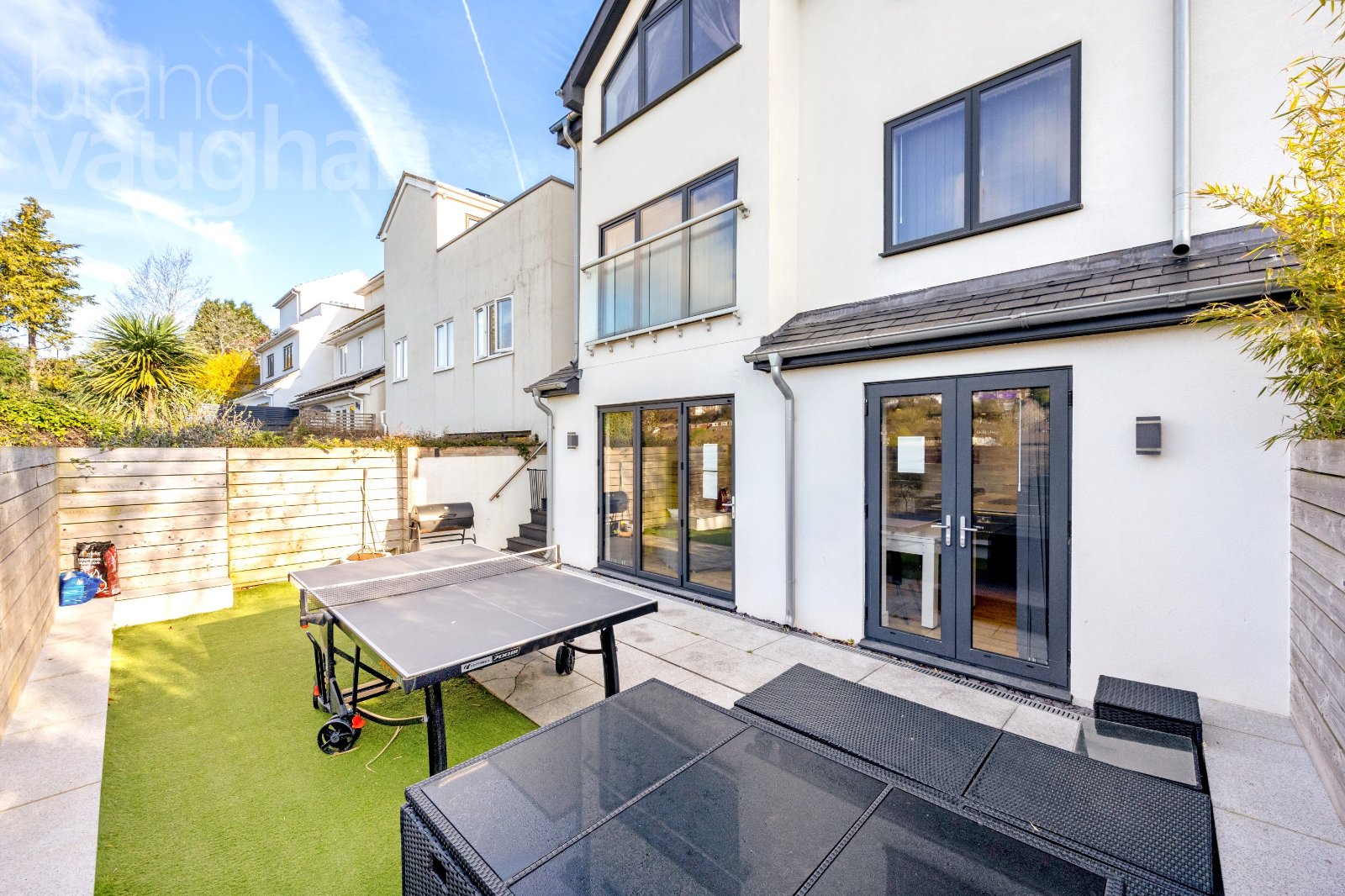 Spanning the width of the house to the rear, the sun terrace garden has a stone patio area close to the house alongside an area of faux grass, ideal for children to play on without getting muddy. As a south facing garden it is a complete suntrap during summer, but there is plenty of space for a parasol and an outdoor dining table and chairs for alfresco food and drinks. Contemporary linear fencing ensures privacy, although the vies are also spectacular from here too. Ready for the modern lifestyle, it is particularly low maintenance, although you could add potted plants for a kitchen garden if desired.