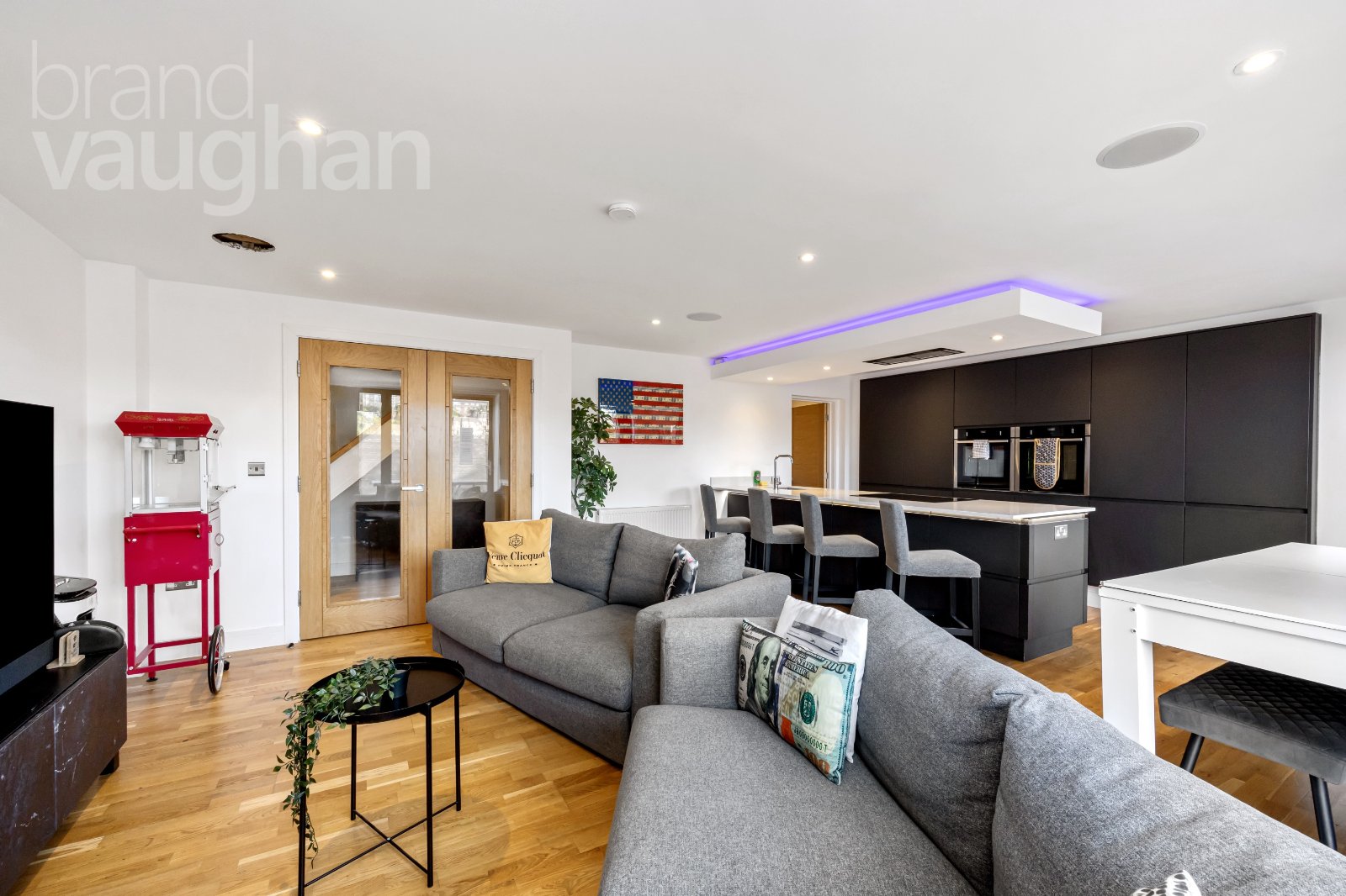 To the front, the house is clearly modern and well-designed, set back from the road behind a neat brick drive. It seems unassuming, yet it becomes a Tardis as soon as you step through the door. A glass balustrade leads down through a triple height stairwell and tall white, plastered walls rise up to vaulted ceilings in the rooms on this level. All internal doors are oak by Doors of Distinction and it is clear no corners have been cut in the creation of this exceptional home.