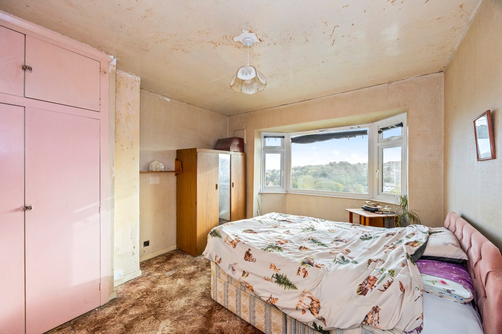Upstairs, all three bedrooms are light and airy, the guest room offering the option of being a quiet place to work from home. The second generous bedroom looks over the garden and is not directly overlooked and it’s by the family bathroom, which although needs a little tidying, has an electric shower above the bath and a separate w.c. next door – useful in a busy home. Private and peaceful, the spacious the principal bedroom has glorious open views and plenty of organised, built in storage.