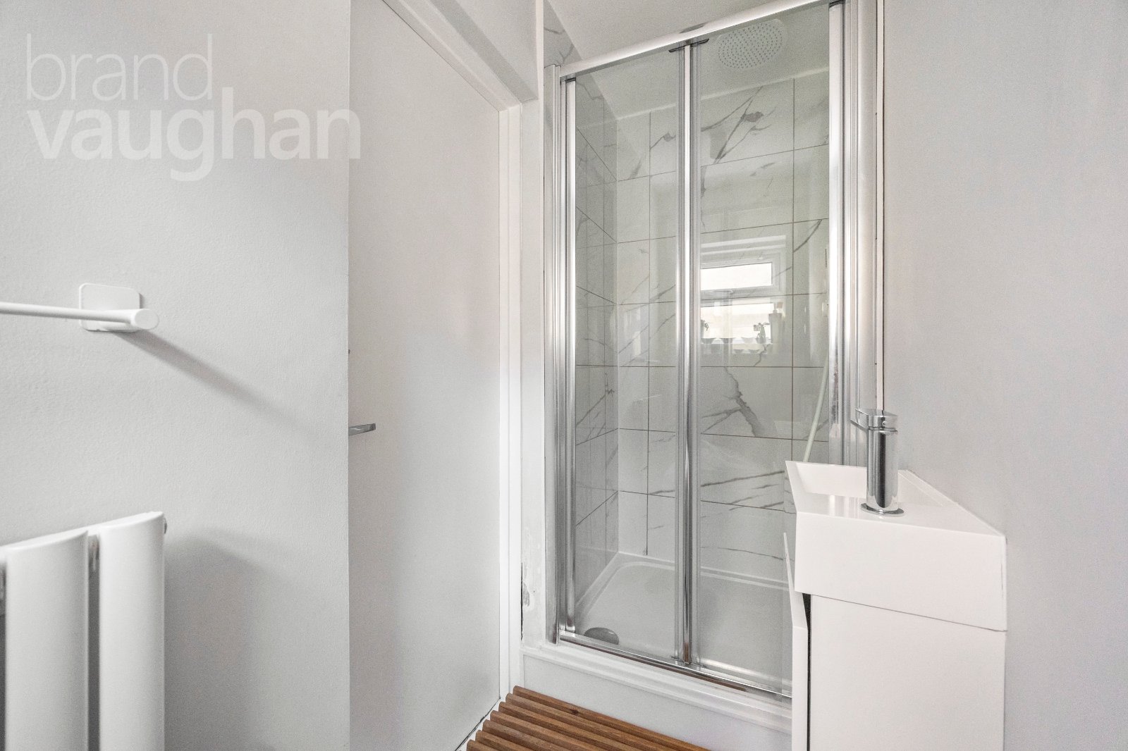 At the rear of the flat, the second bedroom – currently set up as a home office – sits next to the main modern boutique style shower room bathroom, making it ideal for guests or flexible use.