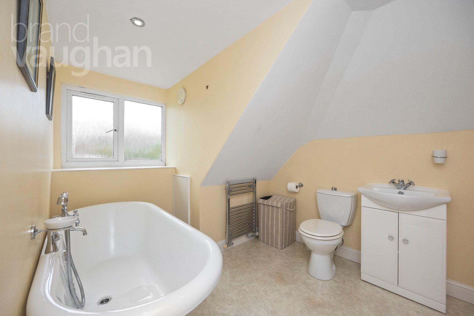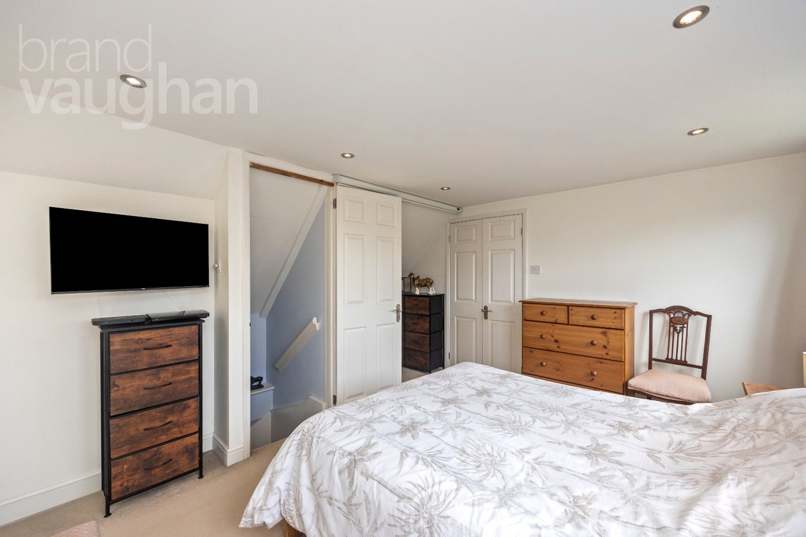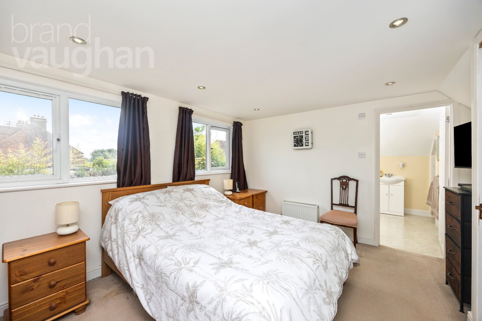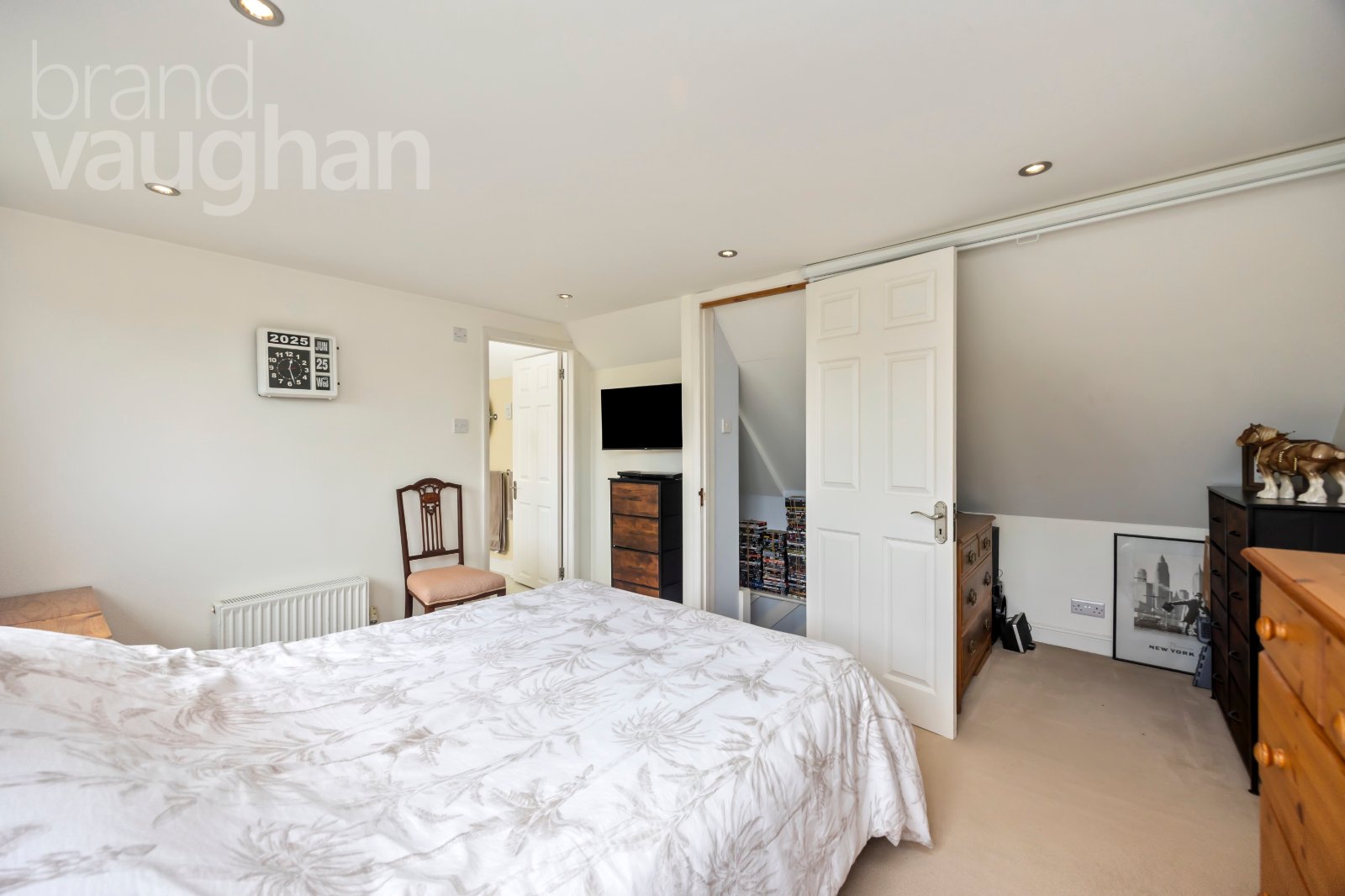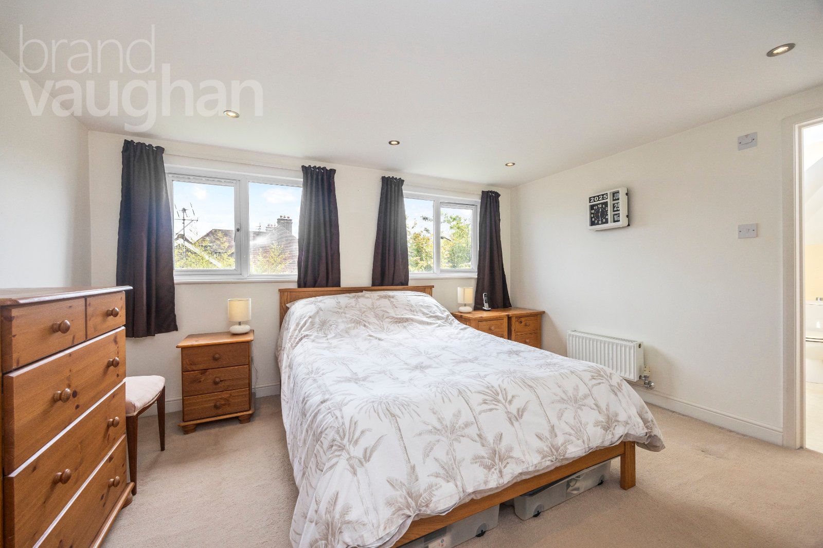 Upstairs, the crowning jewel of this discreetly luxurious home is the private principal bedroom suite. A serene sanctuary with picture perfect views over a sea of gardens, it’s easy to forget you’re just minutes from the vibrant high street – and not far from Brighton! There’s a walk in, organised closet and a glamorous en-suite large enough for a roll top bath which also has a shower attachment. There are warming rails for towels and access to a storeroom large enough for a workstation and a 2nd, spacious attic.