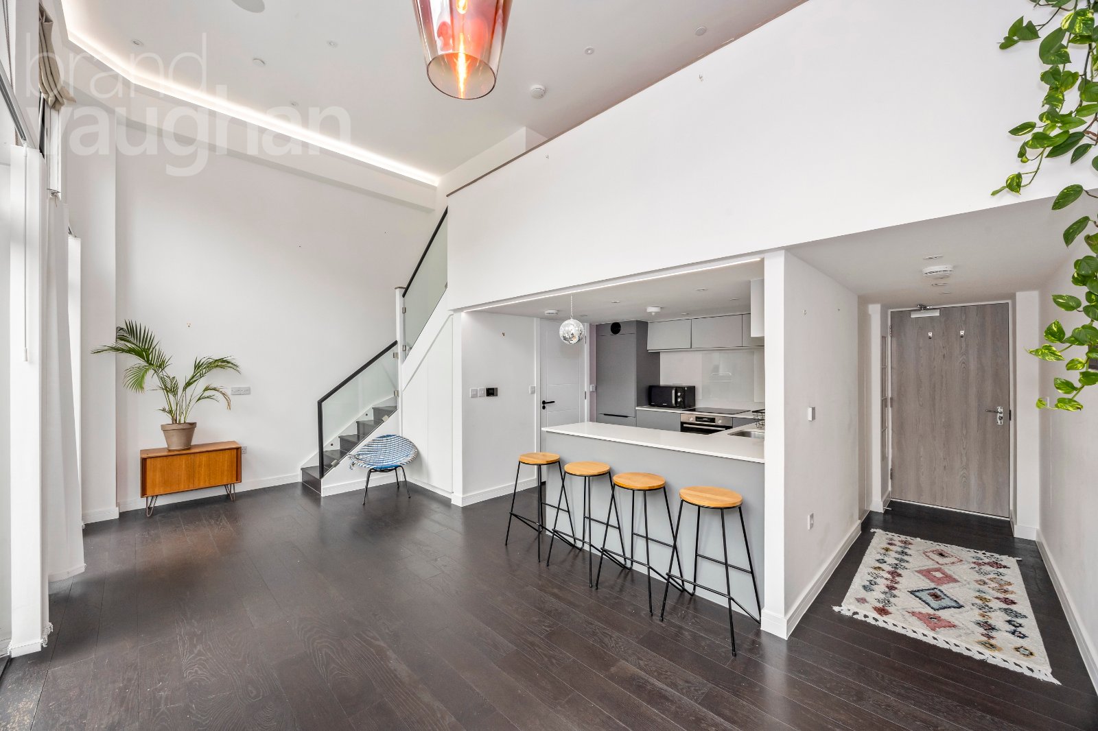 A modern staircase leads up to the mezzanine bedroom, which overlooks the living space below, giving the apartment its signature loft feel. It’s a spacious double room with fitted storage and access to a contemporary en suite bathroom, complete with a rainfall shower, smart tiling and a minimalist finish.