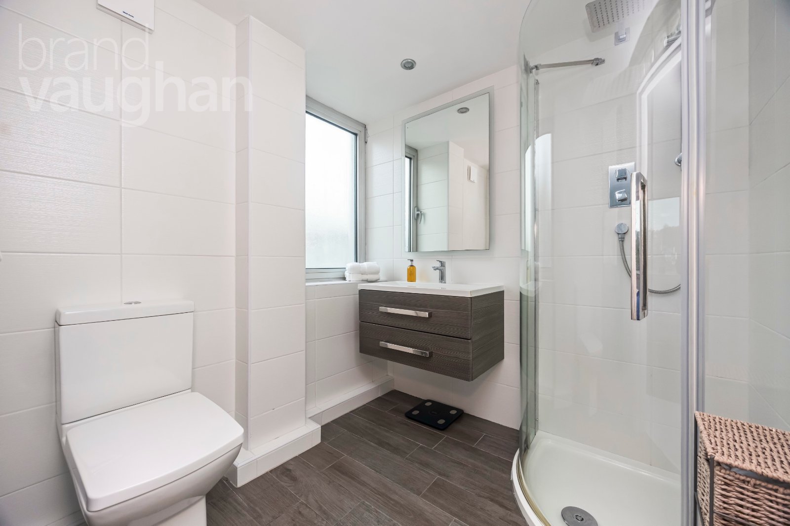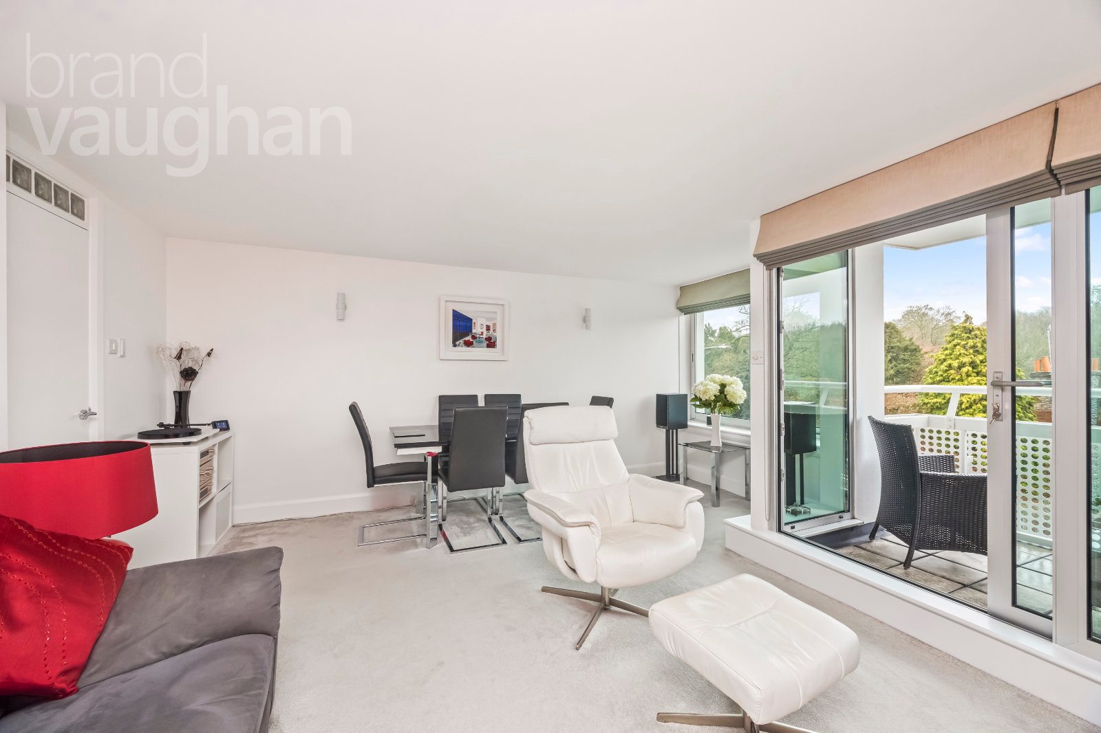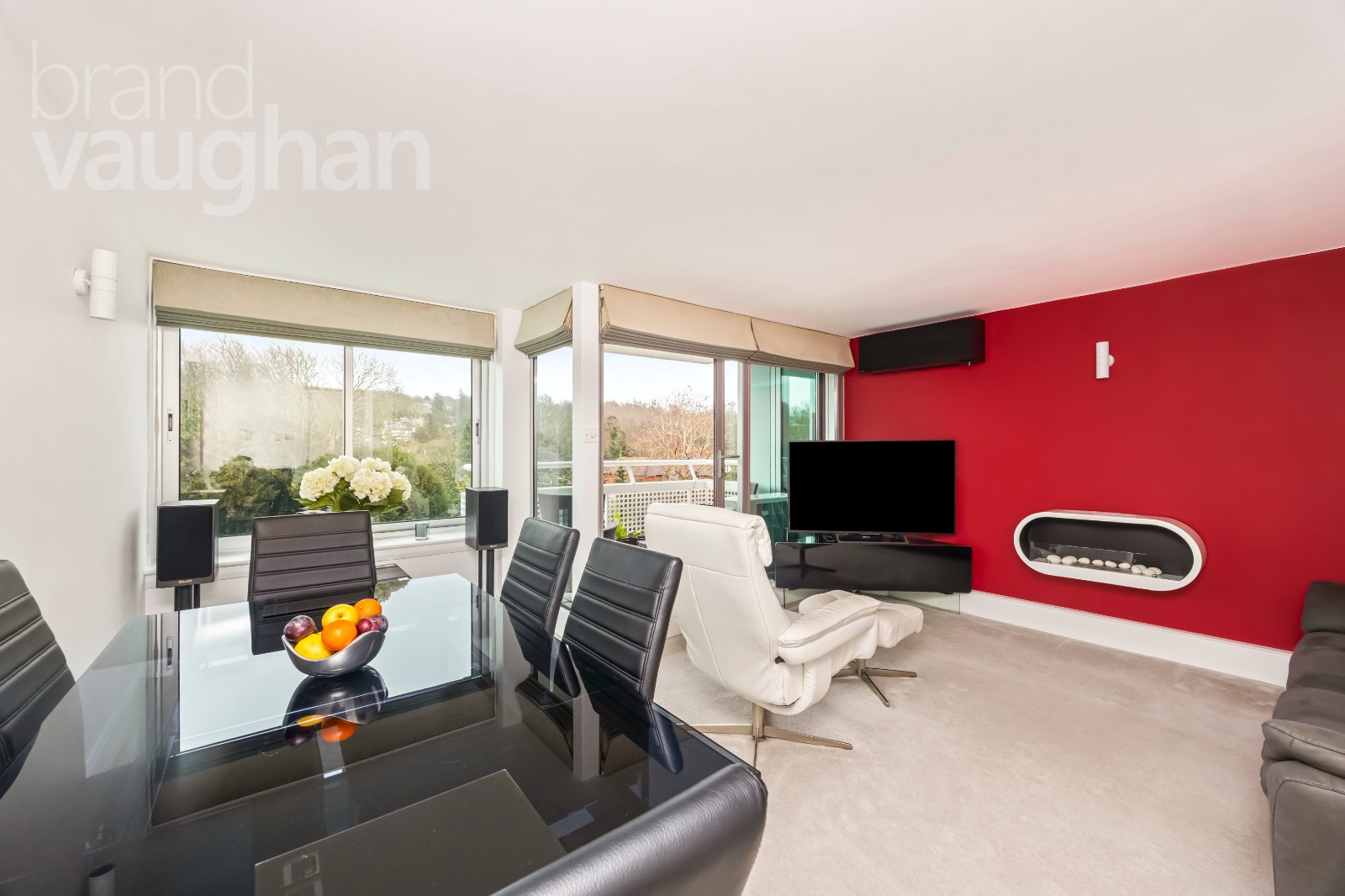 The living and dining room is a welcoming space, with a wall of double-glazed windows framing views across Withdean Park and towards Peacock Lane. There is ample room for both relaxing and dining, with doors opening onto the covered balcony, making it ideal for use throughout the year. Facing East and open to the South, the apartment enjoys plenty of natural light and changing seasonal views. Air conditioning is installed in this room, providing exceptional comfort in warmer months and a welcome luxury rarely found in properties of this type.