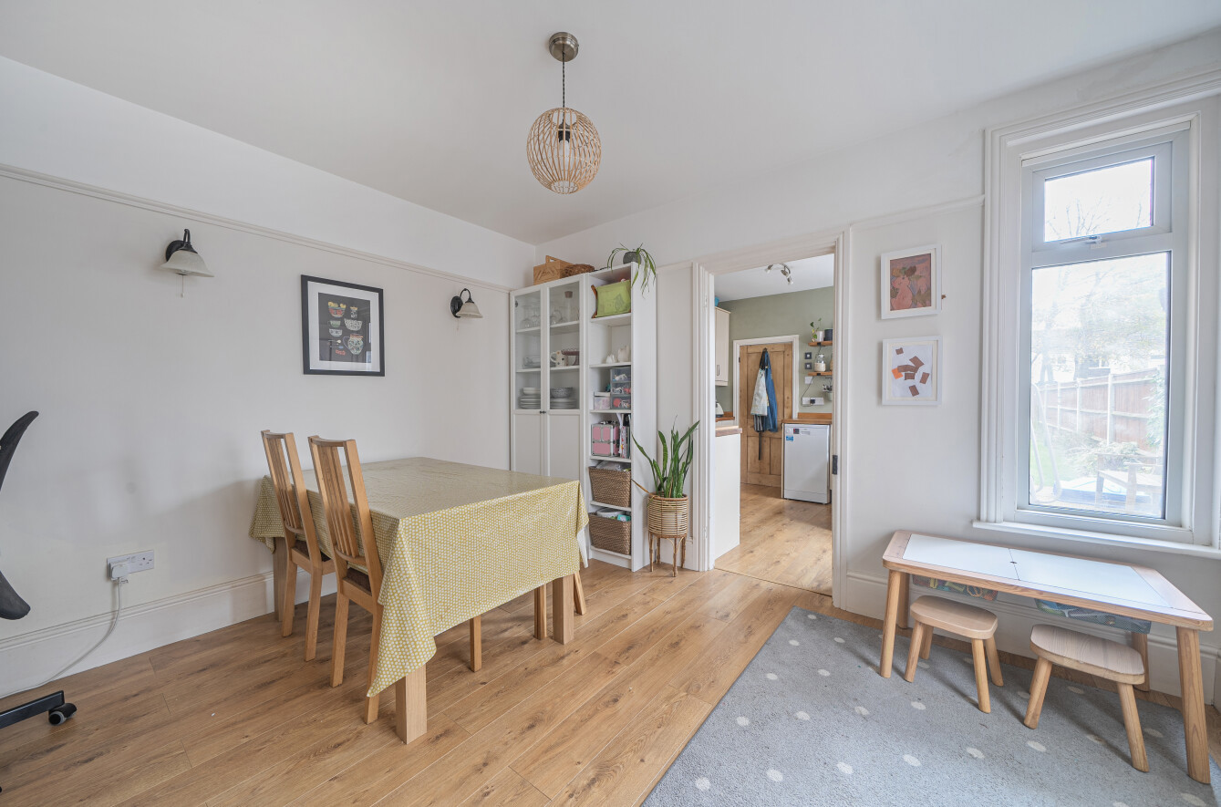 Stepping inside, the inviting lounge sits to the left, showcasing solid wood flooring and a beautiful feature fireplace that instantly sets a warm, characterful tone. To the right, the separate dining room mirrors this charm with matching wood flooring and dual-aspect windows that fill the space with natural light.