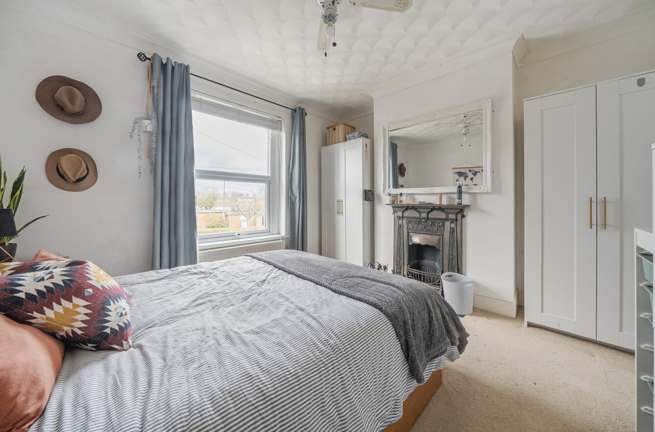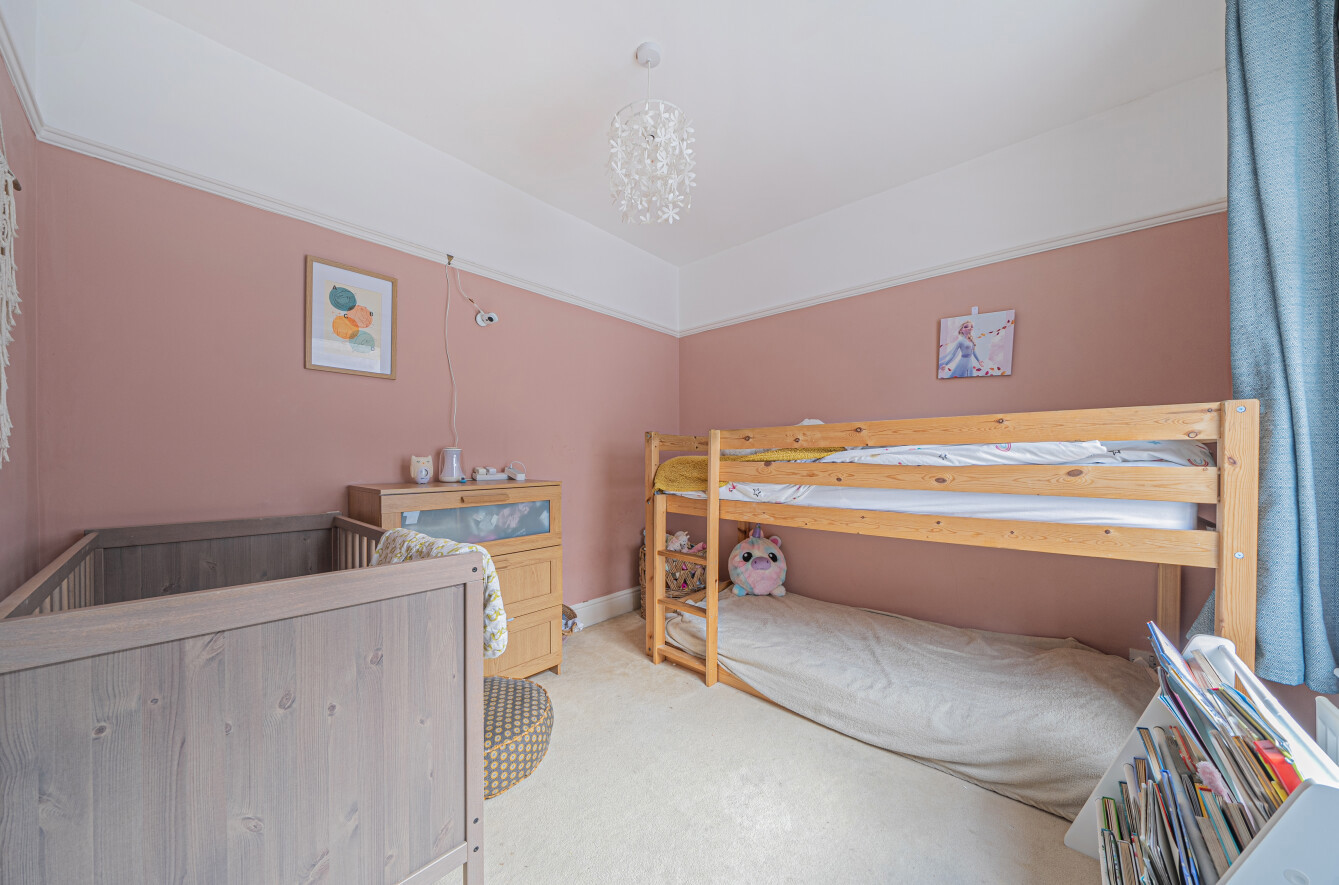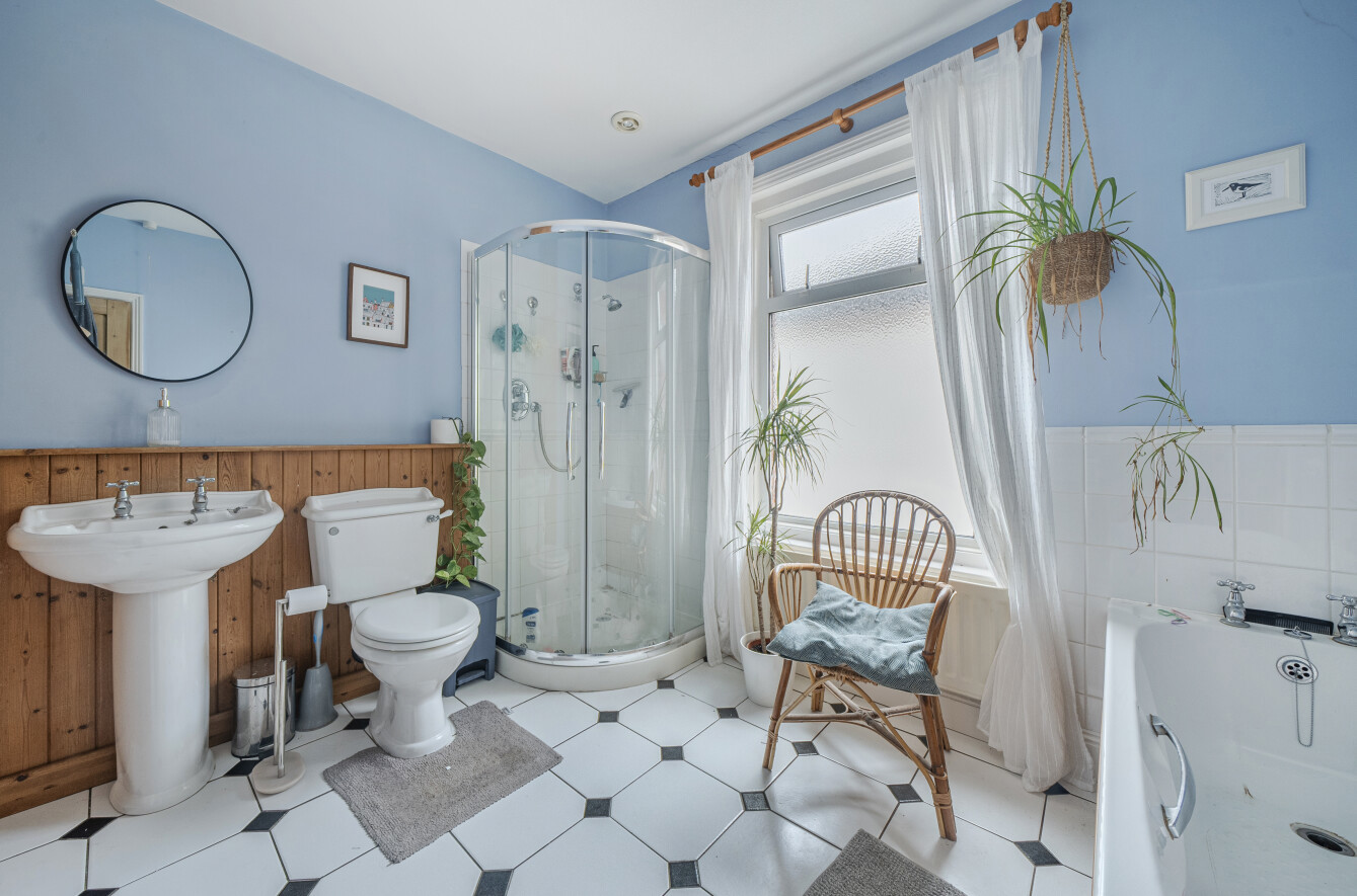 Upstairs, you’ll find two well-proportioned bedrooms, with the master offering another characterful feature fireplace. The family bathroom is also located on this floor and features a generous four-piece suite, including a corner shower enclosure, panelled bath, low-level W.C. and pedestal sink.