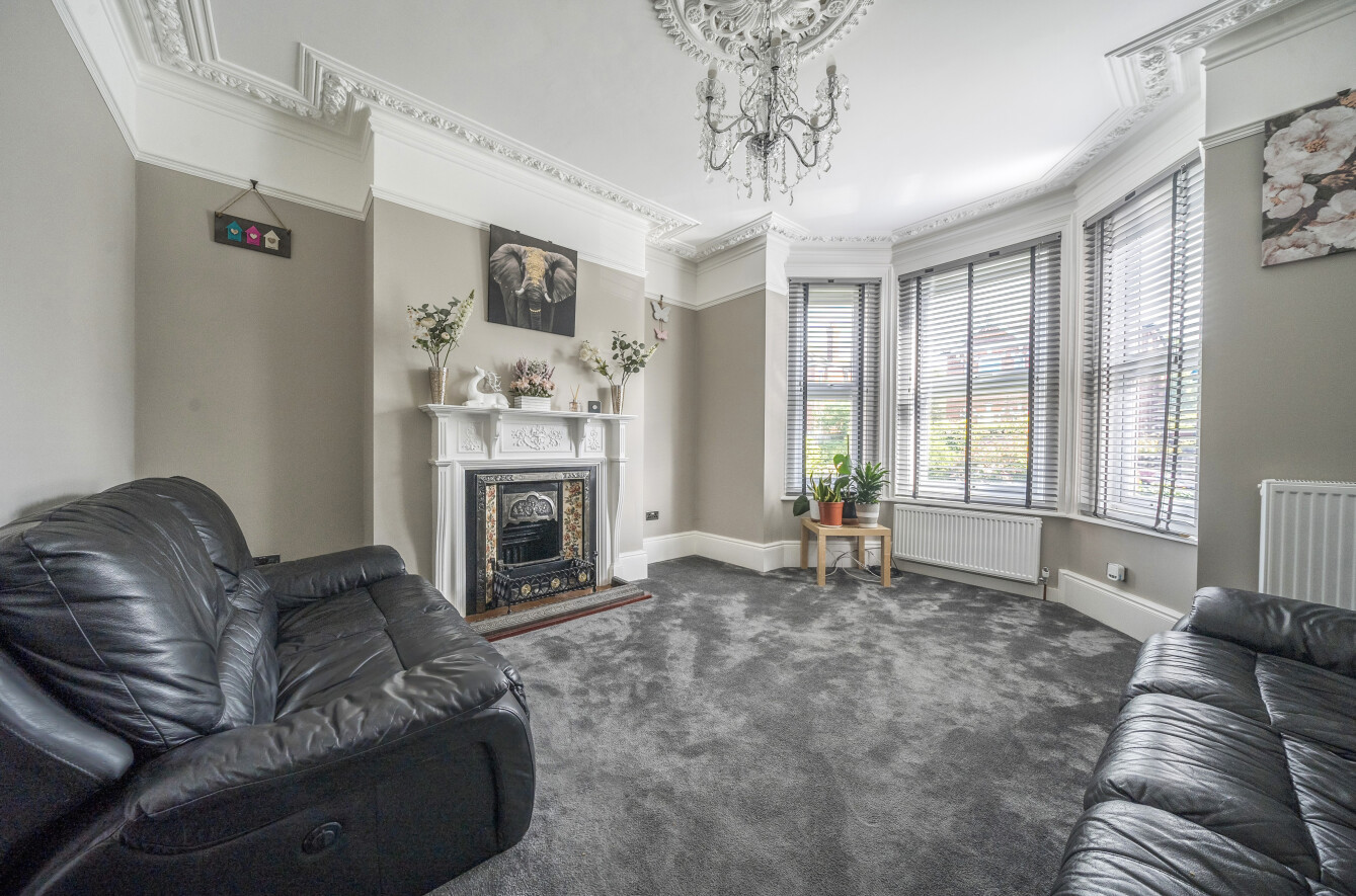 The third reception room oozes natural light from two double-glazed windows facing the front, engineered oak wood flooring, and built-in storage.