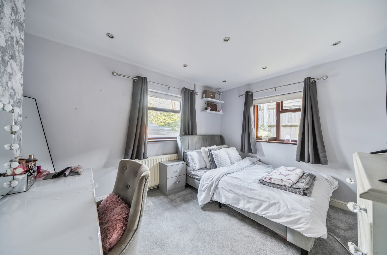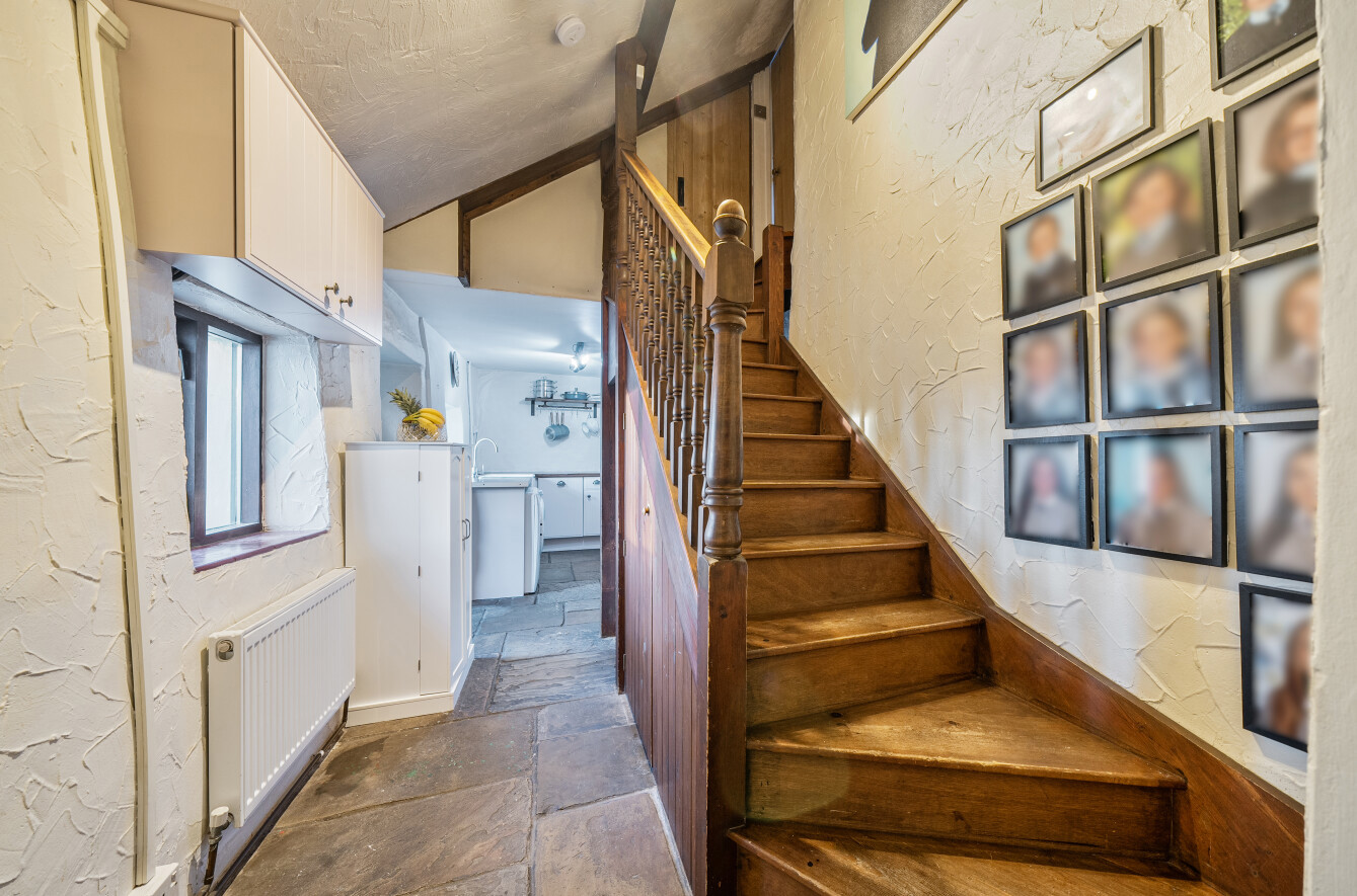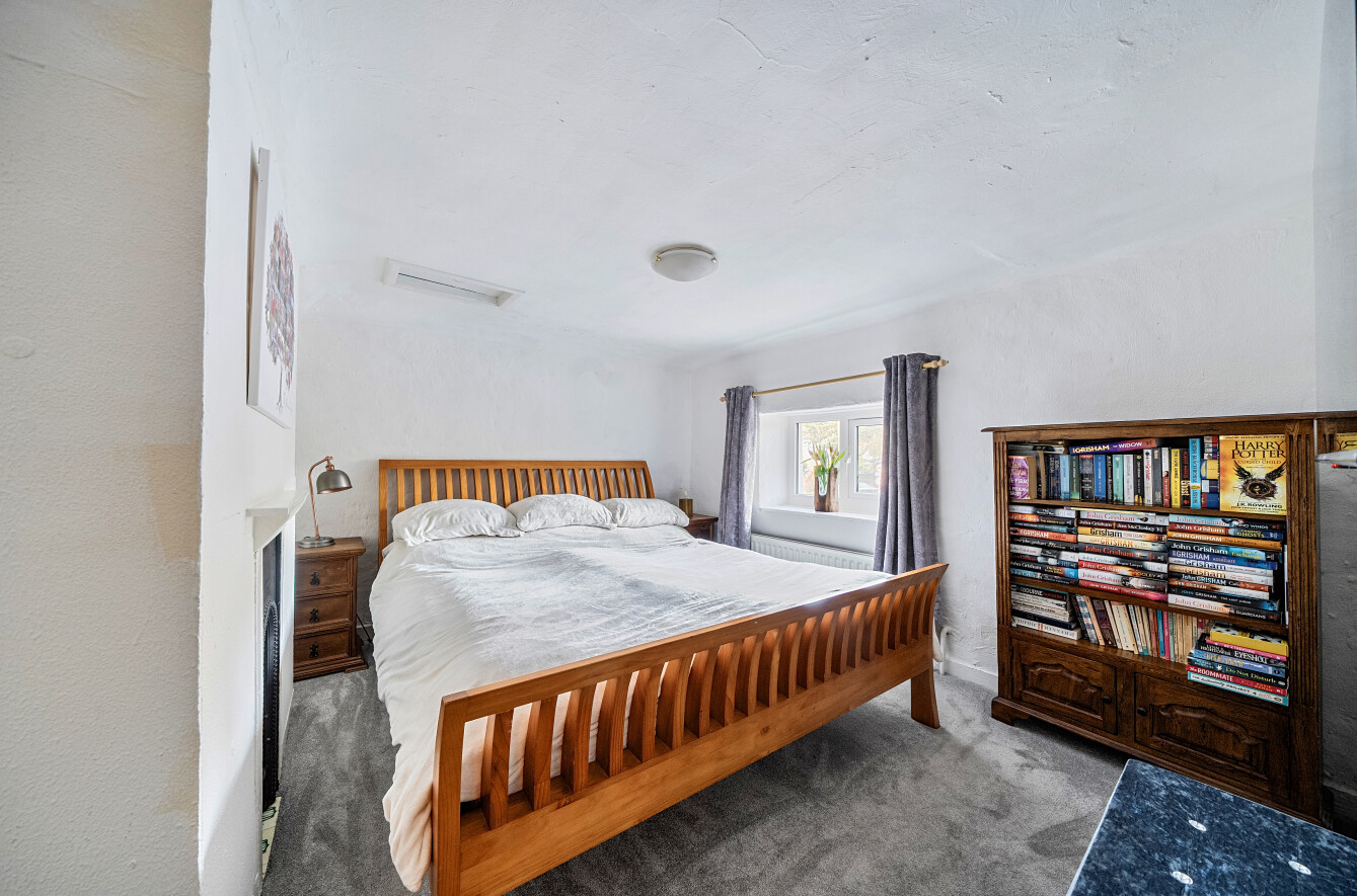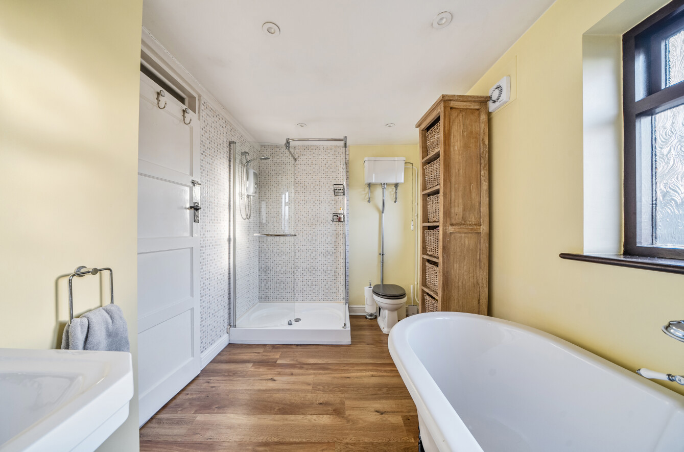 The ground floor features a well-appointed galley-style kitchen with an abundance of white wall and base units complemented by wooden worktops, providing excellent preparation space for everyday cooking. The spacious living and dining room forms the hub of the home, enhanced by a cosy open fireplace. Also on this level are two well-proportioned double bedrooms, offering flexible living arrangements, along with a charming four-piece family bathroom comprising a roll-top bath and a separate walk-in shower.