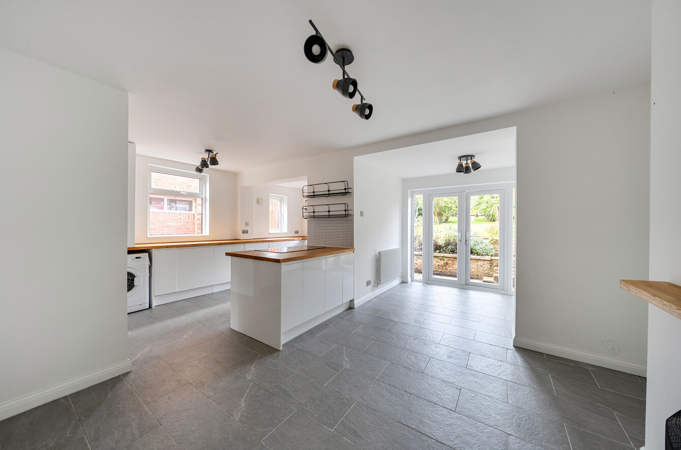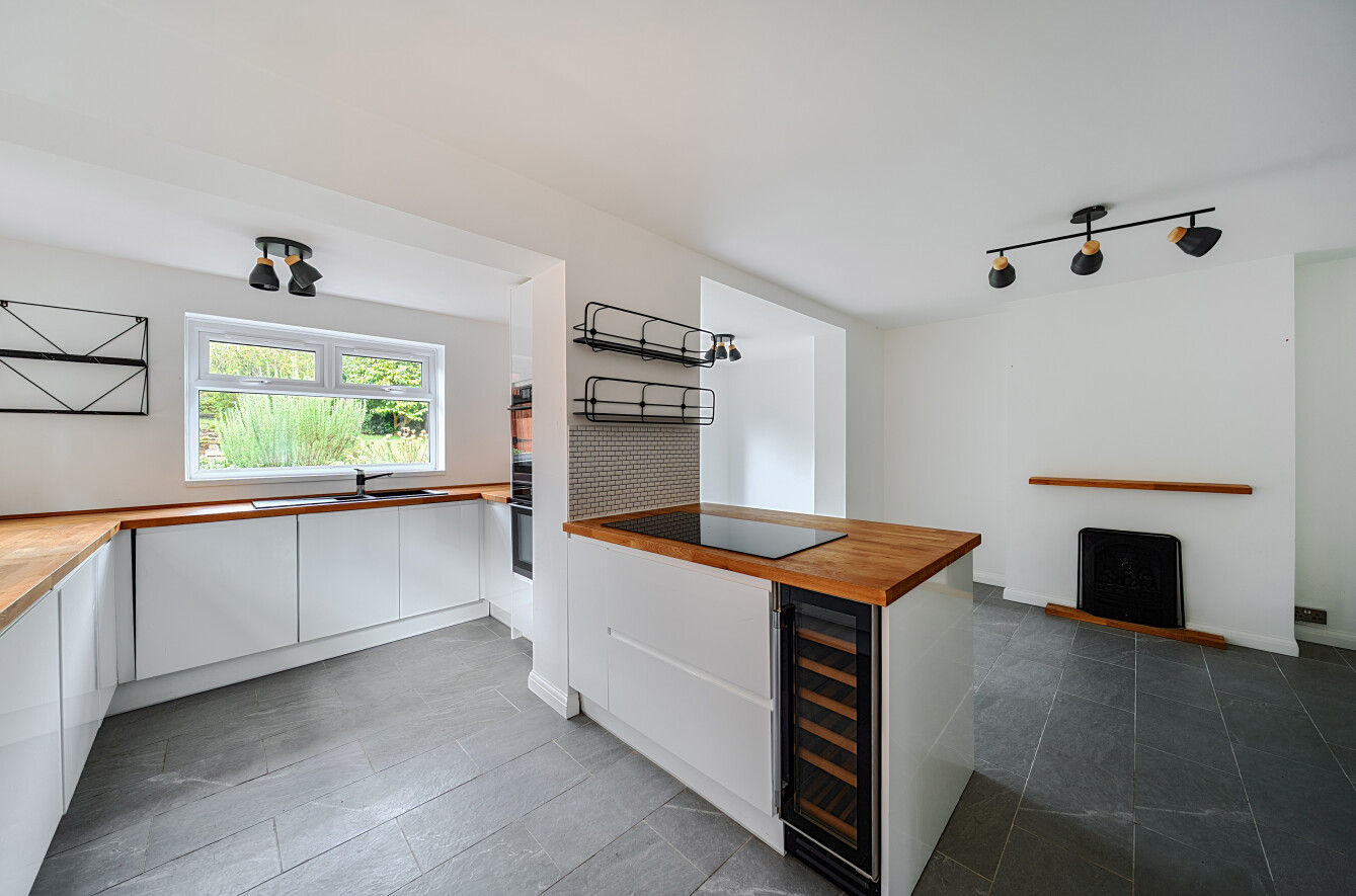 To the rear of the property, the hallway opens into an impressive open-plan kitchen, dining, and living area. Designed with both style and practicality in mind, the kitchen boasts elegant shaker-style units, extensive worktop space, and a handy breakfast bar, ideal for relaxed mornings or entertaining guests. There's ample room for a dining table, making it a versatile hub for both everyday living and formal occasions. Completing the ground floor accomodation is a useful cloakroom.