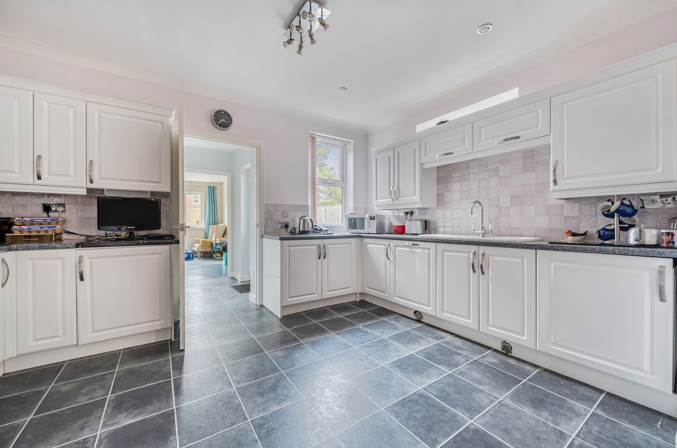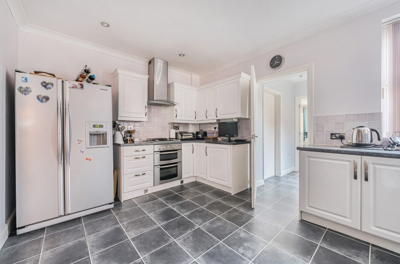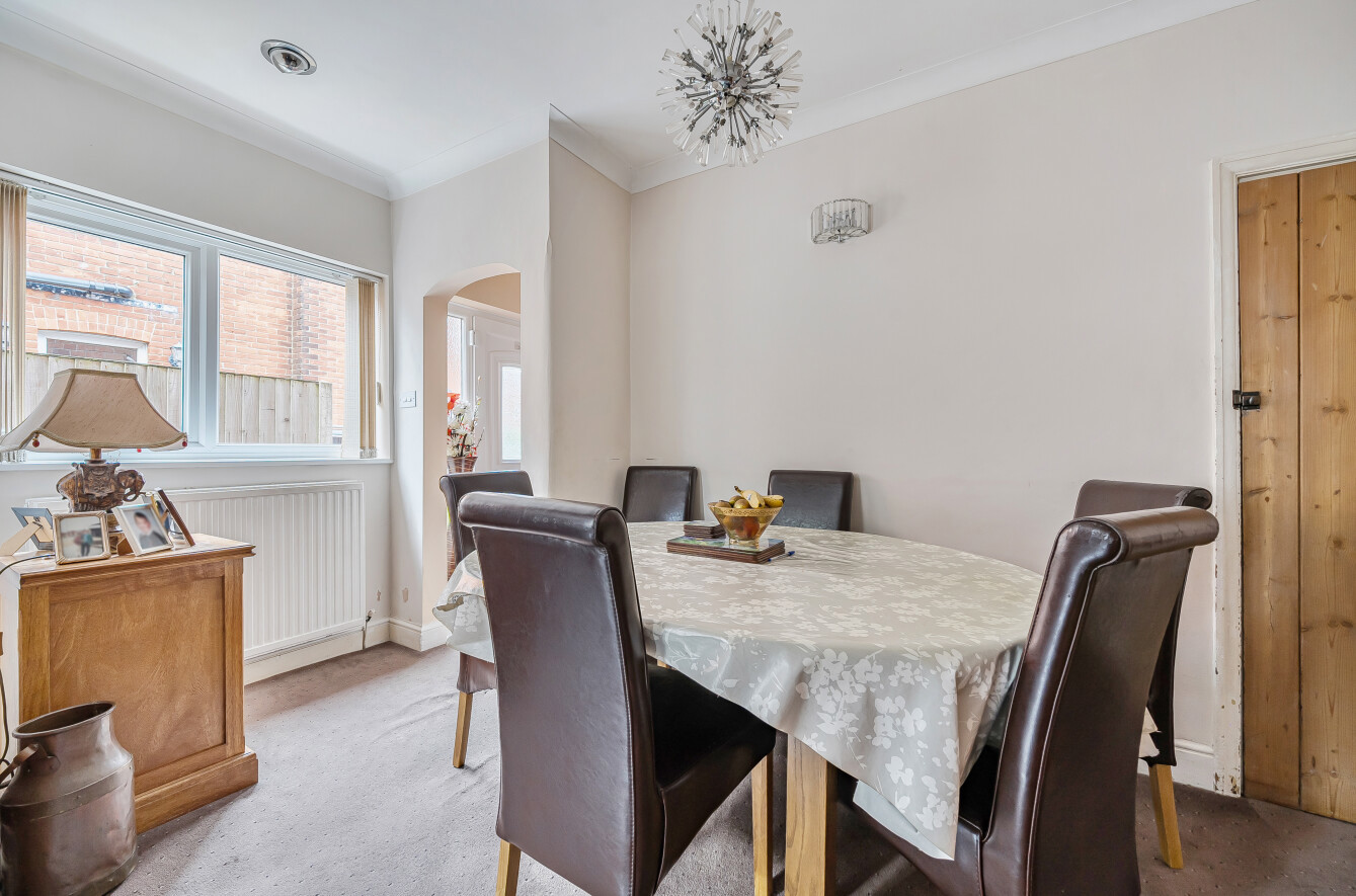 To the rear, a second reception room currently used as a dining area opens seamlessly into the spacious kitchen. The kitchen is both stylish and practical, boasting a comprehensive range of wall and base units complemented by ample work surfaces, perfect for everyday cooking and entertaining.