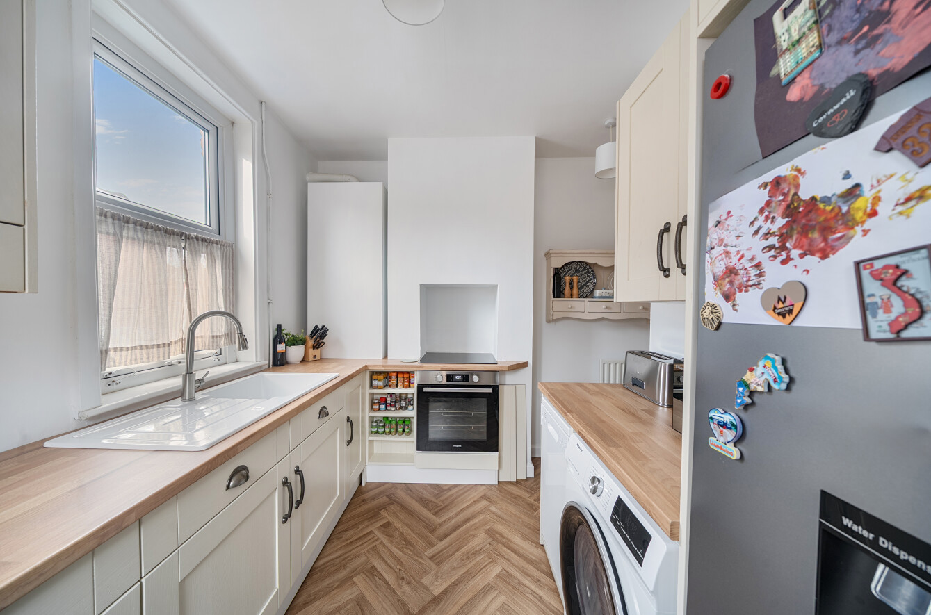At the heart of the home is the inviting sitting/dining room, a versatile and welcoming space ideal for both relaxed family evenings and entertaining guests. A charming bay window allows natural light to flood the room, complemented by an attractive feature fireplace that adds warmth and character. The newly fitted kitchen is well appointed, offering generous worktop space and an abundance of storage, perfectly suited to meet all culinary needs.