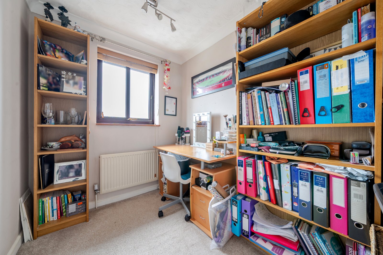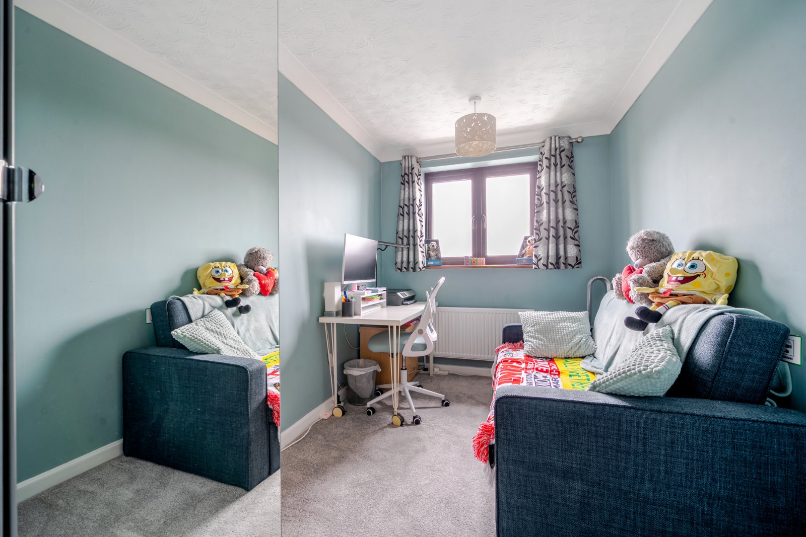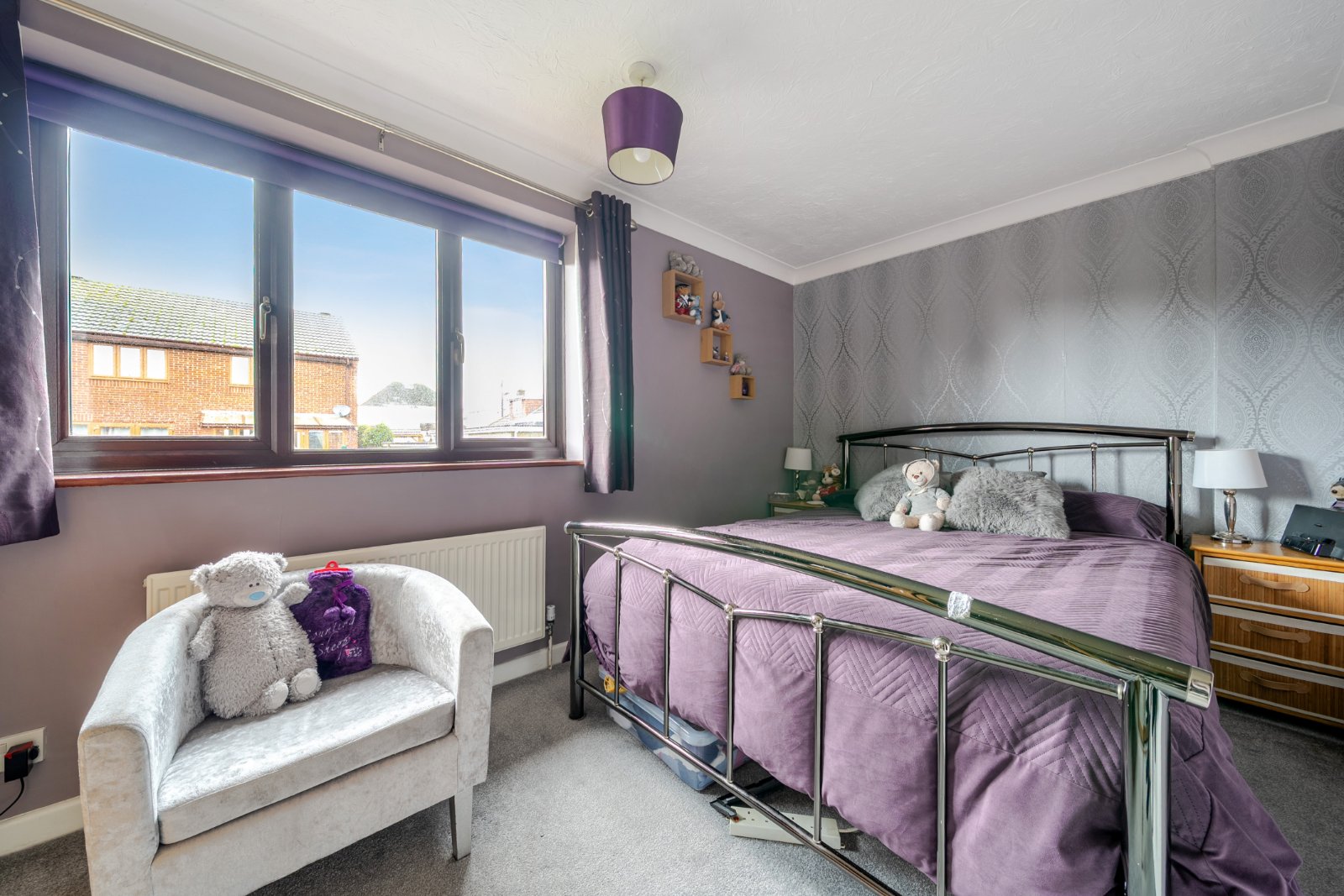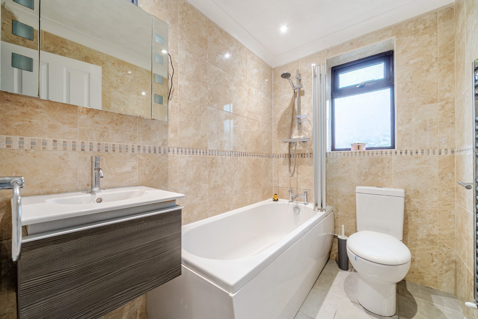 The first floor comprises three well-proportioned bedrooms, all served by a contemporary family bathroom. The bathroom is fitted with a modern three-piece suite, neutral tiled walls, a wash basin, and a shower over the bath.