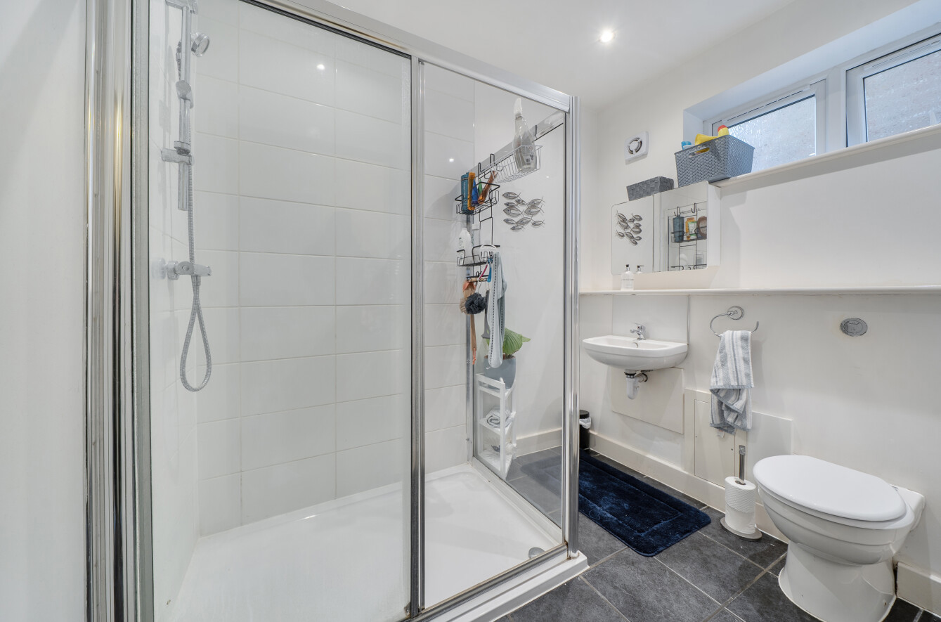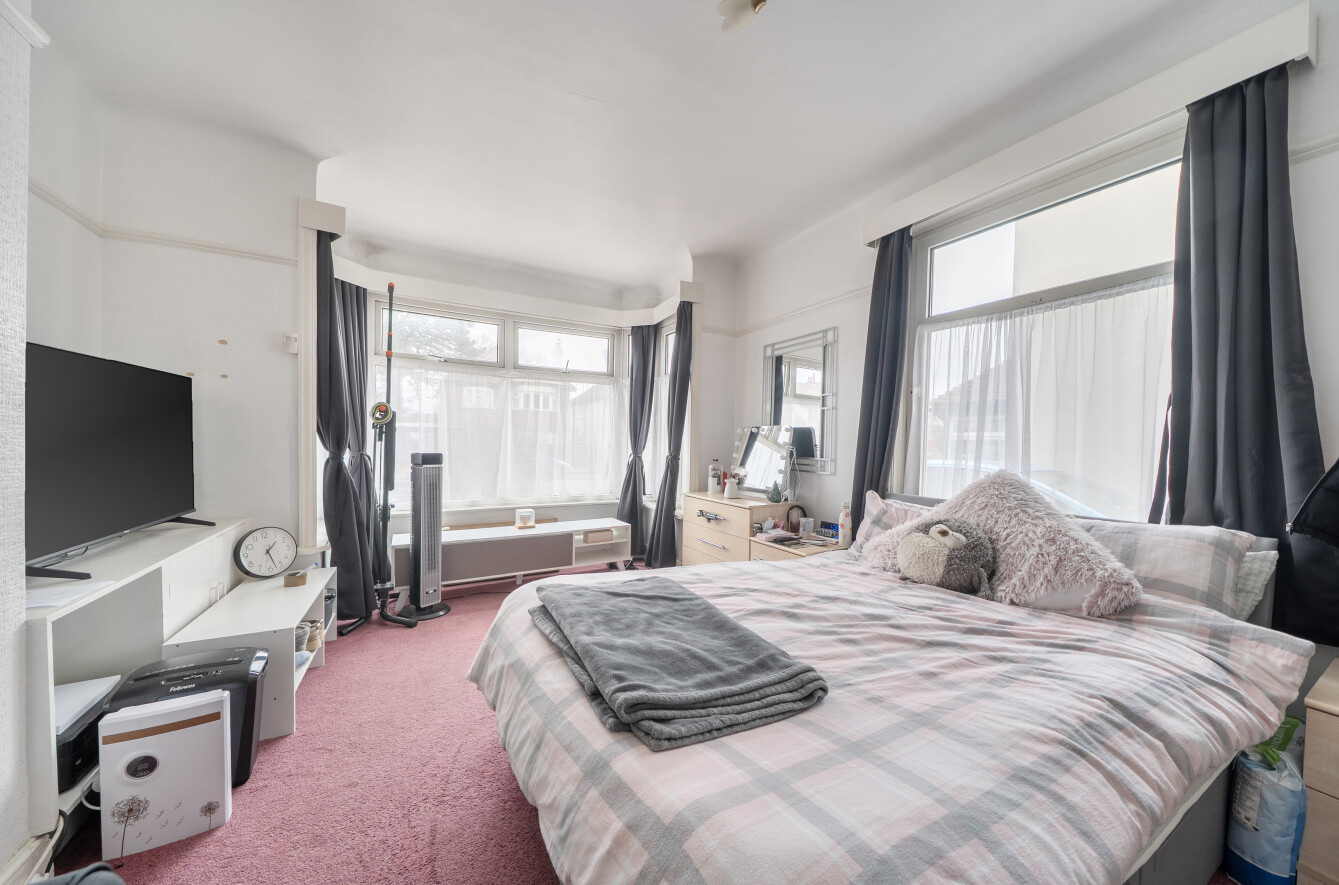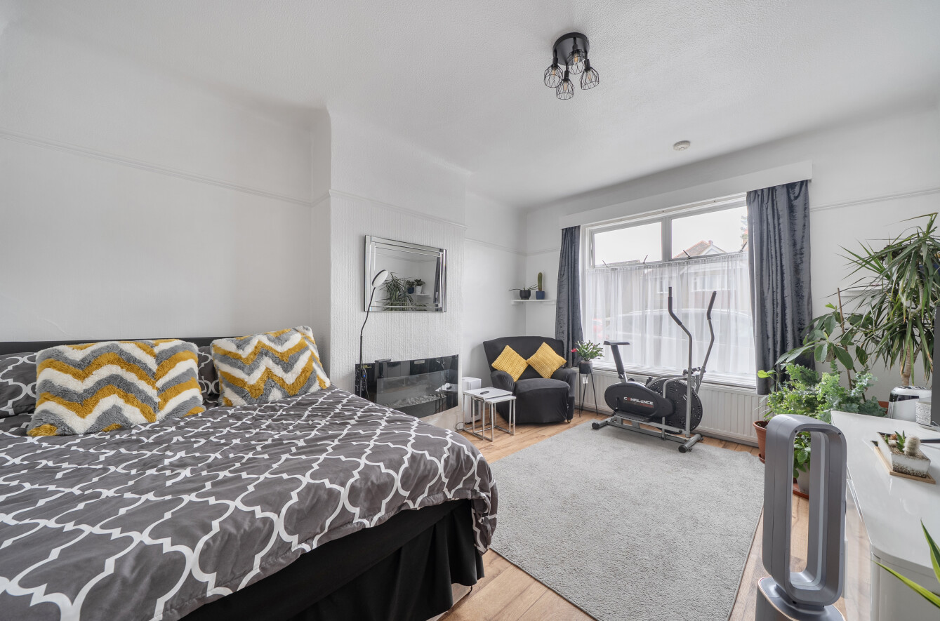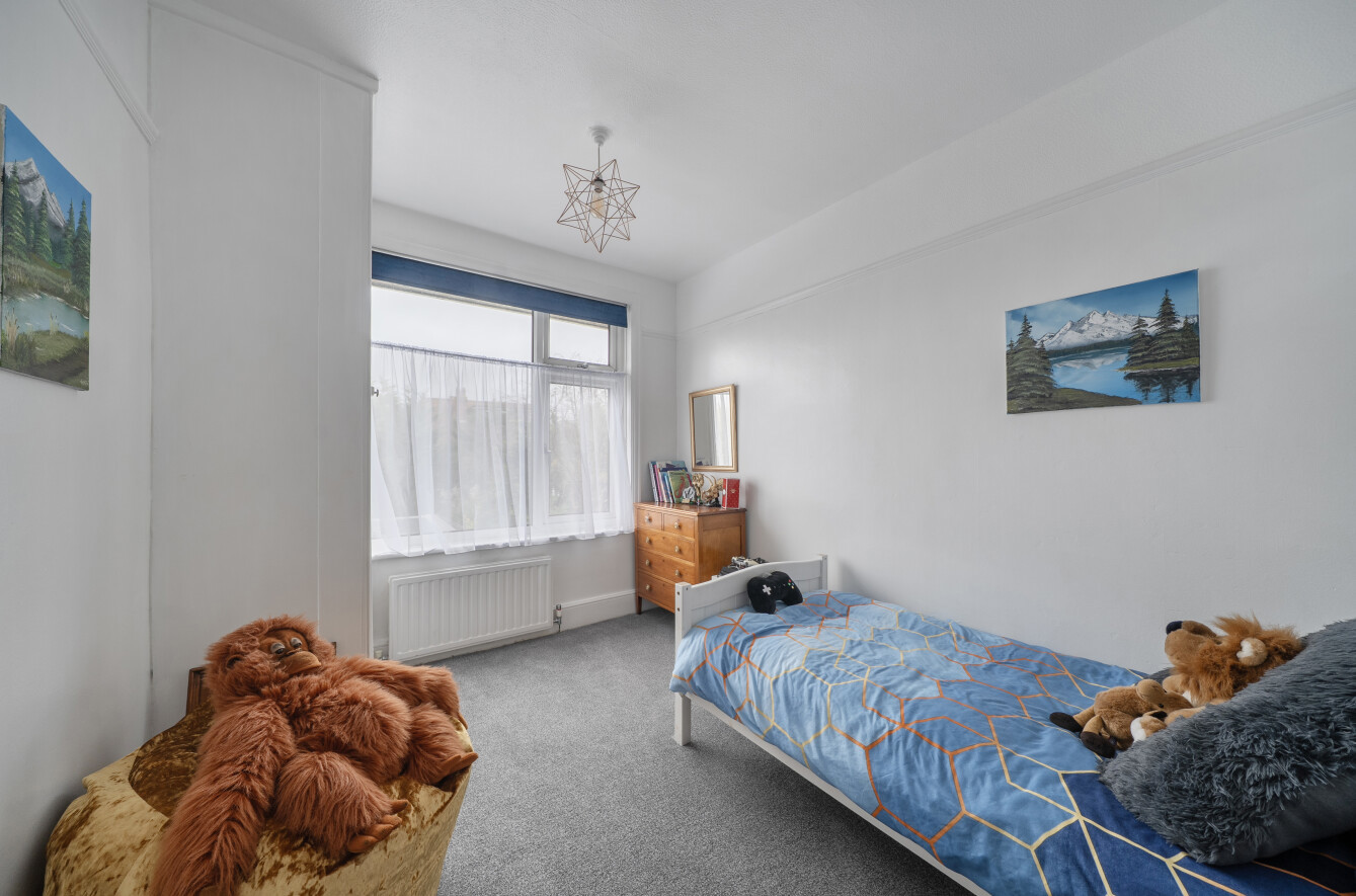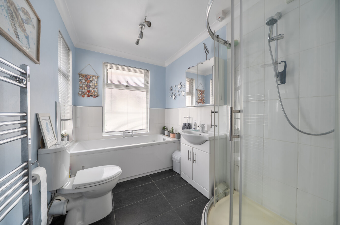 Upstairs, a spacious landing gives access to all three bedrooms, each a comfortable double. The principal bedroom, positioned at the front of the home, features a charming bay window and ample space for freestanding furniture. The family bathroom is fitted with a four-piece suite, including a separate bathtub and a walk-in shower.