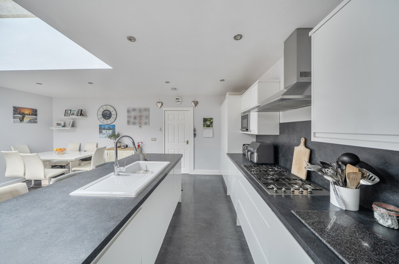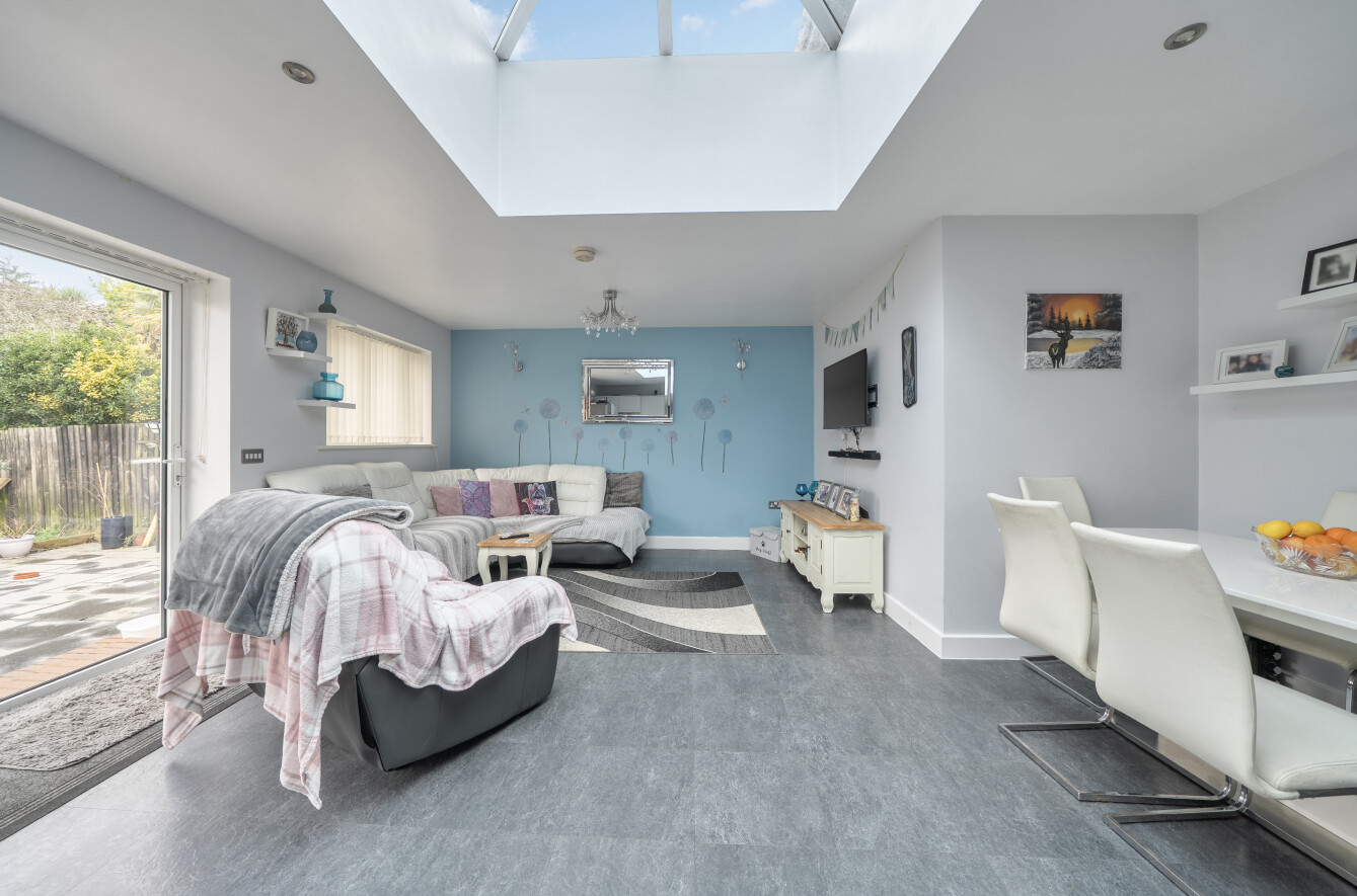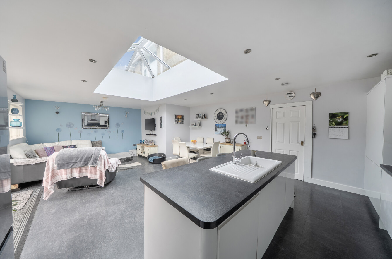Undoubtedly the heart of the home is the extended open-plan kitchen and living space. Thoughtfully designed for modern living, it features bi-fold doors opening onto the rear garden and a central breakfast island that provides a superb social hub for entertaining. There is ample space for a dining table, perfect for more formal gatherings with family and friends. The kitchen itself offers an extensive range of worktop surfaces along with plentiful wall and base units to accommodate all culinary needs.