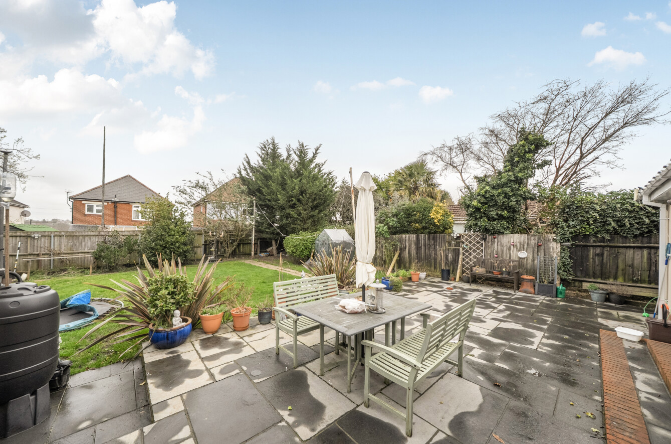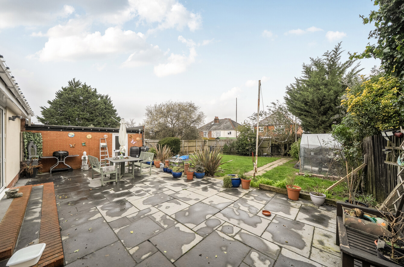 To the rear, the property enjoys a generously sized, sunny garden. An upgraded, expansive patio area provides the perfect setting for al fresco dining, complemented by a well-maintained lawn and side access to the garage, which benefits from power and additional storage.