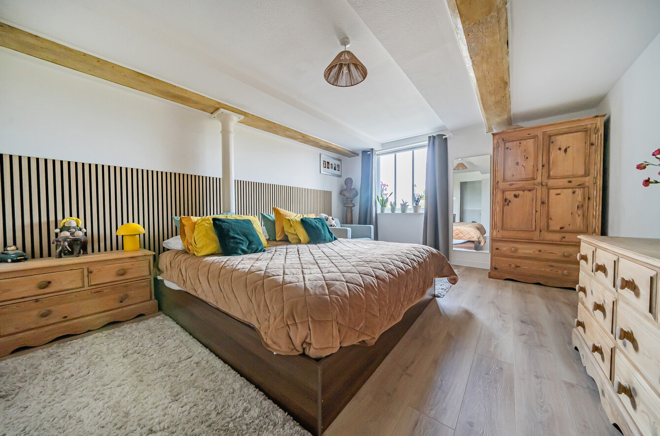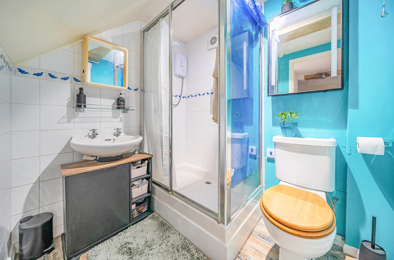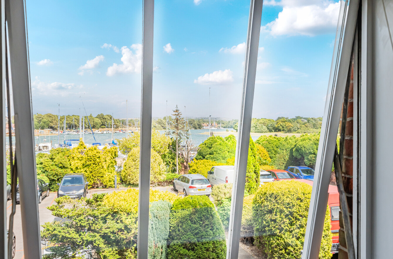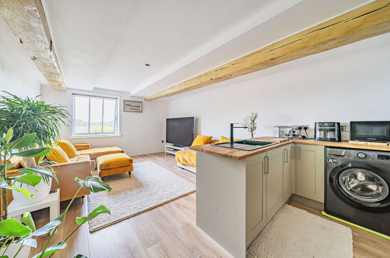A staircase leads to the first floor where the impressive 20'5 lounge awaits – a beautifully proportioned space featuring exposed beamwork and panoramic views across the creek. The adjacent contemporary shower room is stylishly appointed and easily accessed from the bedroom. Further benefits include a secure communal entrance with intercom, allocated parking, additional visitor spaces, and access to well-maintained communal gardens.