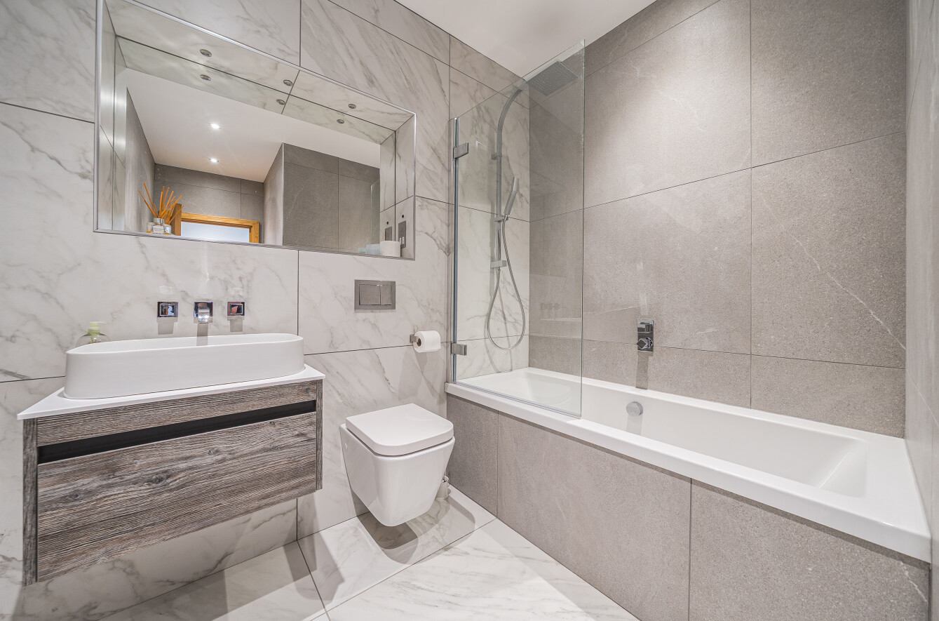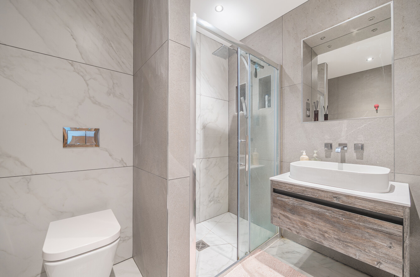 Upstairs, the first-floor sitting room opens onto a private balcony, while the additional bedrooms—each featuring bespoke wardrobes—offer both comfort and style. Subtle lighting, Italian tiling, and thermal extraction systems enhance the home’s serene and contemporary aesthetic.