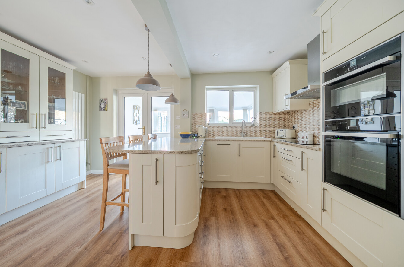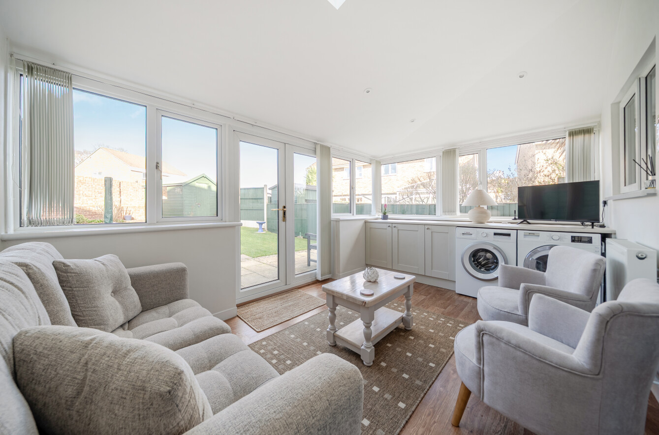 A standout feature is the extended conservatory with a Guardian solid roof and skylight window, offering an attractive additional reception area that enjoys excellent natural light and views over the garden. The beautifully fitted kitchen with quartz worktops is well designed with an extensive range of units, a breakfast bar for informal dining, and a selection of built-in and integrated Neff appliances, making it both stylish and functional. To the front aspect, the generous sitting room provides a comfortable and welcoming space for relaxation and entertaining.
