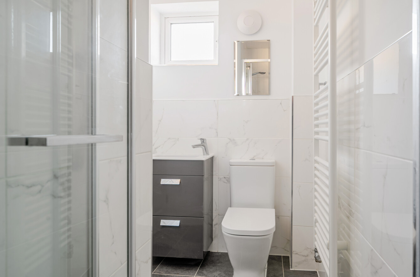 Upstairs, both bedrooms are generous doubles with fitted wardrobes, ensuring excellent storage. The master bedroom boasts a smart en-suite shower room, and the second bedroom is served by a beautifully finished family bathroom with a contemporary suite and heated towel rail. Designed with comfort and ease in mind, the first floor provides a calm retreat ideal for professionals, couples, or small families.
