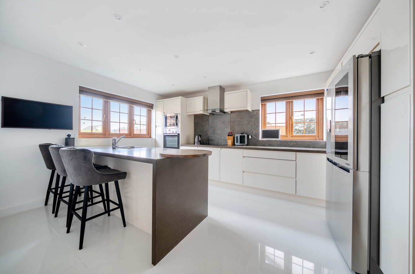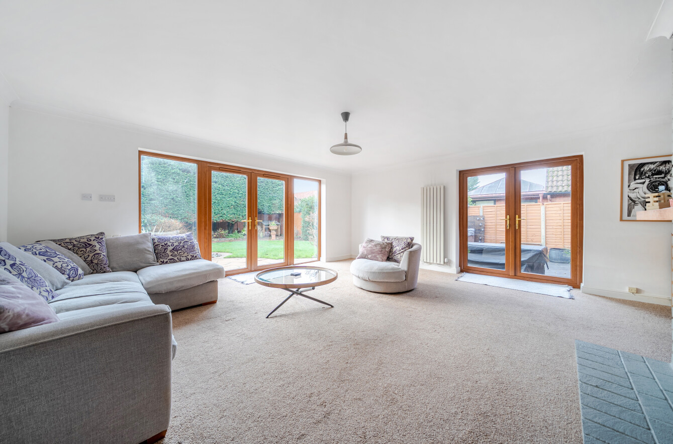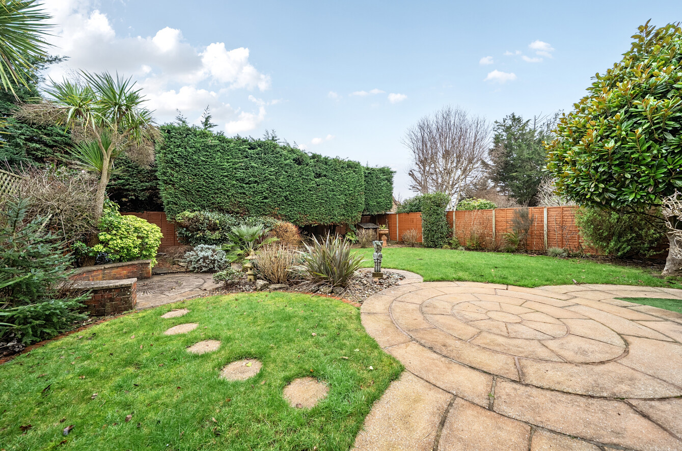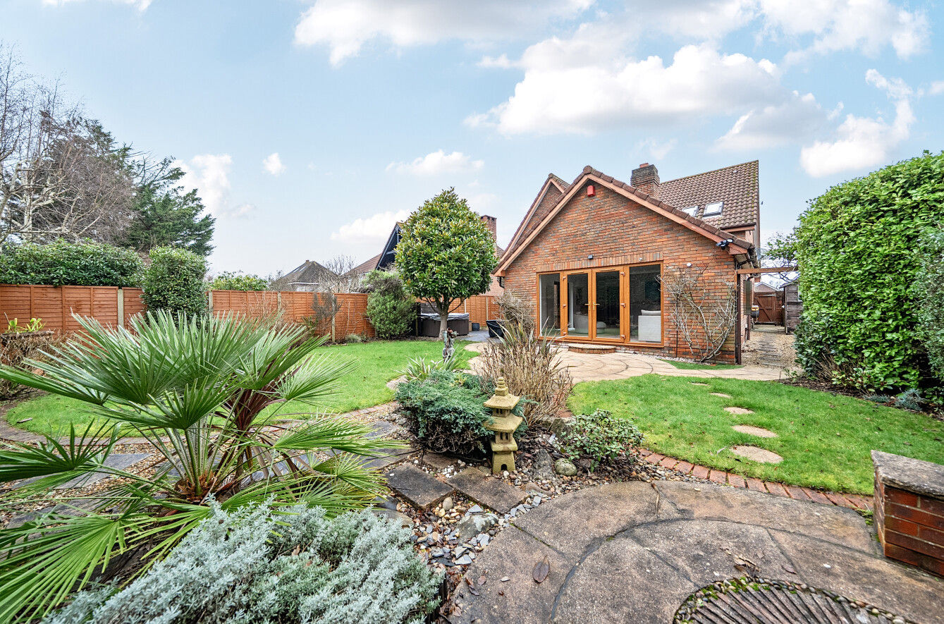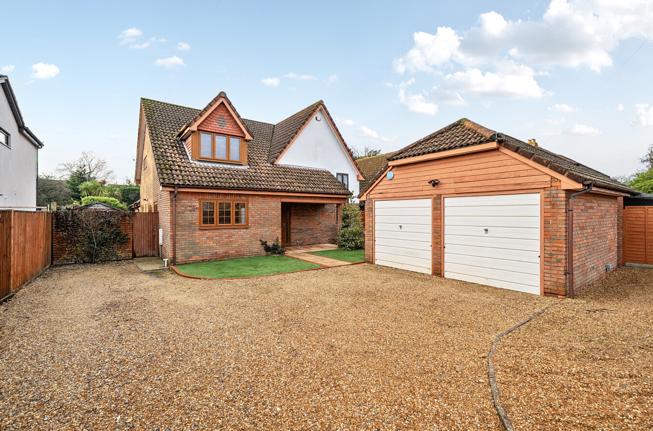 Outside, the south-facing garden is a particular highlight, professionally designed to create an attractive and private setting with terraces, lawns and mature planting. A detached pitched-roof double garage sits alongside ample driveway parking for multiple vehicles, completing a home that combines architectural interest, generous proportions and exceptional practicality in equal measure.