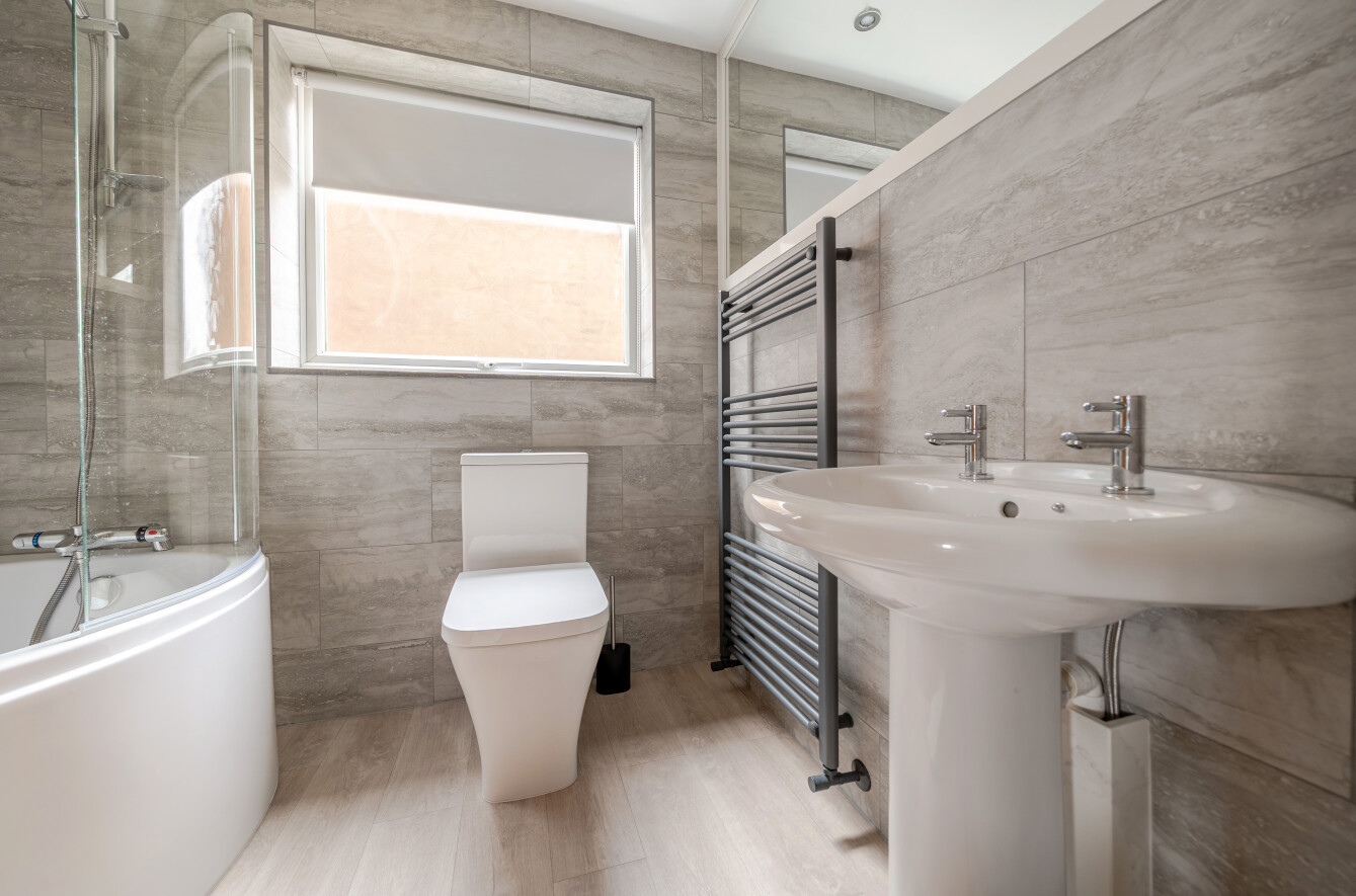 Upstairs, the property offers four well-proportioned bedrooms. The principal bedroom benefits from built-in wardrobes and is complemented by a sleek, fully tiled bathroom featuring a modern white suite.