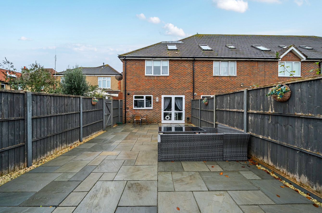 Beautifully presented three-bedroom end-terrace townhouse on sought-after Grove Avenue. Offers versatile layout with ground-floor bedroom/office, master with en-suite, top-floor bedroom and family bathroom. Features spacious lounge with Juliet balcony, modern kitchen/diner, landscaped garden, carport and parking for three cars. Not overlooked and sold with no forward chain.